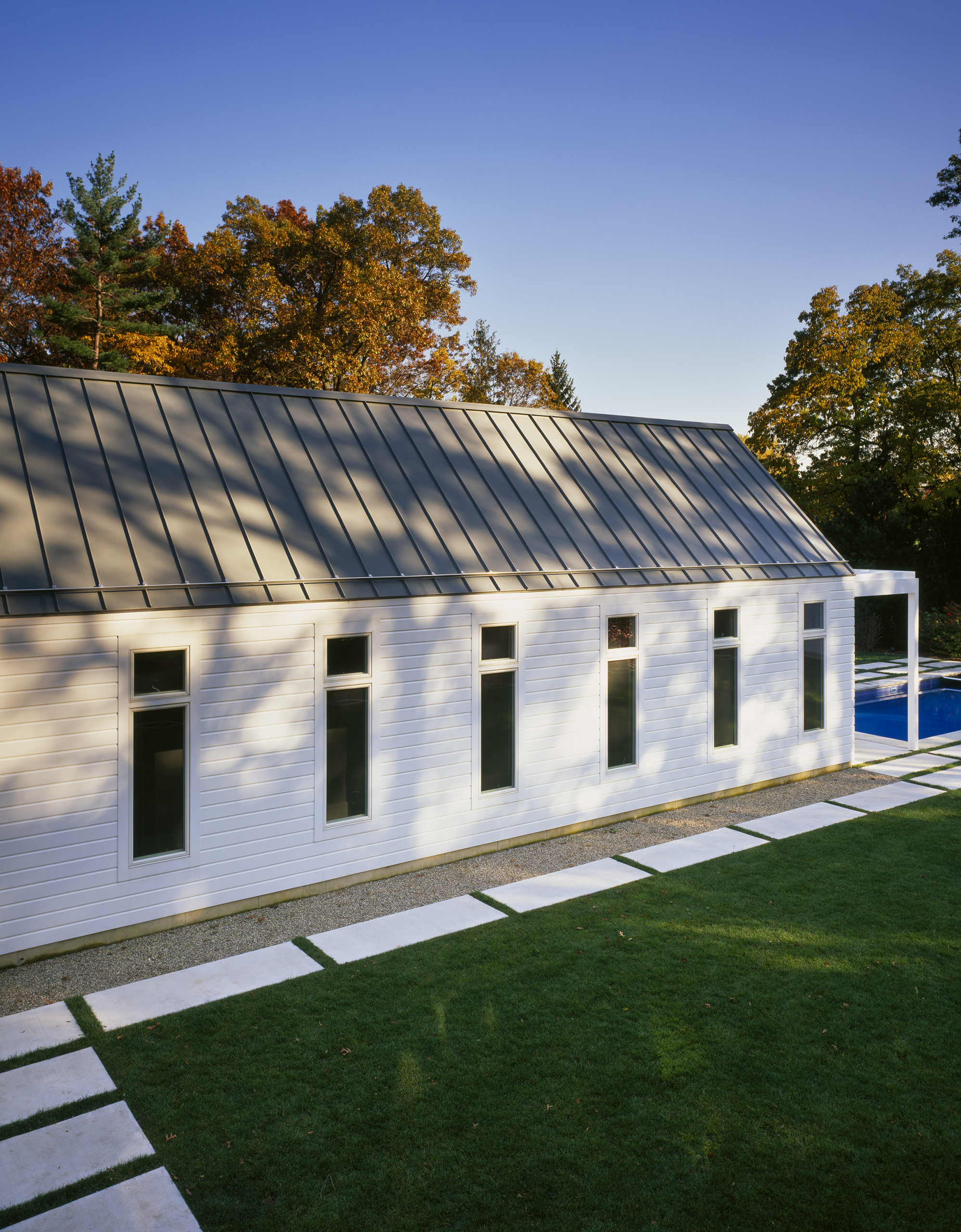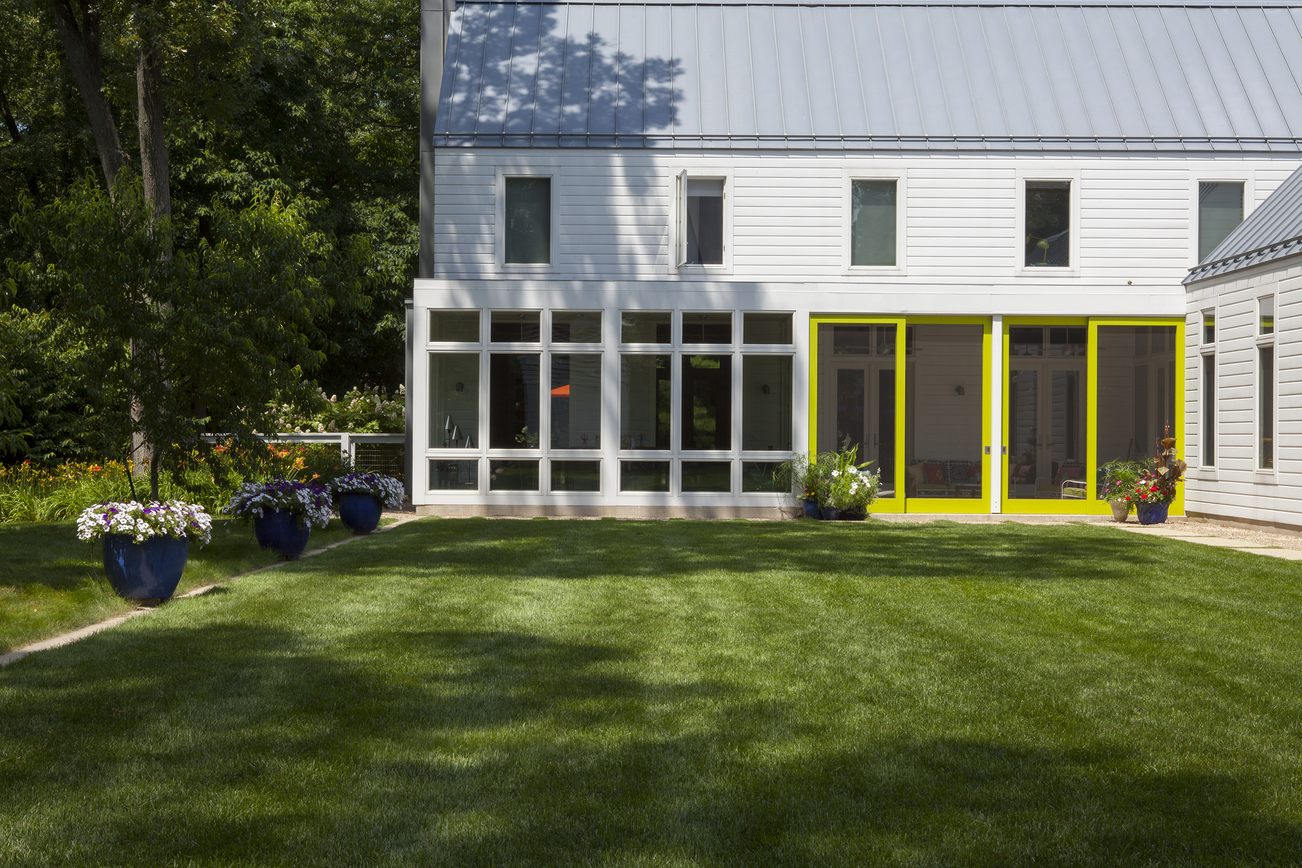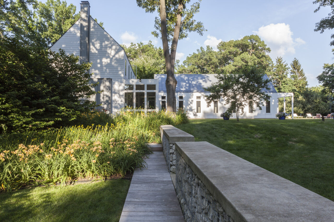 Located in southwestern Michigan, this two-story family retreat was conceived of as a series of prismatic volumes recalling traditional archetypes. The volumes are configured on the site to create distinct surrounding outdoor spaces.