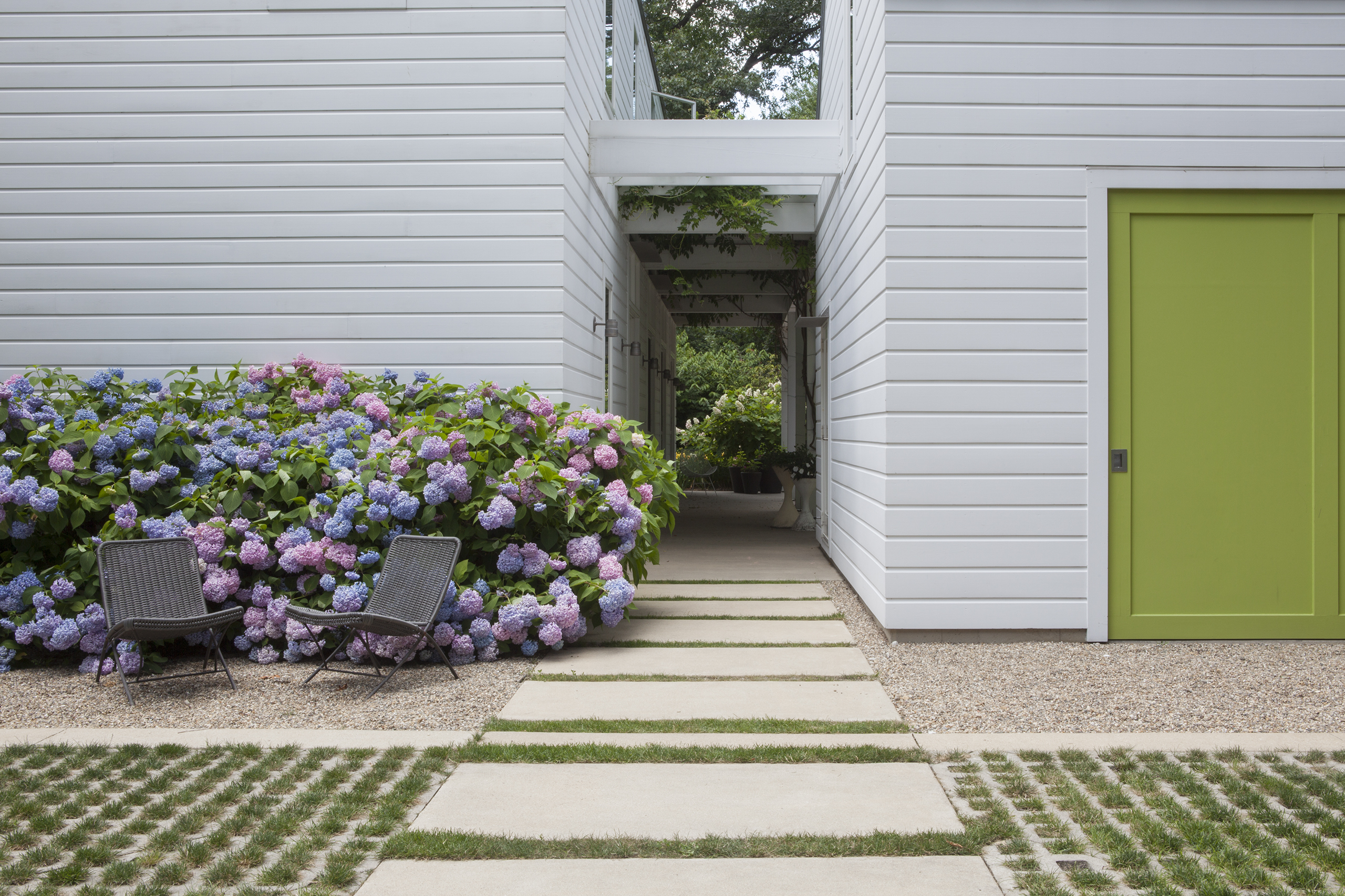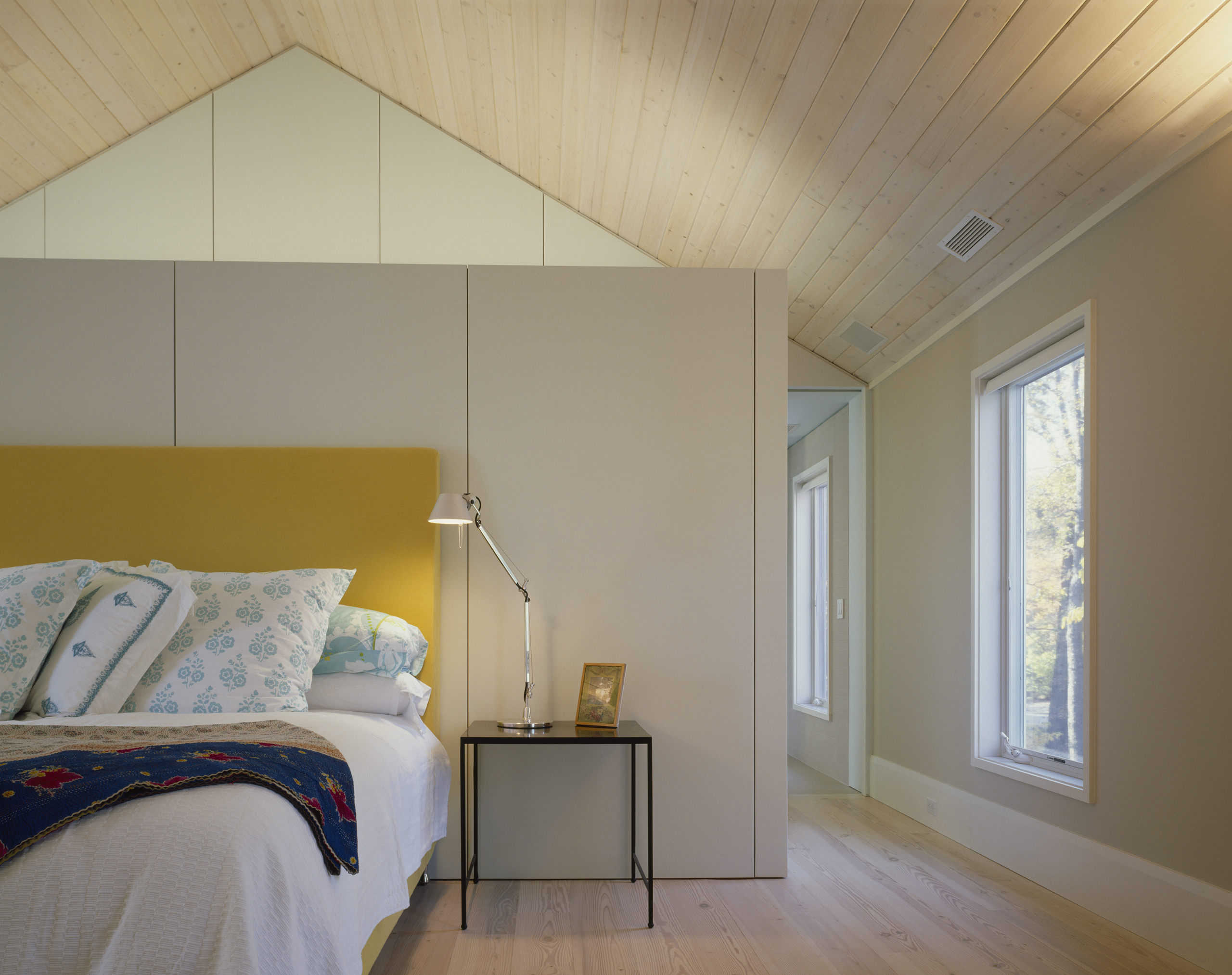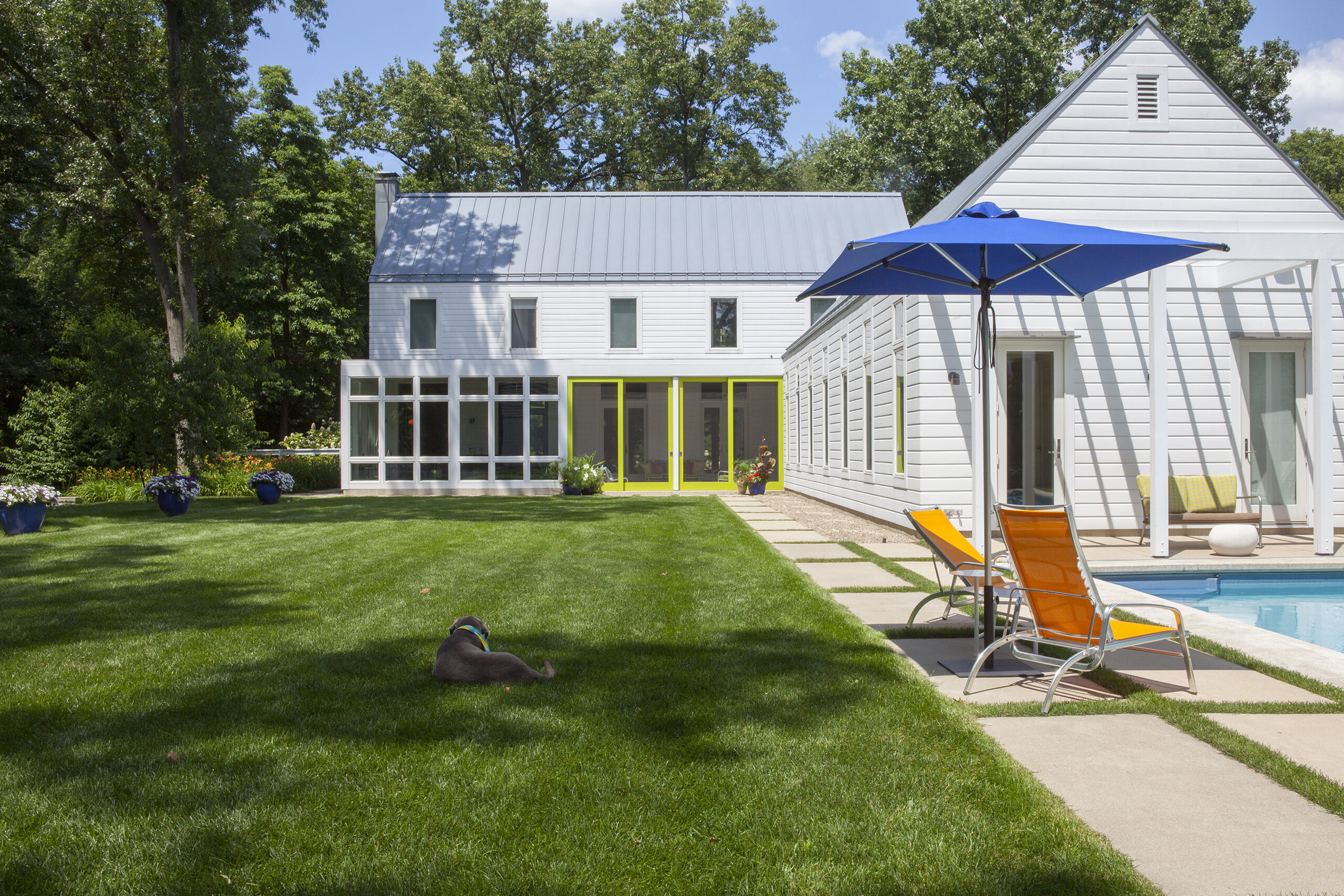 Located in southwestern Michigan, this two-story family retreat was conceived of as a series of prismatic volumes recalling traditional archetypes. The volumes are configured on the site to create distinct surrounding outdoor spaces.