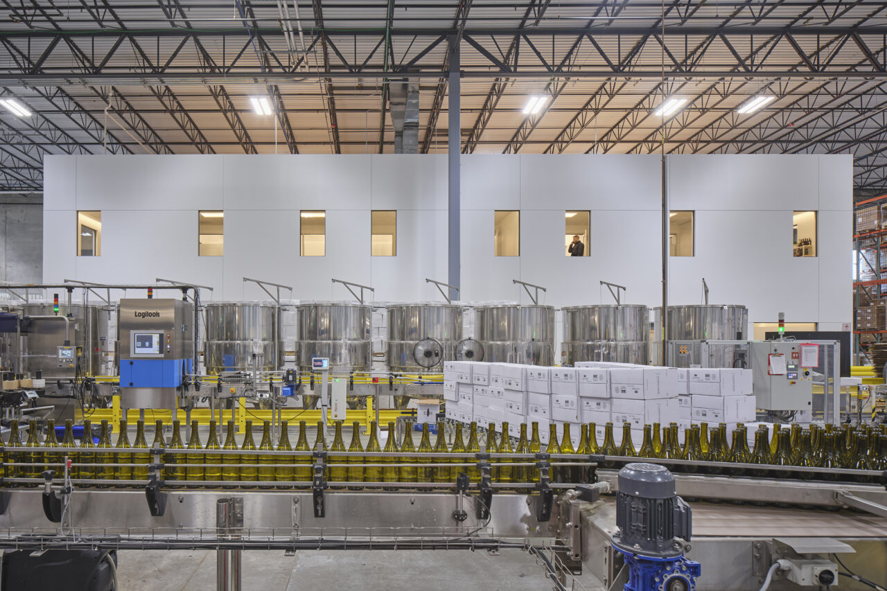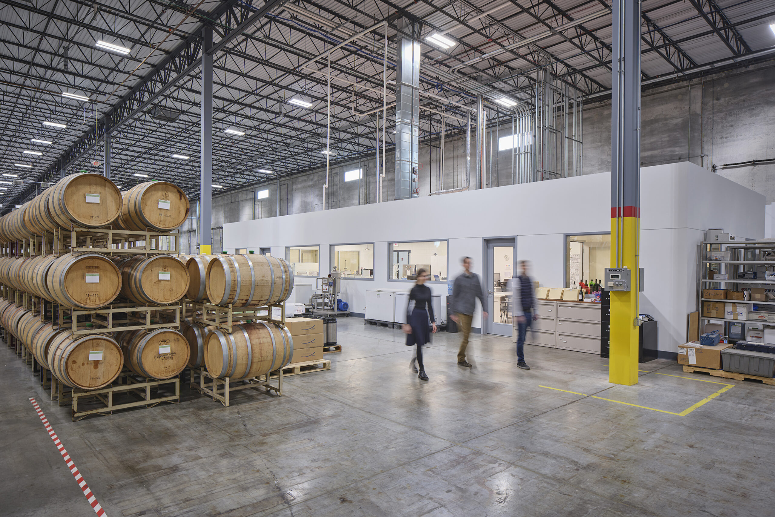 Inside, spaces embrace views back to the factory activities while maintaining acoustical separation from the noisy bottling lines. A large second-floor volume, highlighted by its abundance of light, features perimeter offices with large glass walls that further connect each space—a stark contrast to the former dark and crowded trailers. Every space is designed to maximize function and flexibility, allowing the facility to adapt as NexTerra Wine Co. continues to expand.
