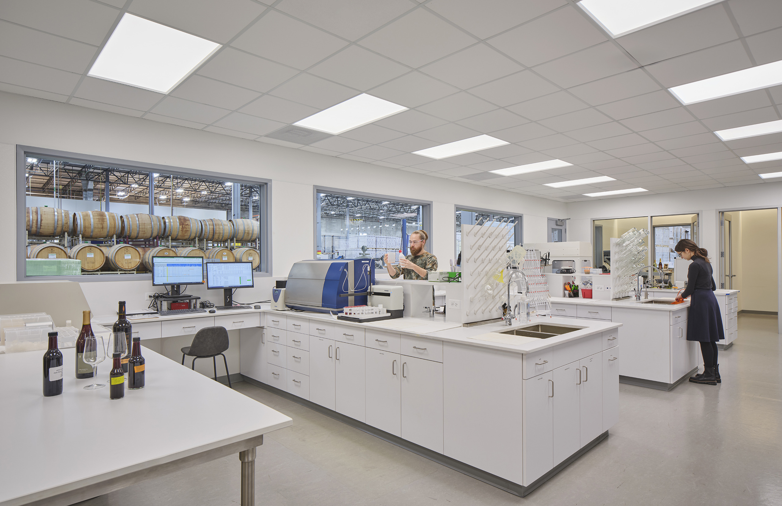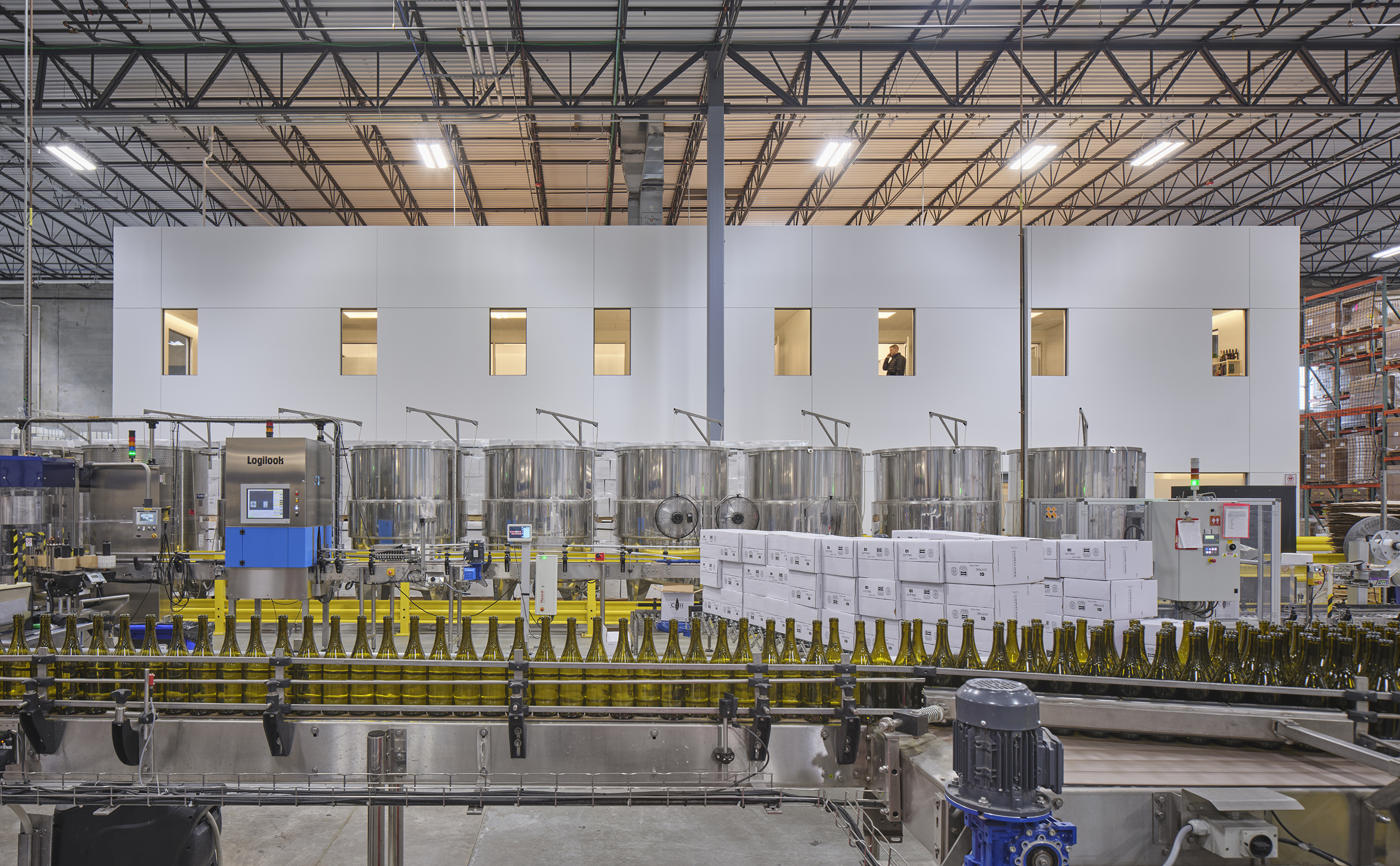 Inside, spaces embrace views back to the factory activities while maintaining acoustical separation from the noisy bottling lines. A large second-floor volume, highlighted by its abundance of light, features perimeter offices with large glass walls that further connect each space—a stark contrast to the former dark and crowded trailers. Every space is designed to maximize function and flexibility, allowing the facility to adapt as NexTerra Wine Co. continues to expand.