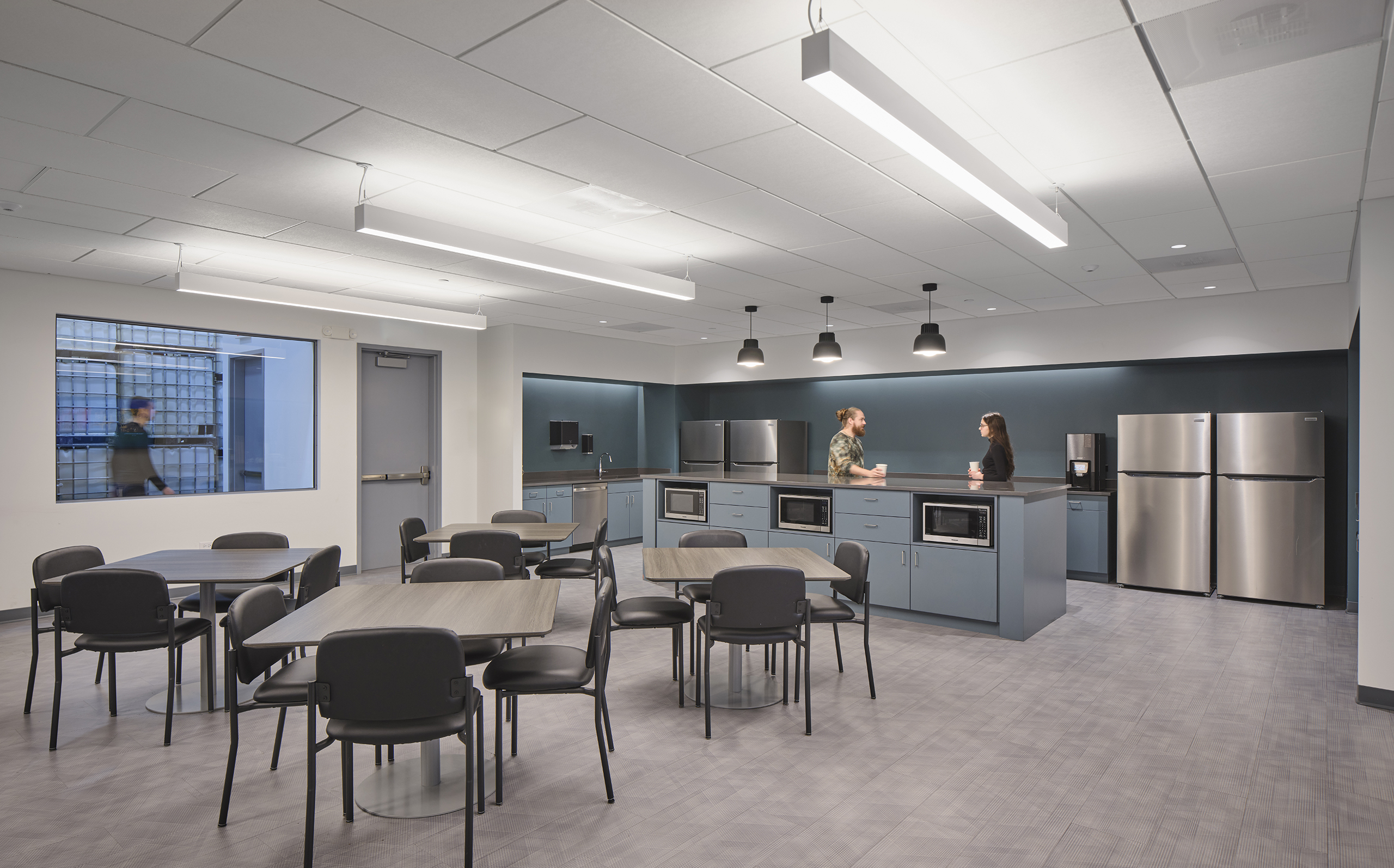 Initially reliant on six overcrowded temporary mobile trailers for essential functions: breakrooms, bathrooms, offices, and laboratories, the fast-growing company needed a permanent solution within the factory’s footprint. The project integrates new, multifunctional spaces that enhance flexibility, accessibility, and workflow within the facility, akin to placing a “ship in a bottle.”
