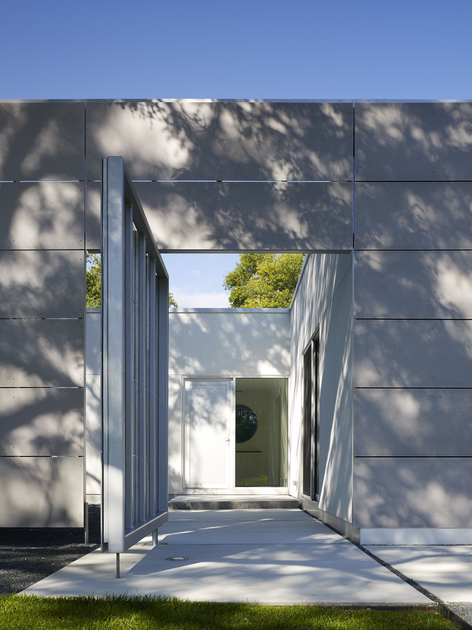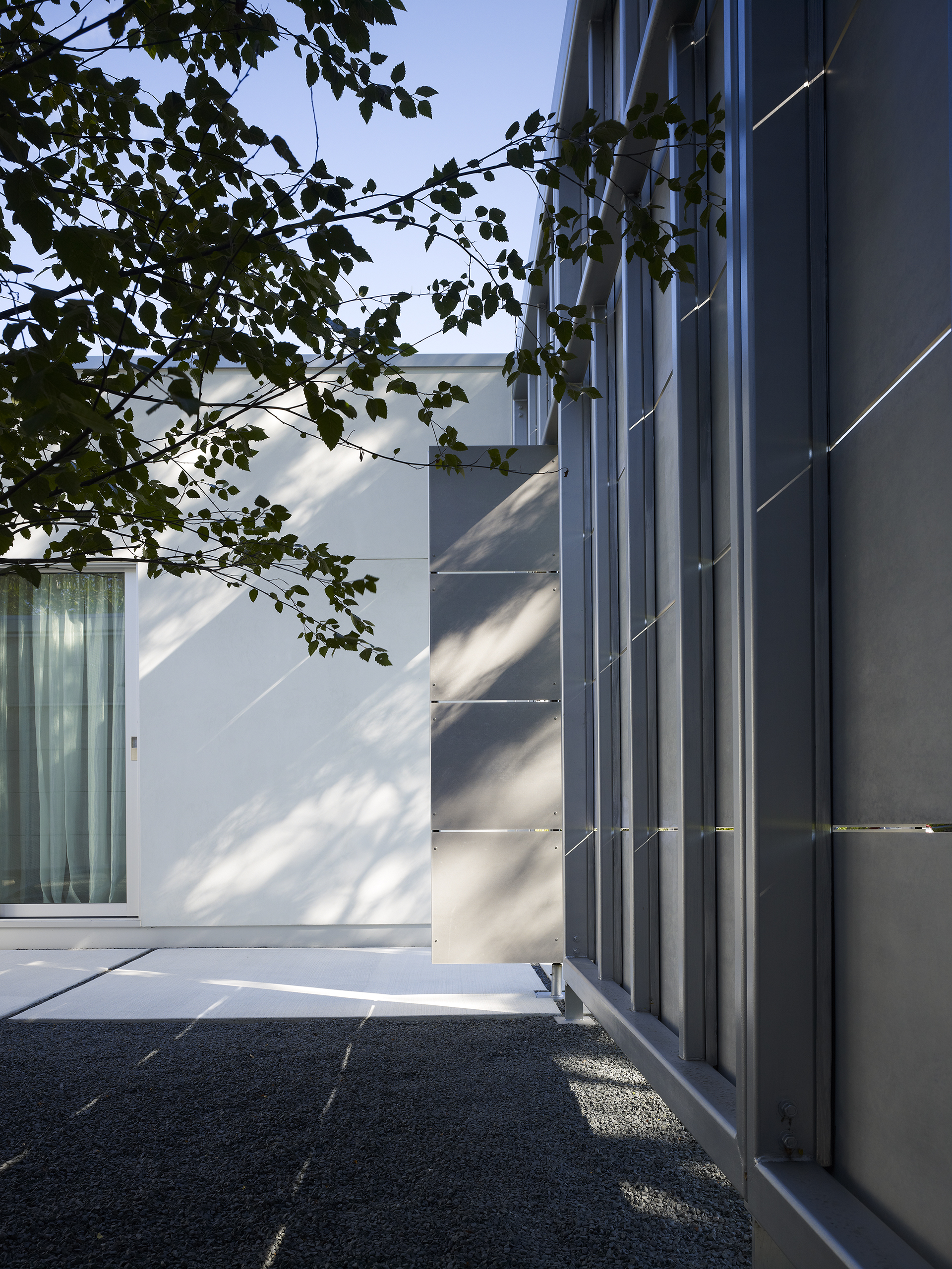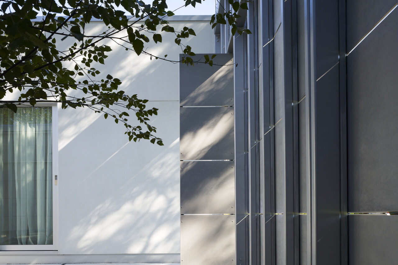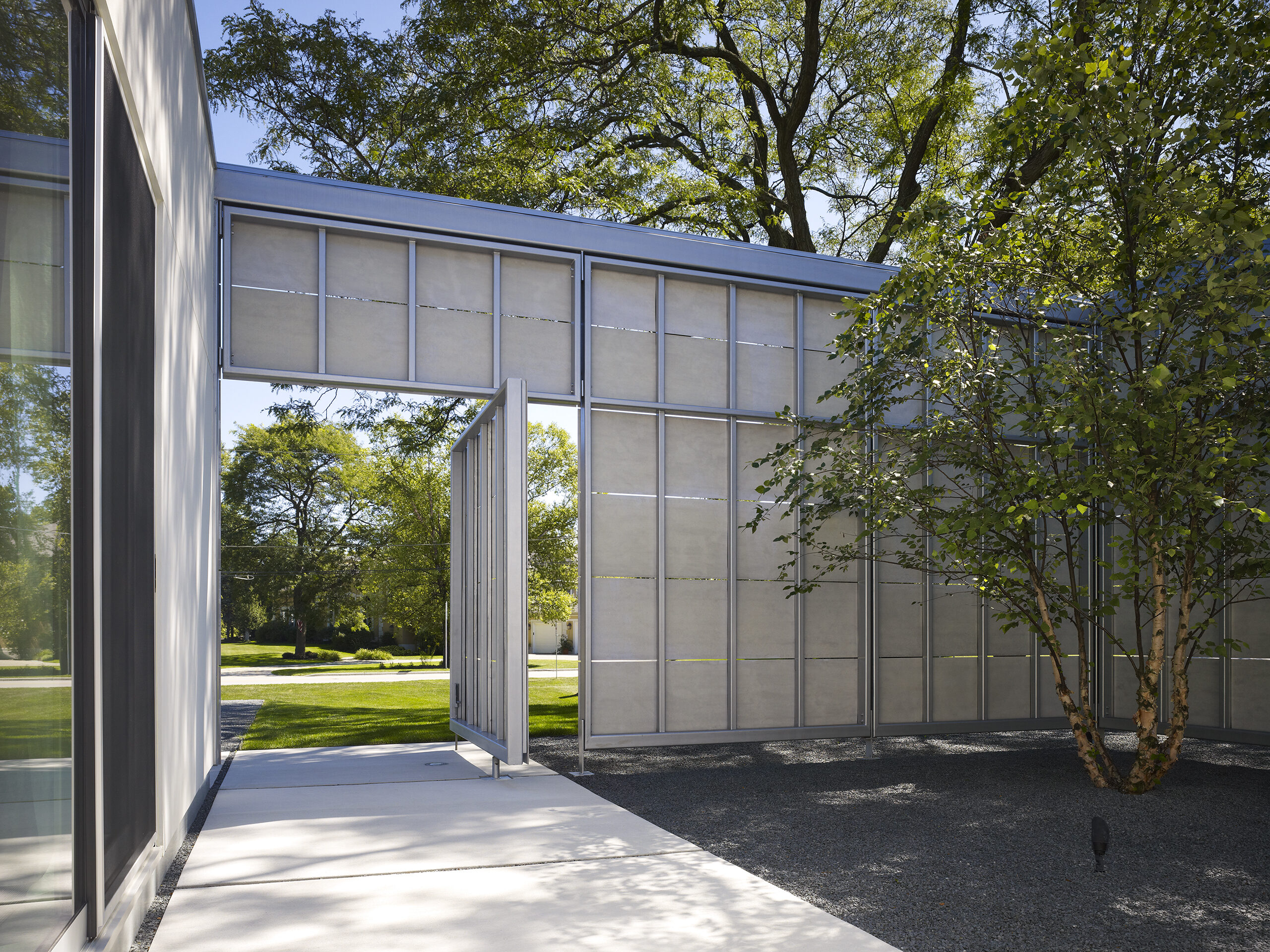 The house is designed to provide privacy and protection from the busy suburban street while extending open living spaces to a protected private landscape.