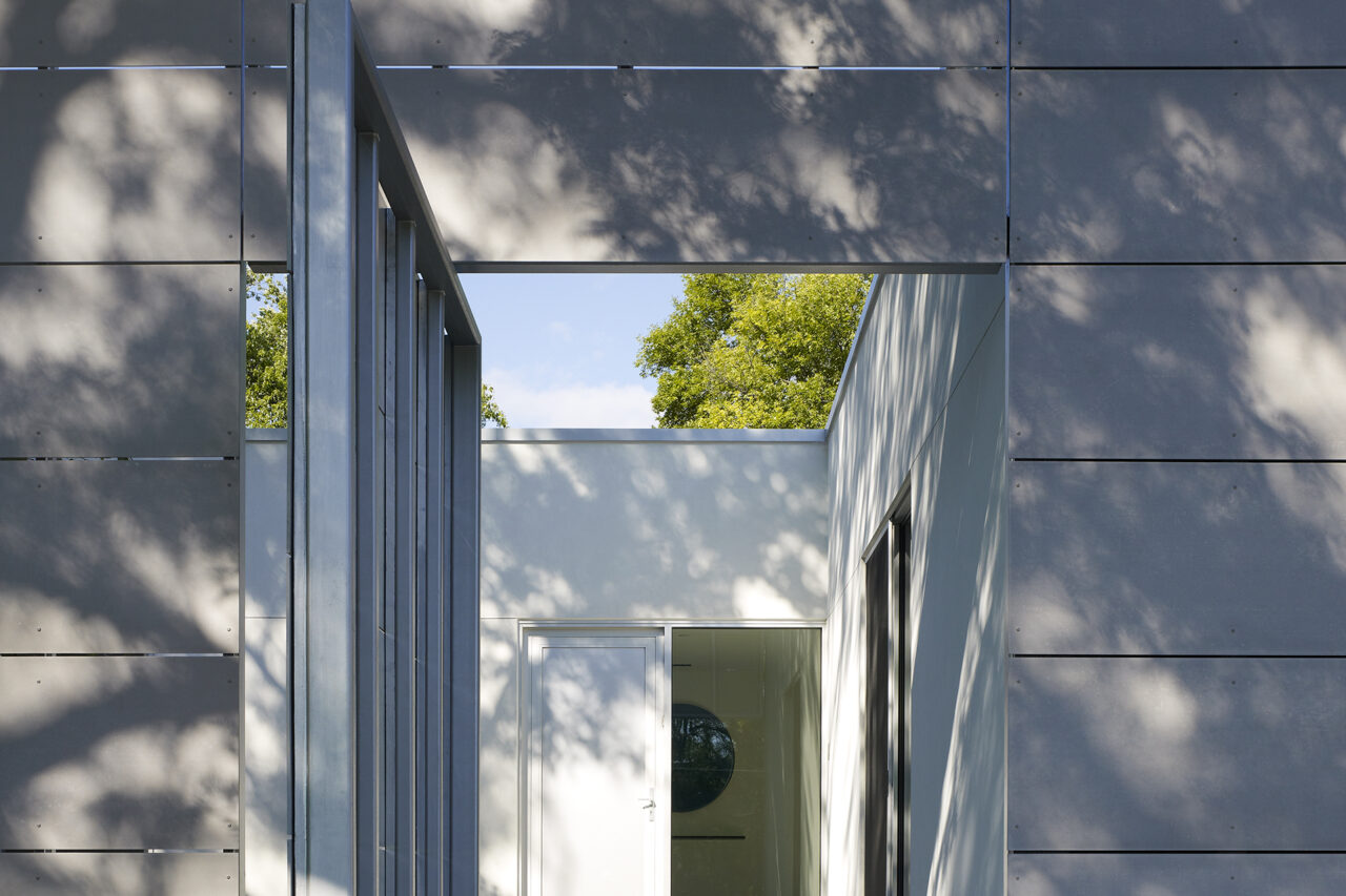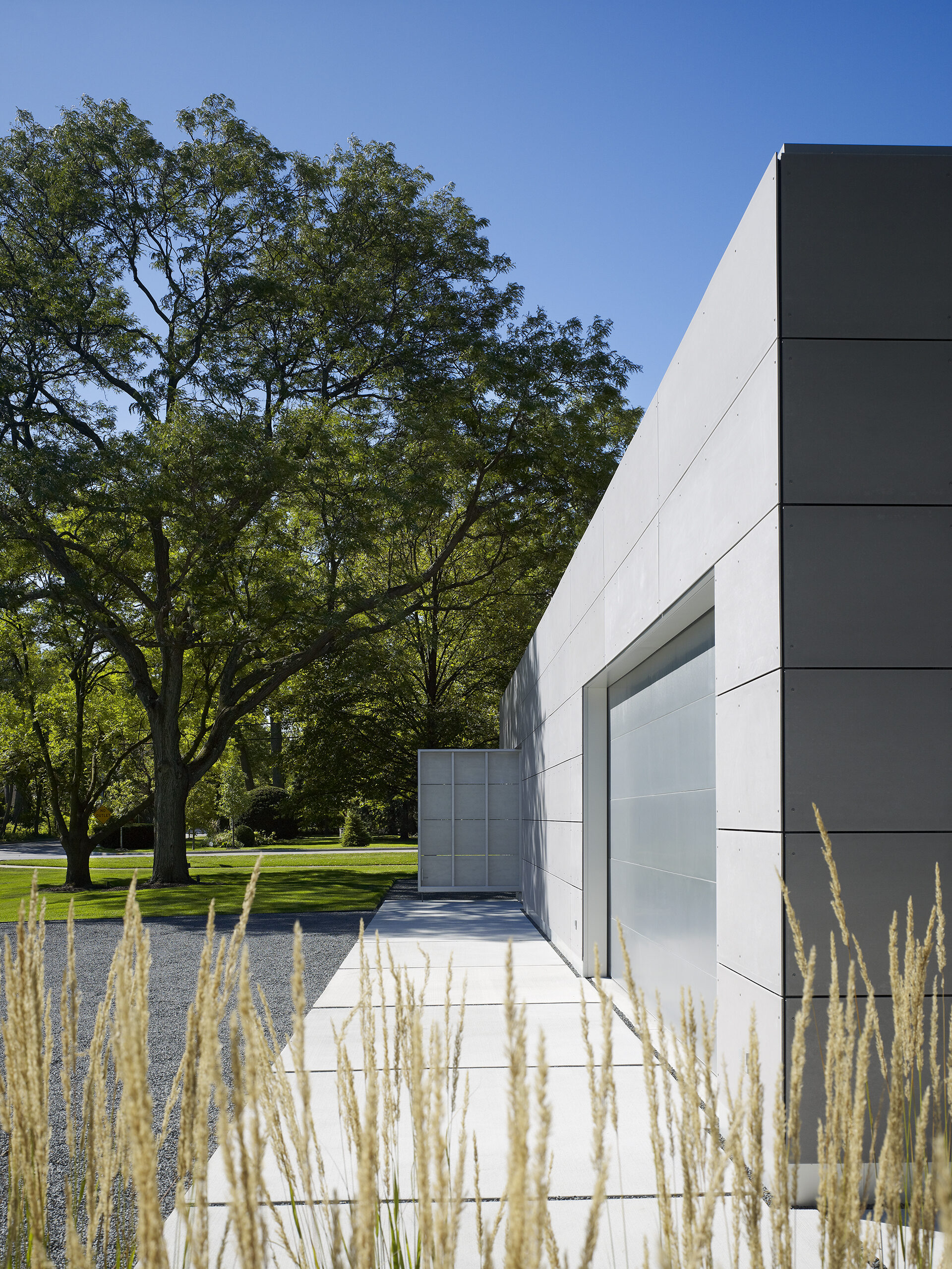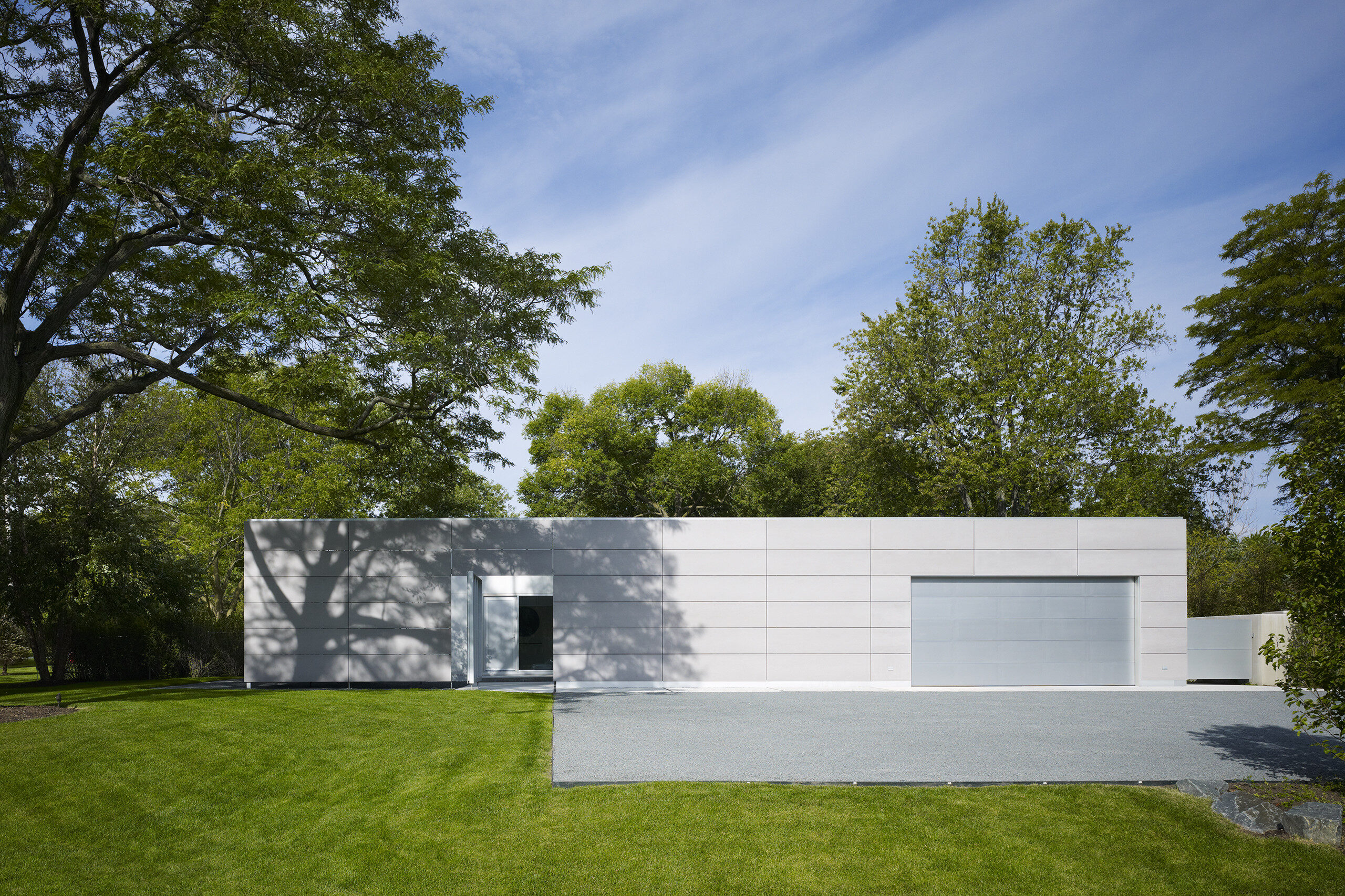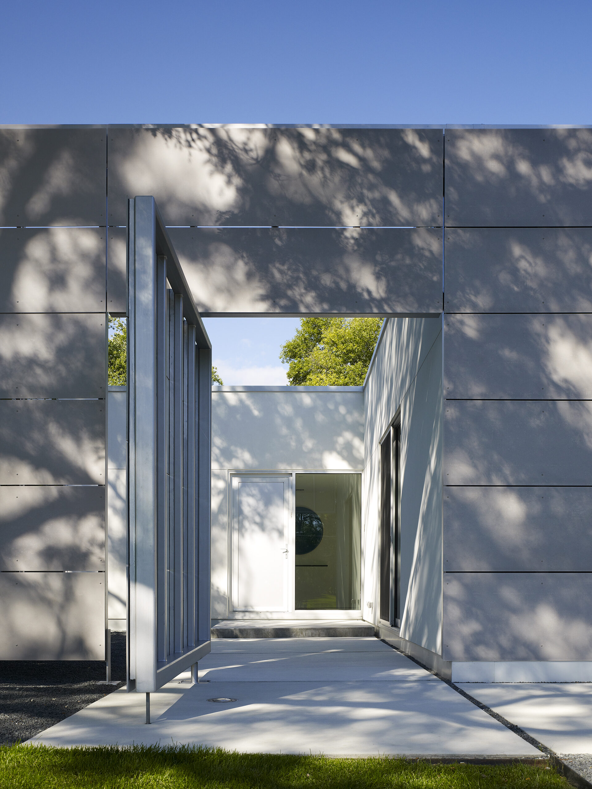 The house is designed to provide privacy and protection from the busy suburban street while extending open living spaces to a protected private landscape.
