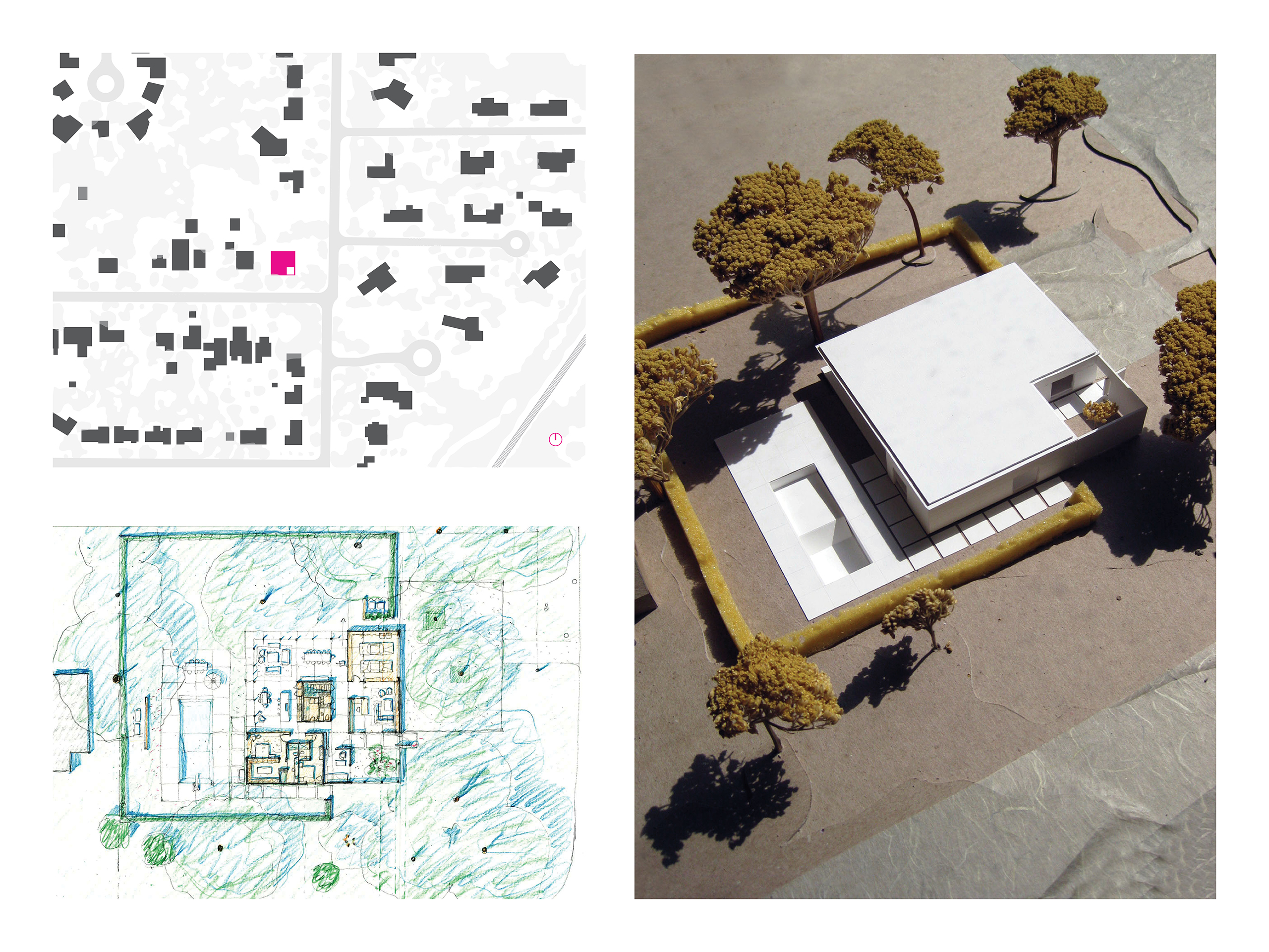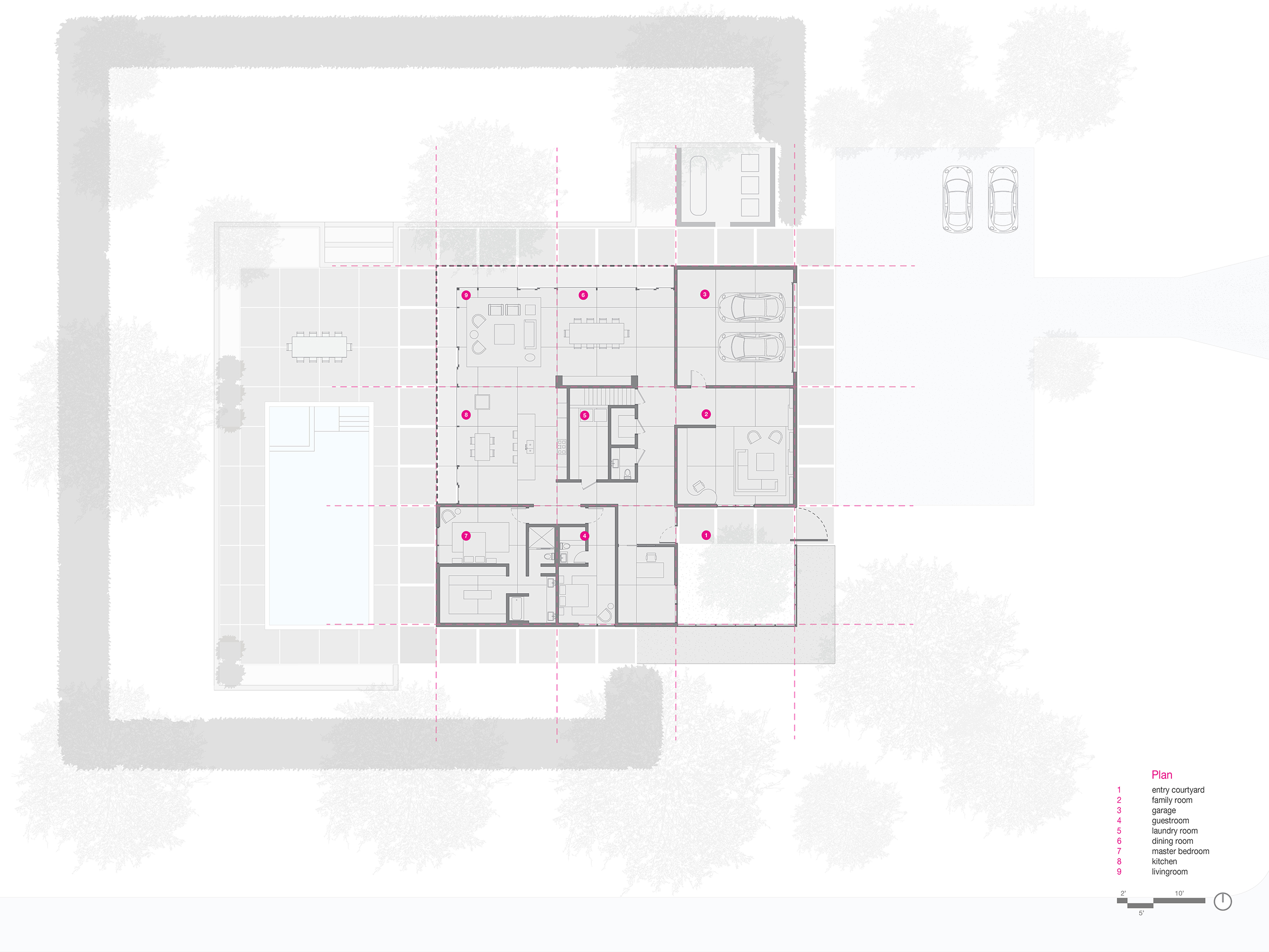 The nine-square plan of twenty-four foot bays is subdivided into eight foot modules. A central, open living space is insulated by cellular private rooms in the perimeter bays. In these interior spaces, light and views are provided by specifically located and controlled apertures in heightened contrast to the open garden side of the home.