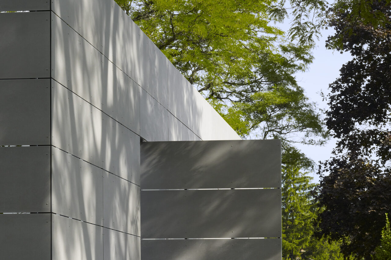 Modest in stature and budget, the material palette of the container is reflective of this modesty; grey cement composition panels, white painted gypsum board, white solid surface material, clear anodized aluminum and a white epoxy terrazzo floor.