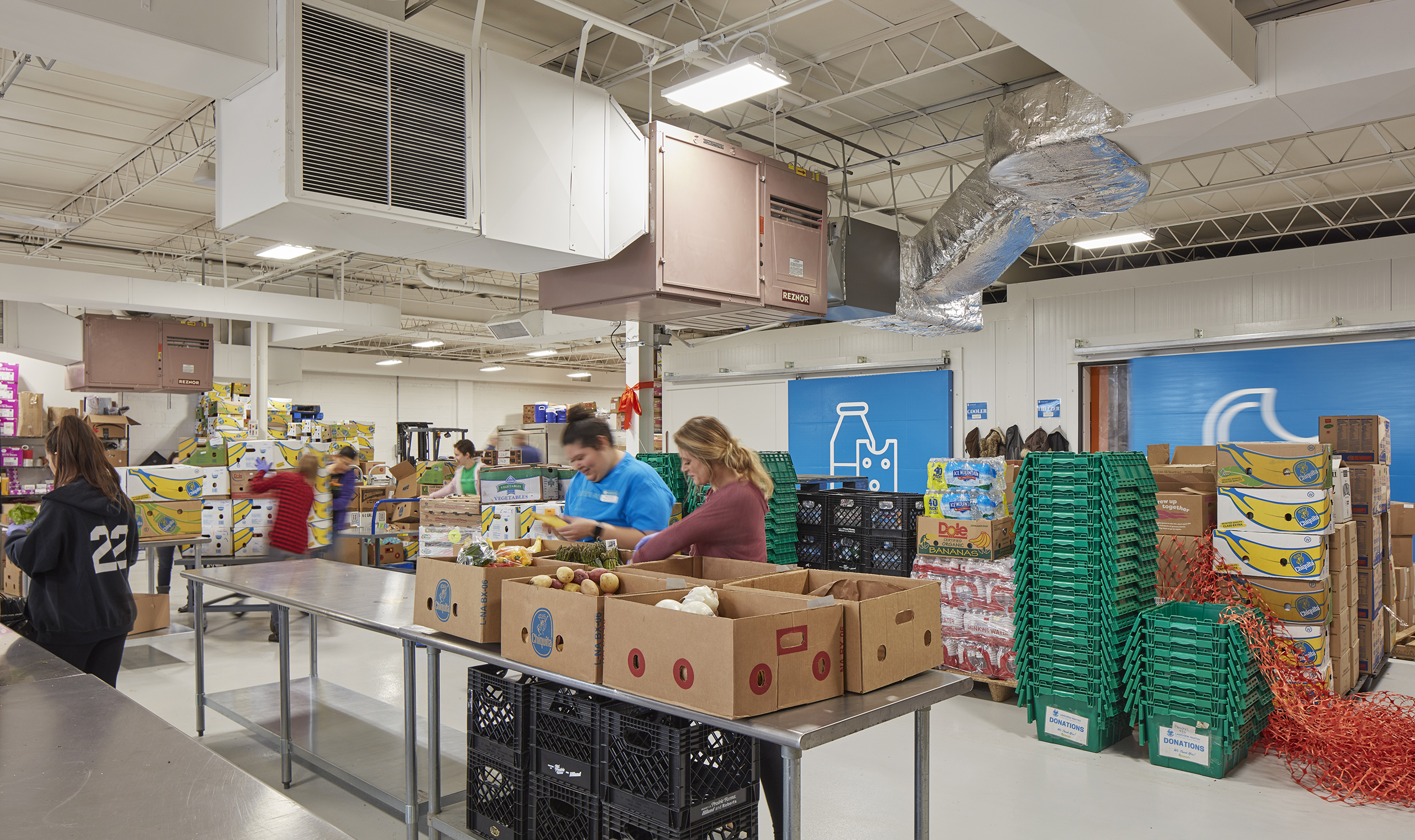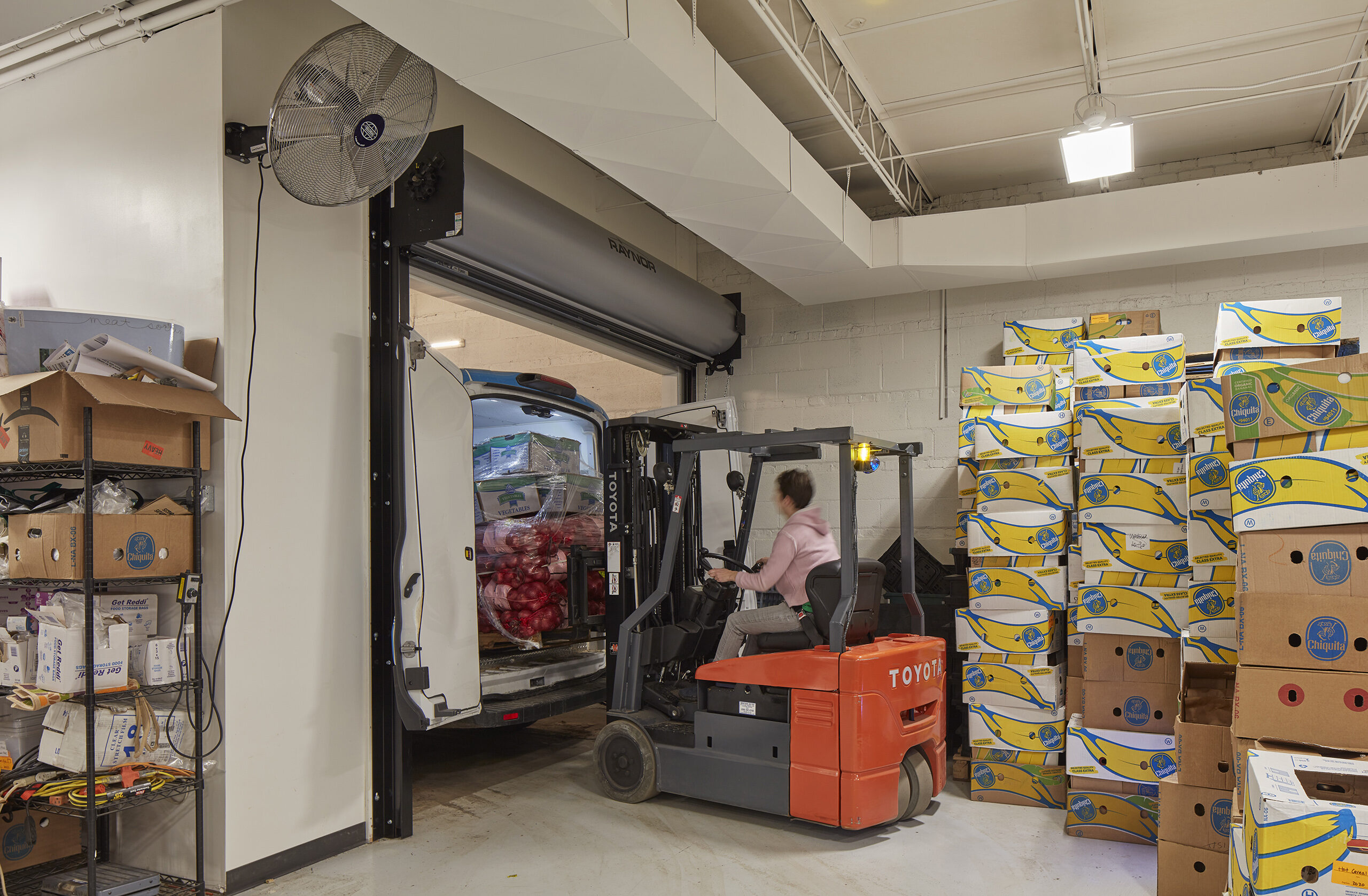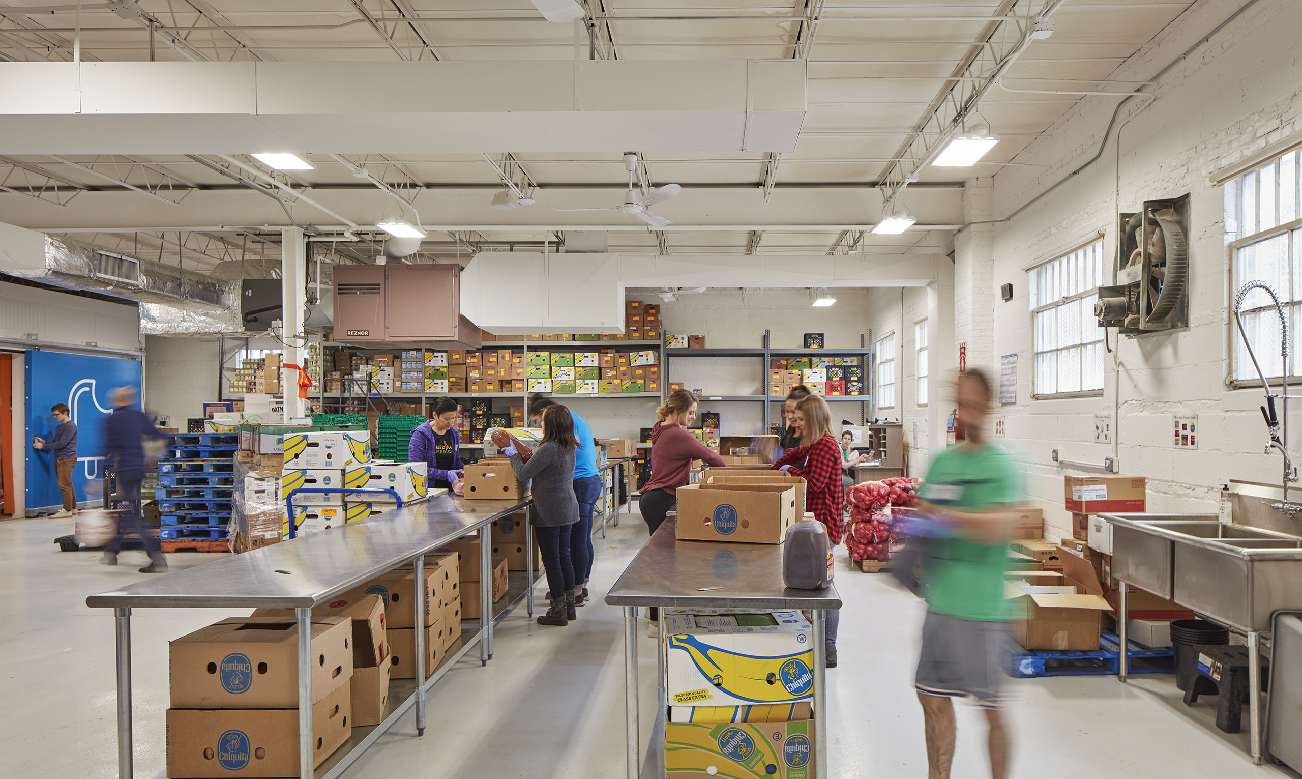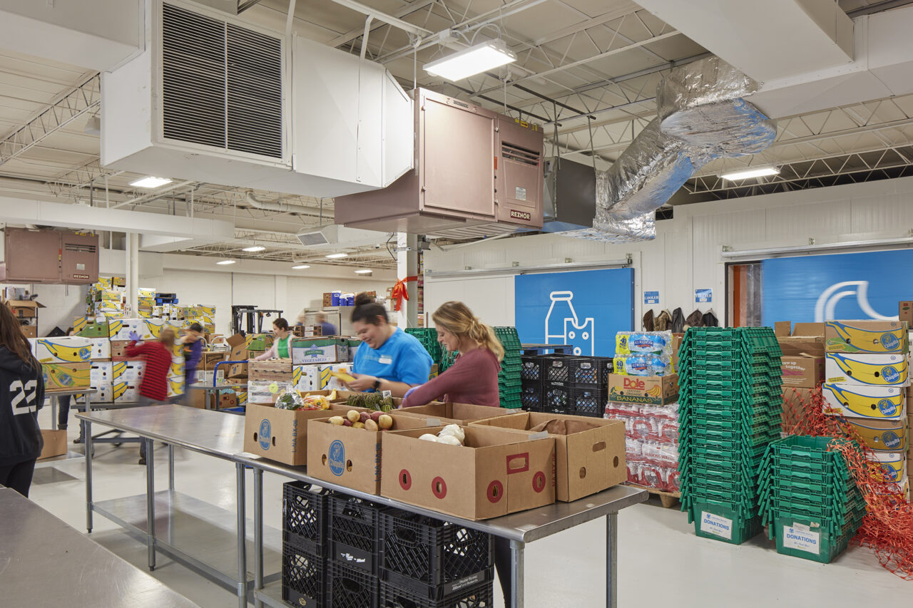 In the warehouse, capacity to store sizable donations enables the organization to serve even more Chicagoans who are facing difficulty. Pre-existing building materials (brick, cmu, steel, gypsum roof deck) are all sprayed white, creating a single, cohesive space. Both natural and LED lighting illuminate the sorting, gleaning and packing activities taking place.