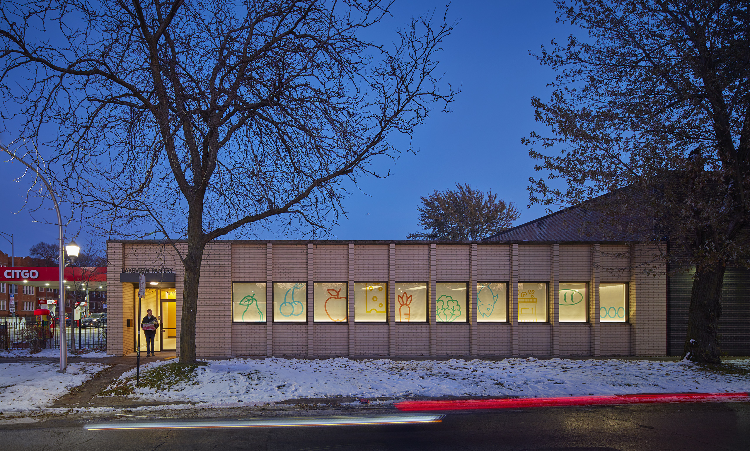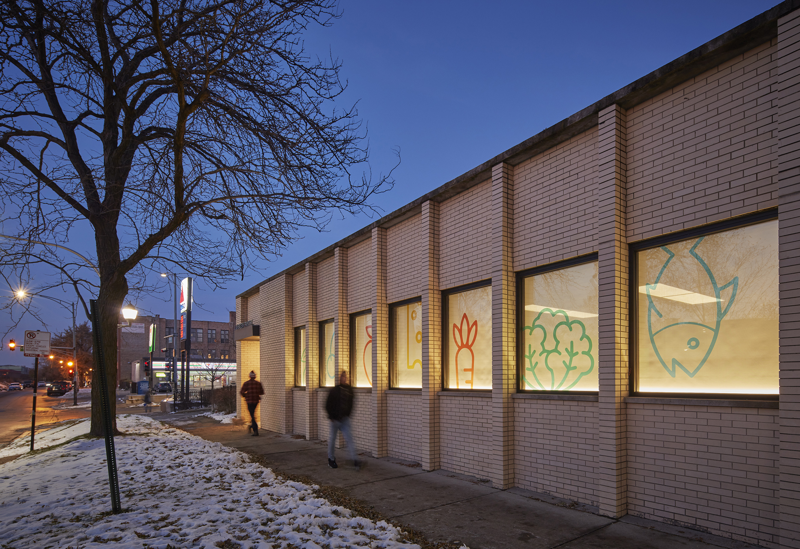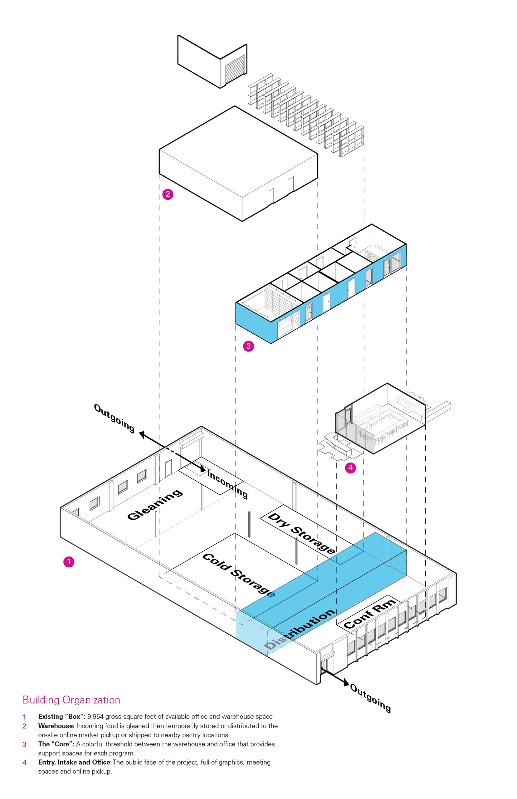 In the warehouse, capacity to store sizable donations enables the organization to serve even more Chicagoans who are facing difficulty. Pre-existing building materials (brick, cmu, steel, gypsum roof deck) are all sprayed white, creating a single, cohesive space. Both natural and LED lighting illuminate the sorting, gleaning and packing activities taking place.