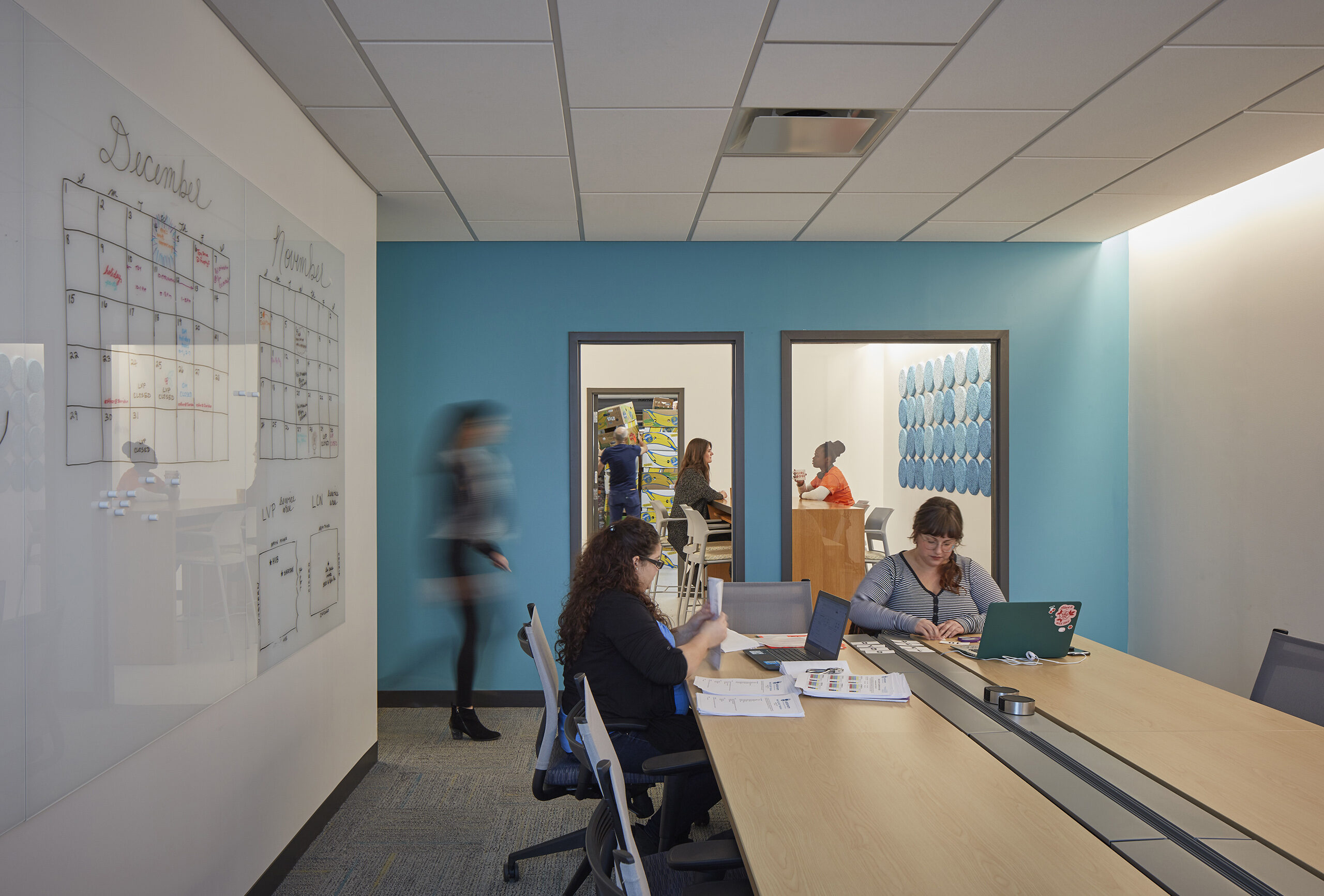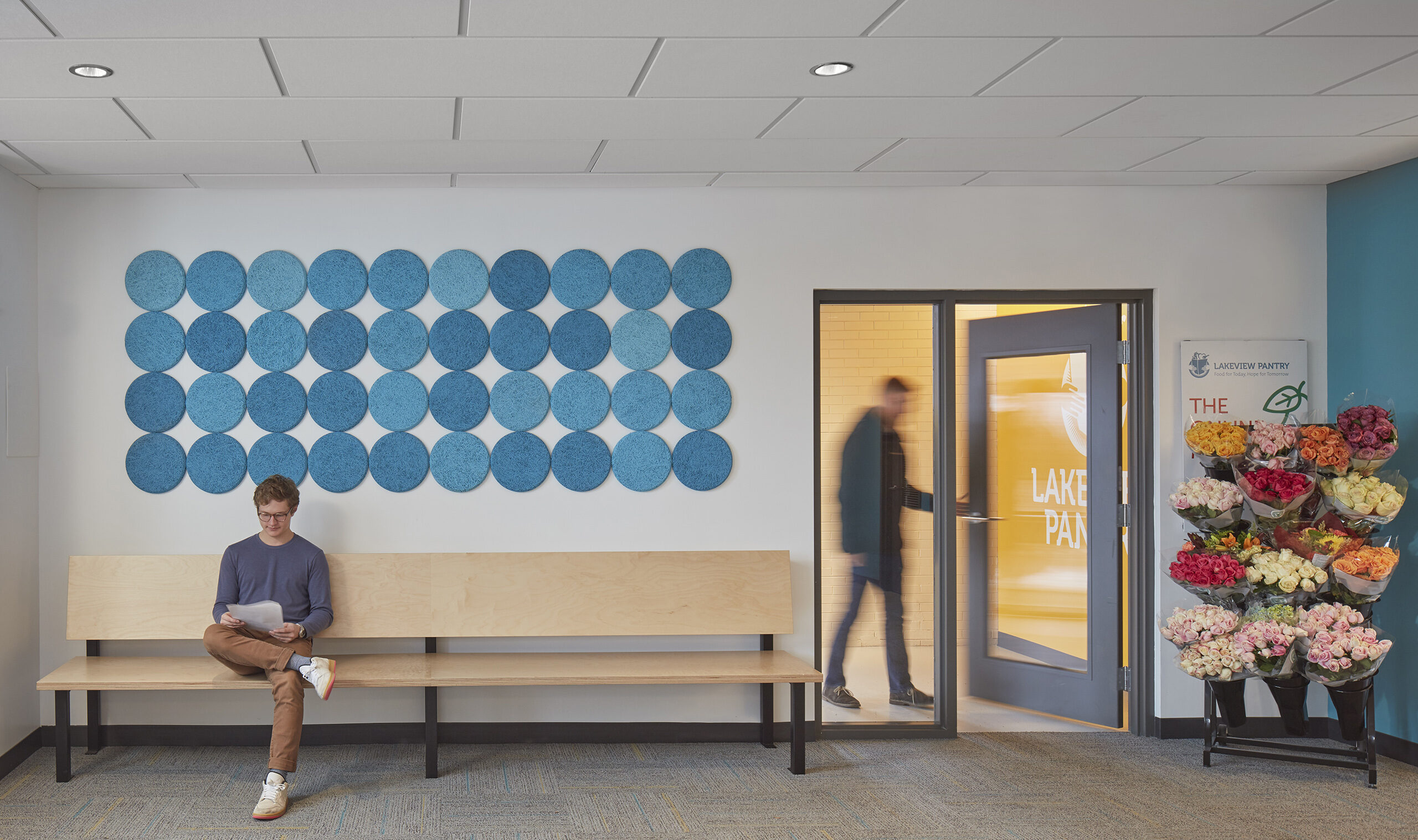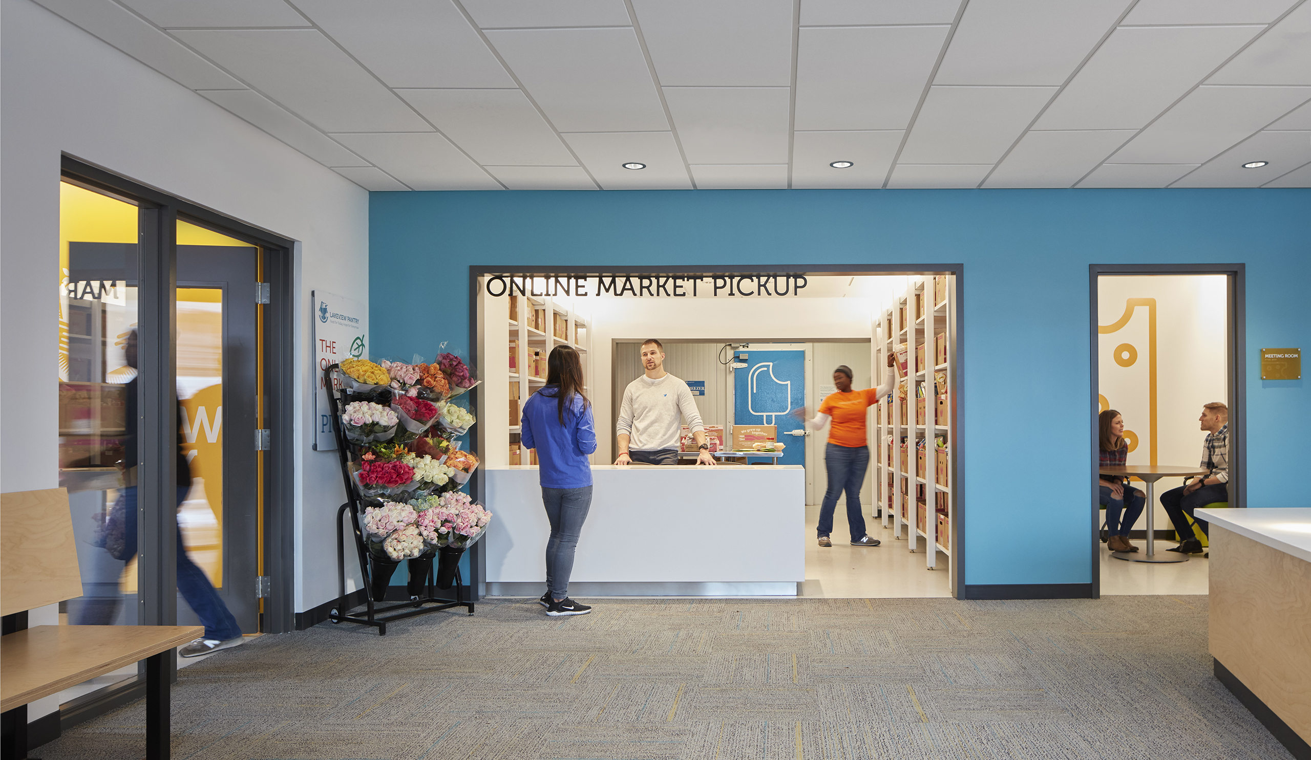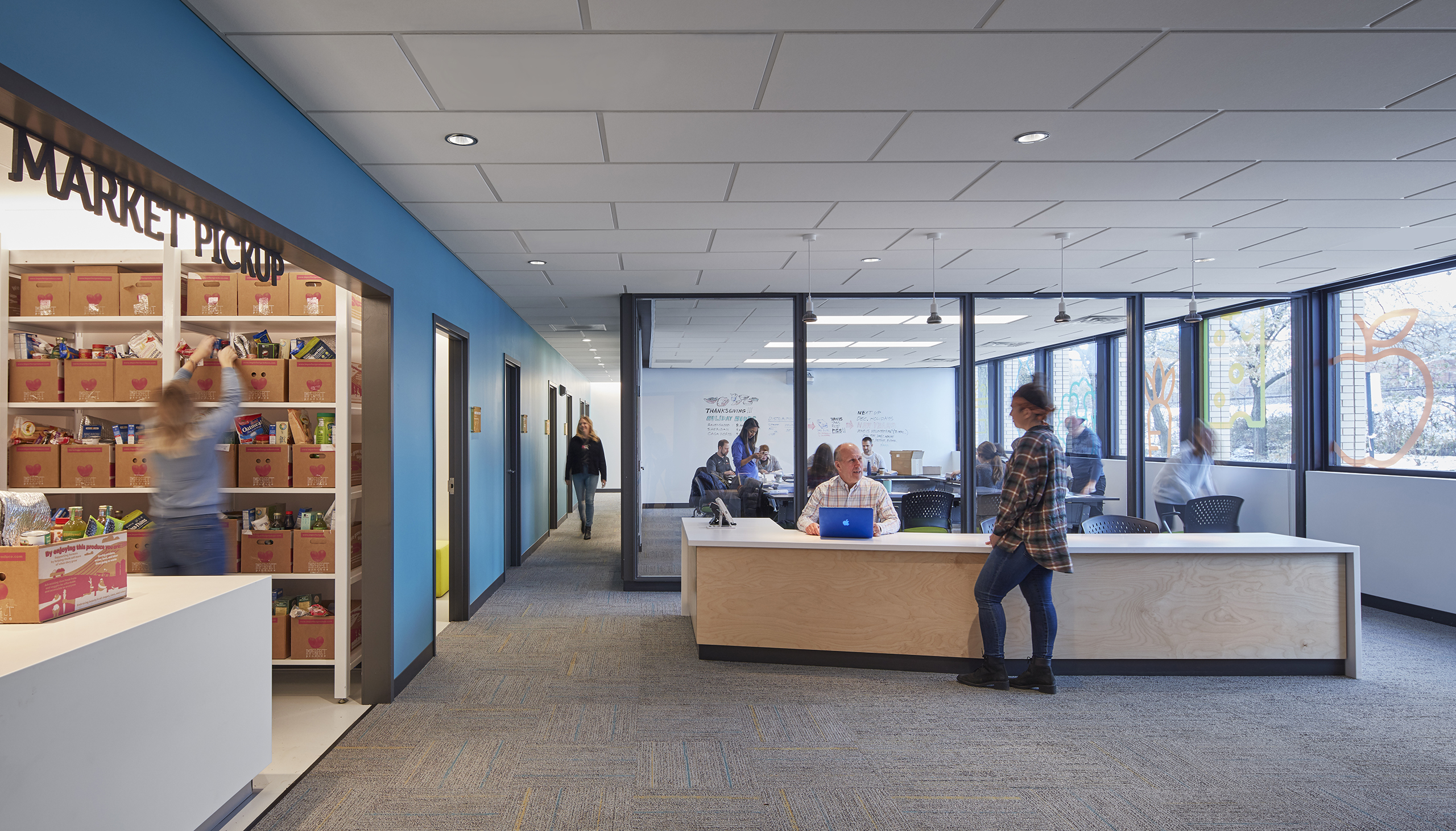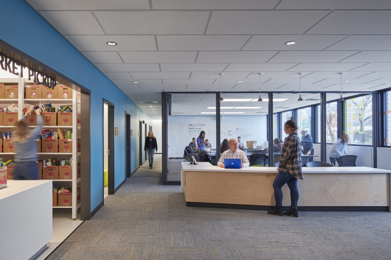 The DNA of their flagship market weaves through the Hub; bright colors and large food graphics appear along the windows, a light-filled waiting area welcomes clients with flowers, and a greeter personally checks-in each individual. A bright blue core volume houses the online market pick-up center, private huddle rooms, and a staff/volunteer kitchen.