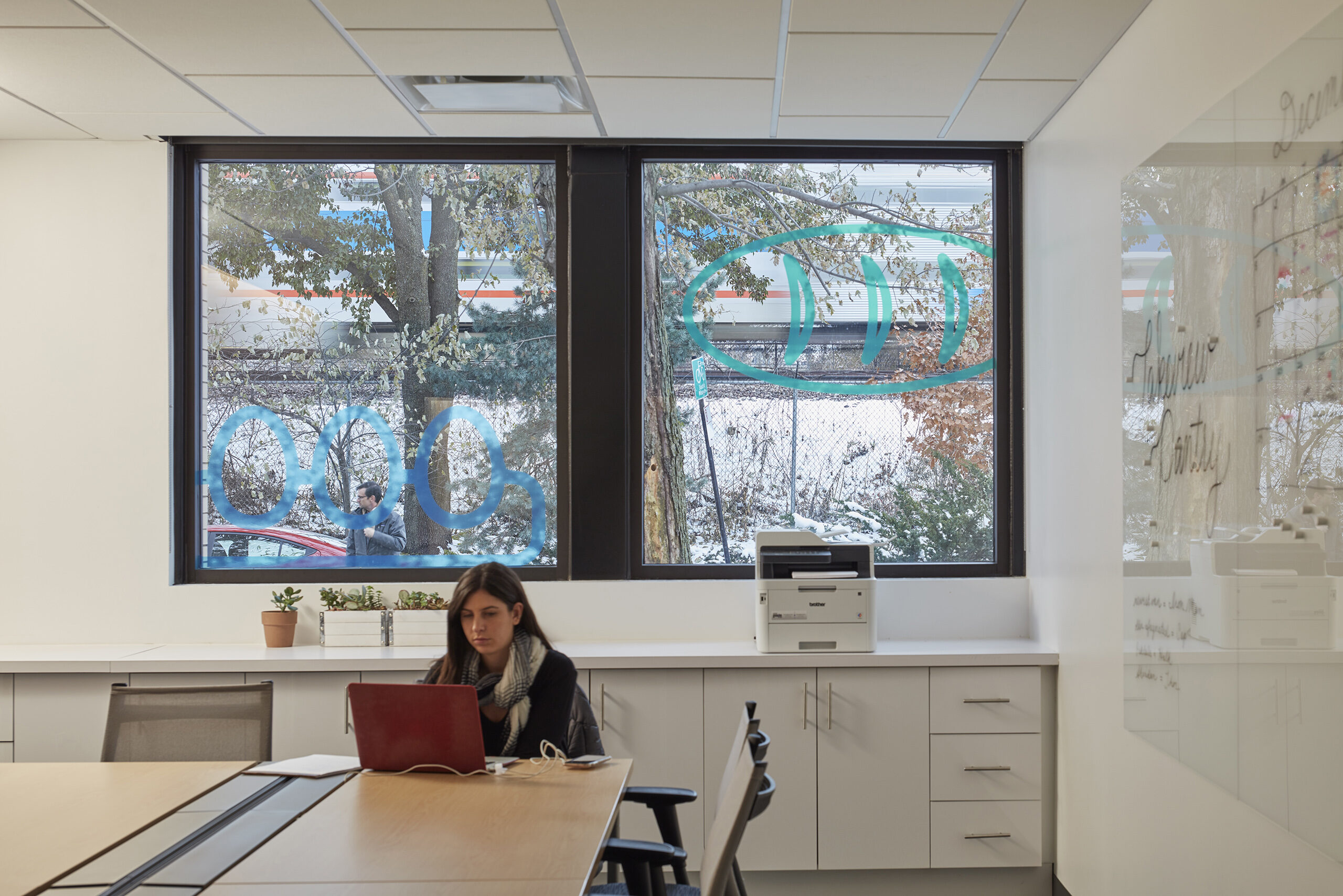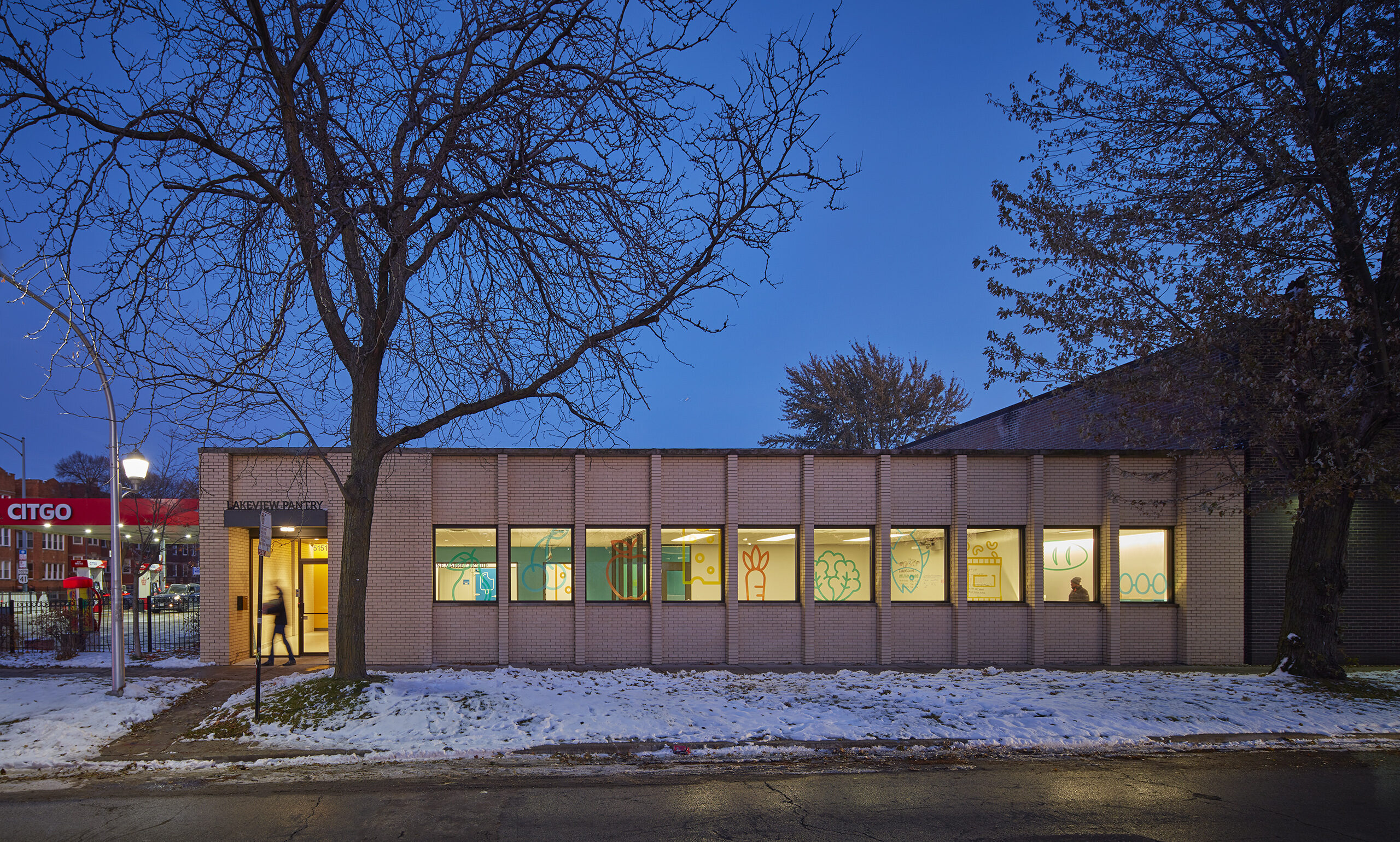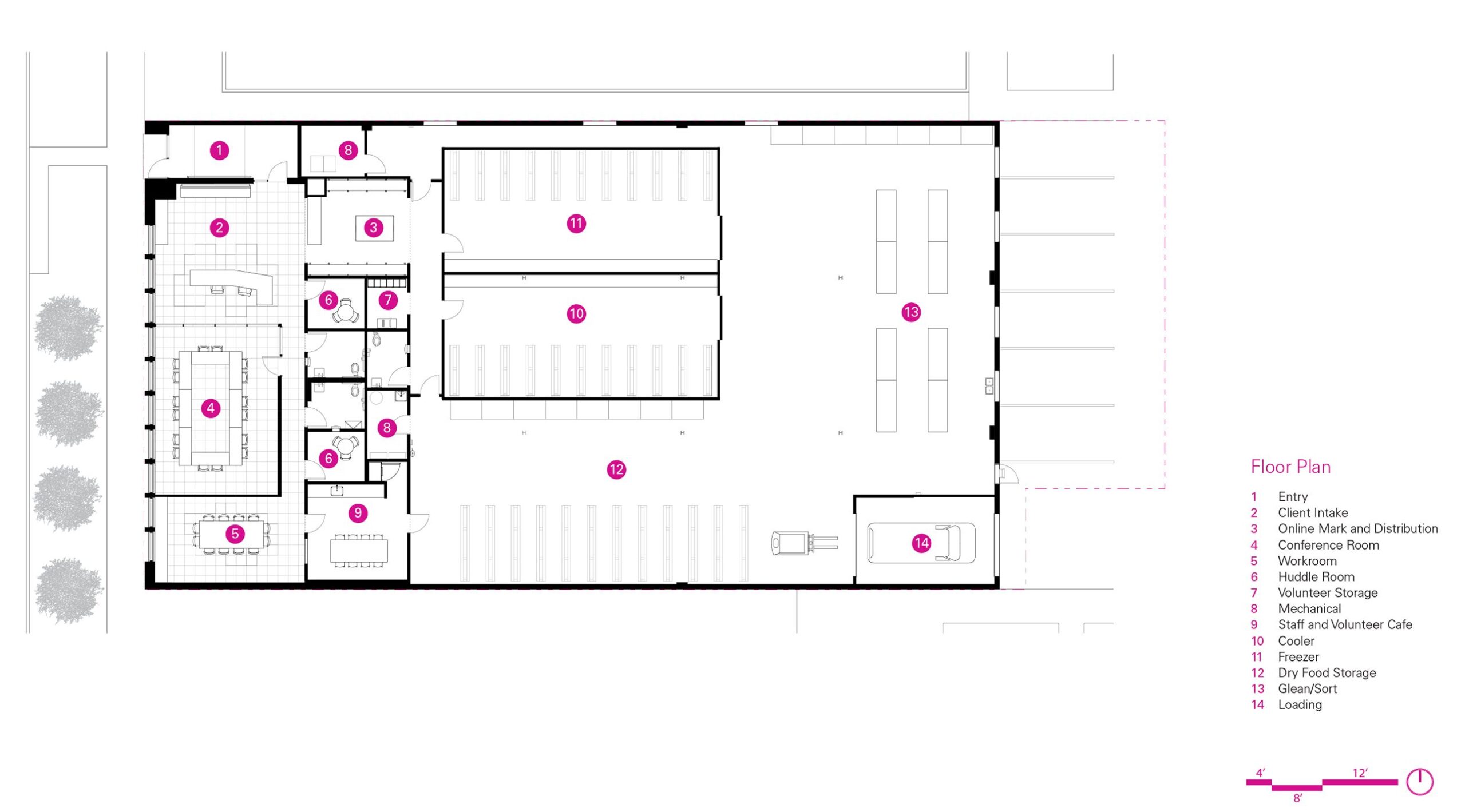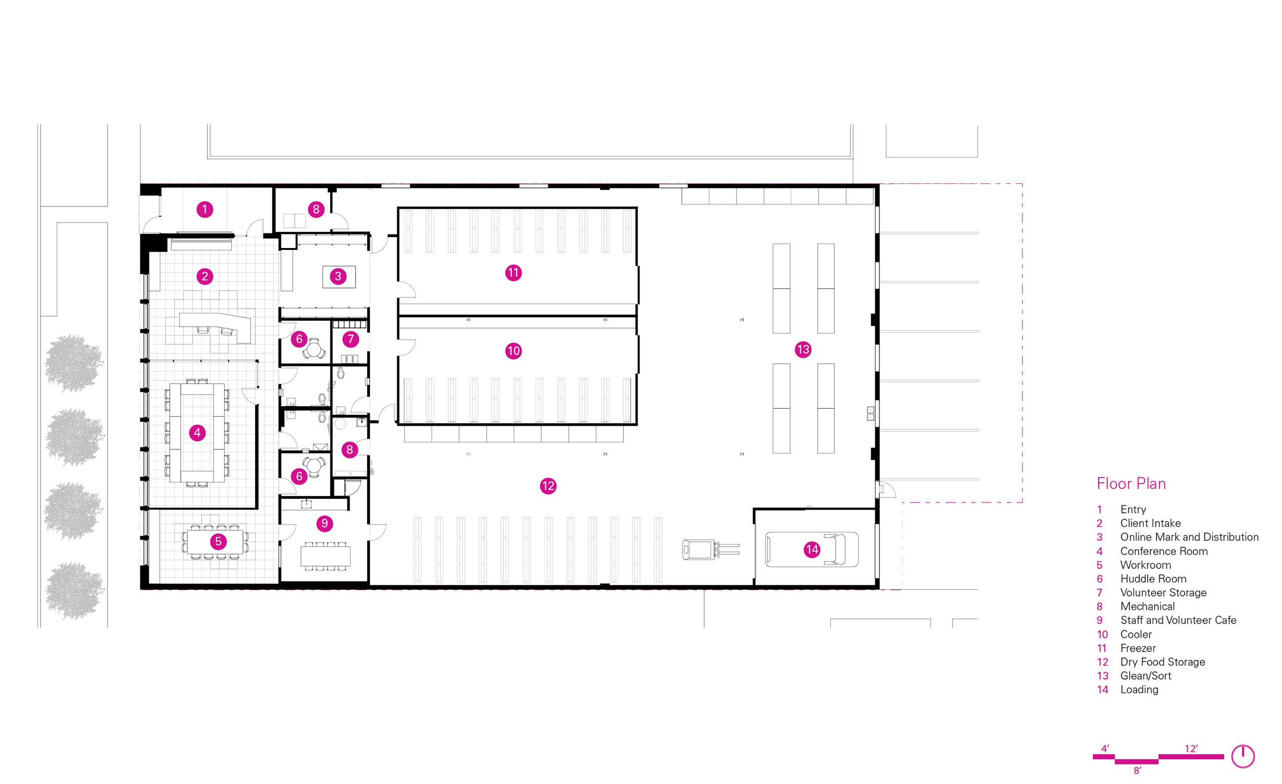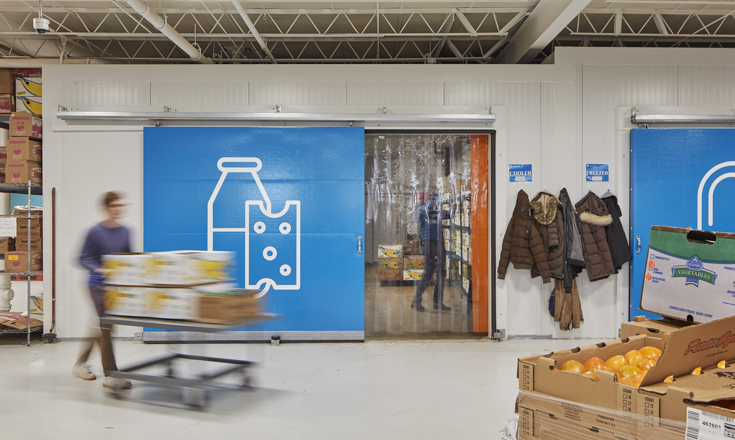 The DNA of their flagship market weaves through the Hub; bright colors and large food graphics appear along the windows, a light-filled waiting area welcomes clients with flowers, and a greeter personally checks-in each individual. A bright blue core volume houses the online market pick-up center, private huddle rooms, and a staff/volunteer kitchen.