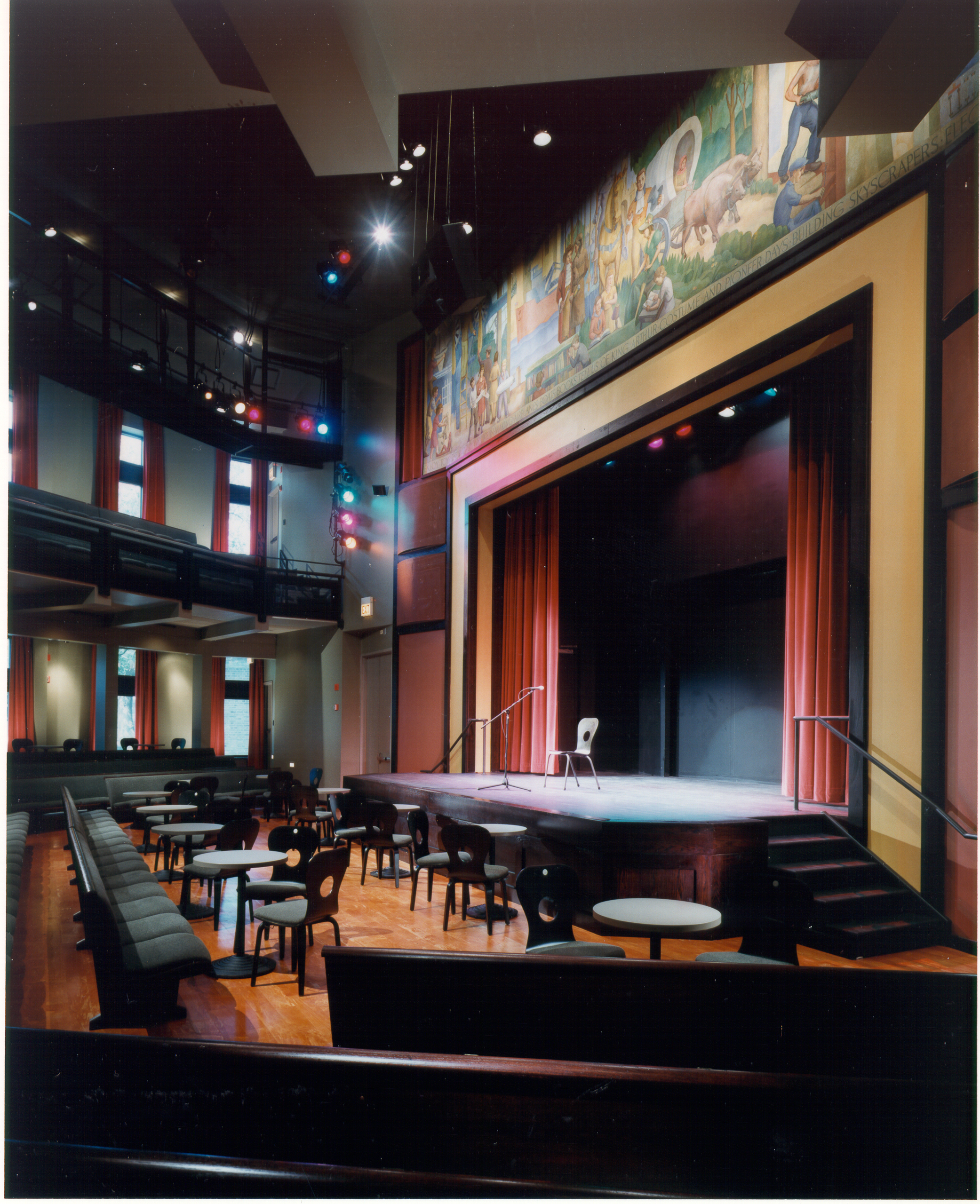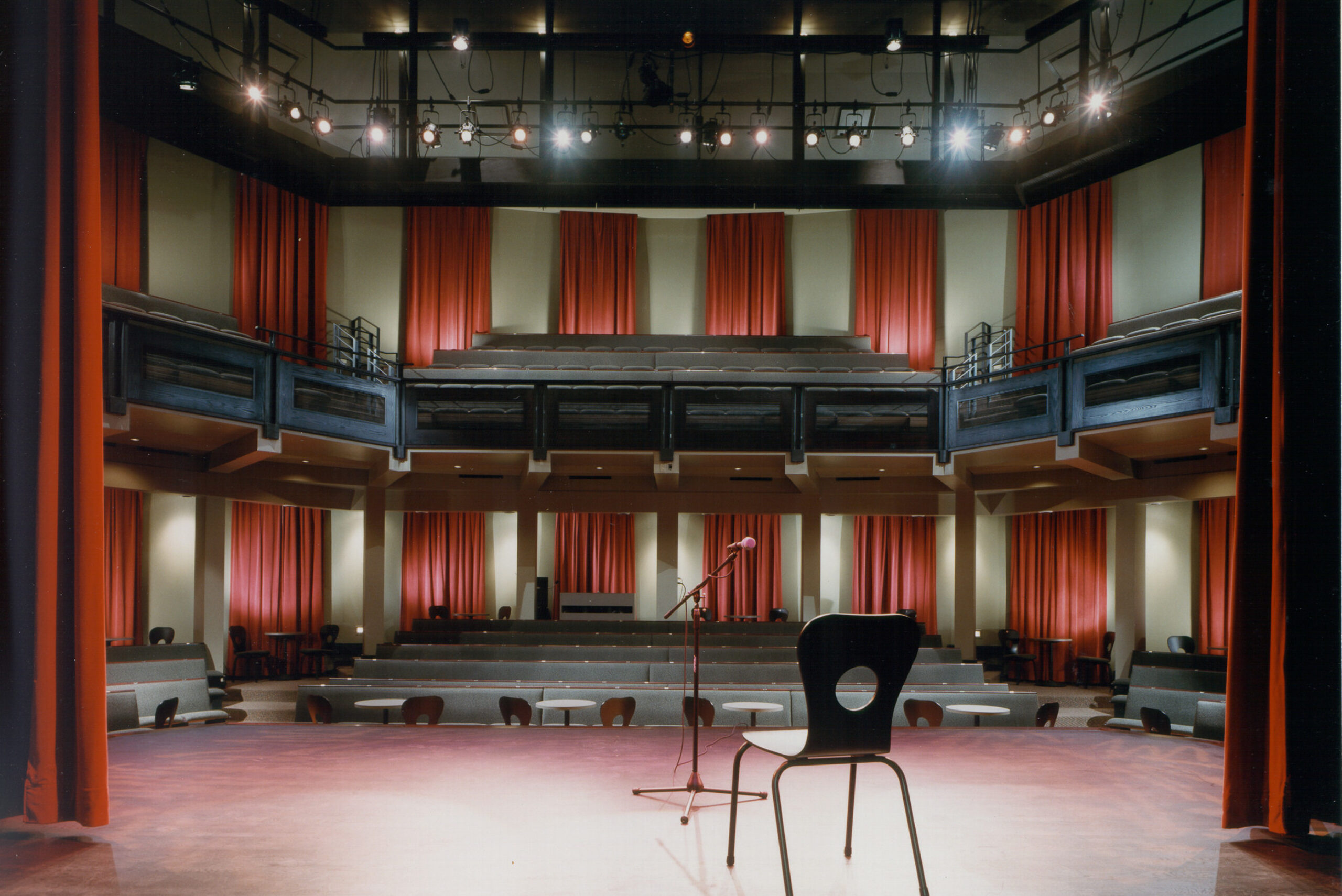 Located in a half-drum shaped space formerly occupied by four floors of book stacks, the hall contains two levels of raked seating that wrap around a center thrust stage. Instead of occupying a peripheral location like most venues, the stage was instead located prominently in the center of the building.