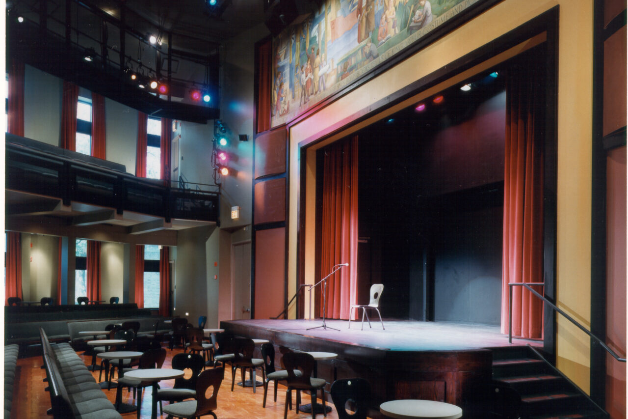 The centerpiece of the facility is the iconoclastic performance hall. Instead of constructing a traditional auditorium that would be seldom used except for performances, the school opted for a space that would remain a social center throughout a typical day. The hall, developed as a variation on a cabaret, is outfitted with a “see-through” stage, numerous windows, loose seating and tables, and is served by a walk-up café.