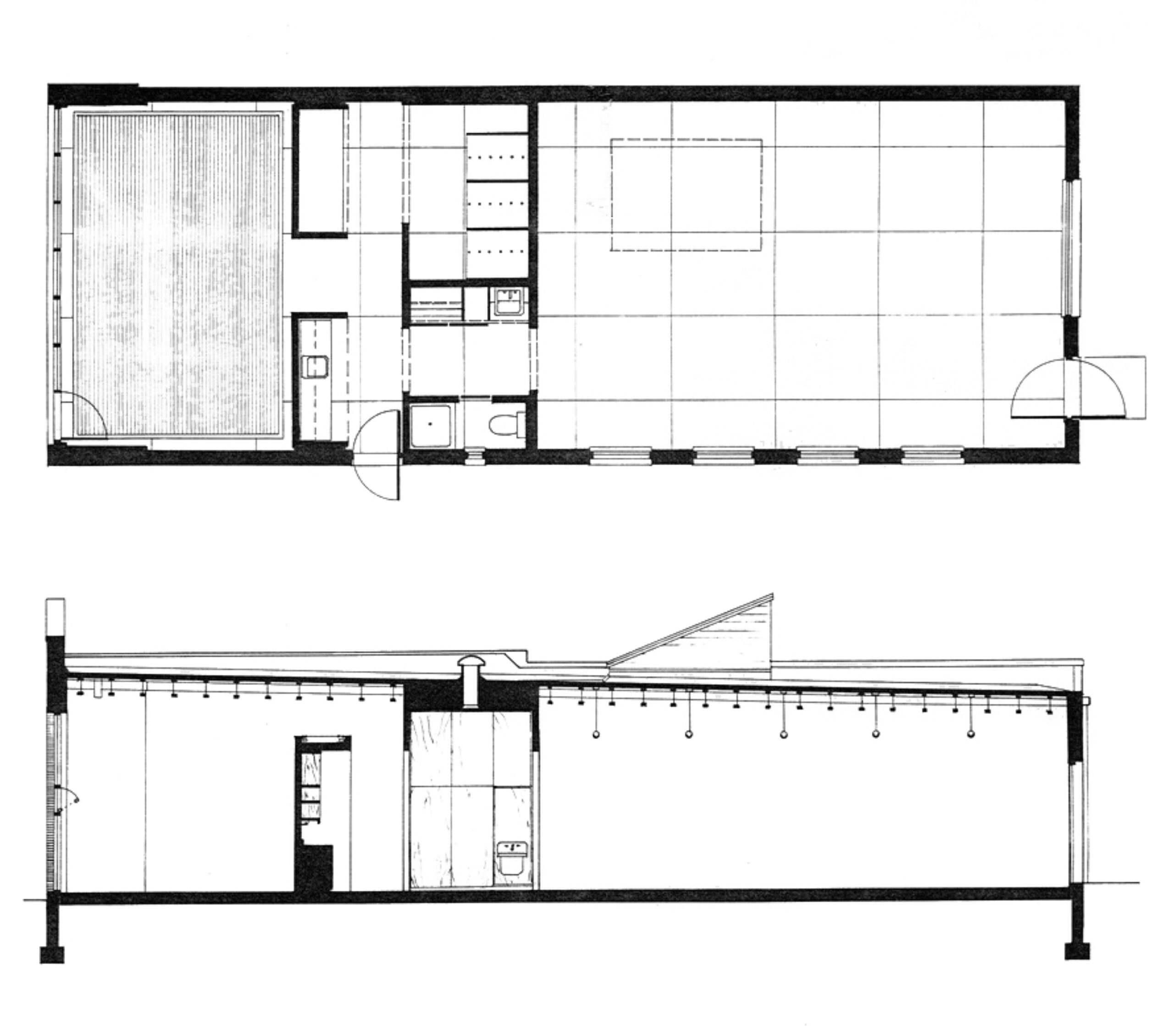 The simple cadence of plate connected wood trusses is not broken for the skylight above. Crisp plaster walls meet the concrete floor directly. The larger studio space towards the rear opens up directly onto the garden.