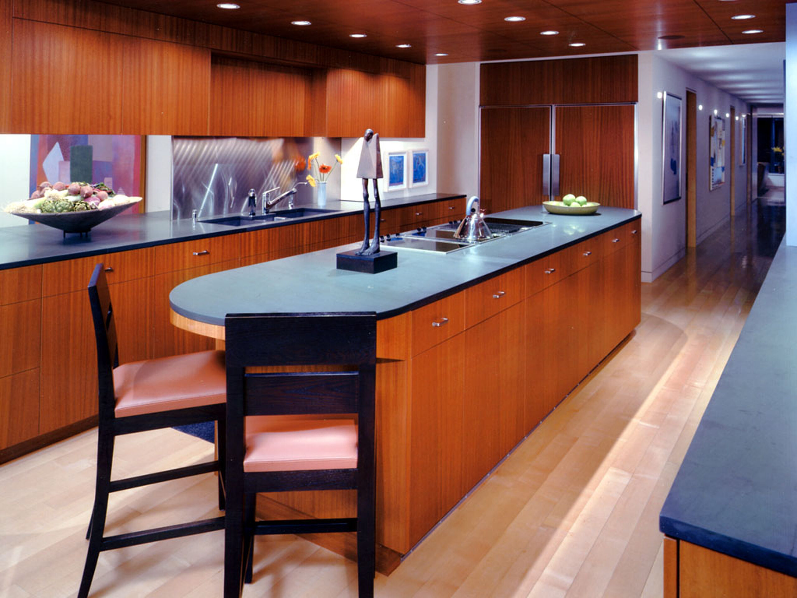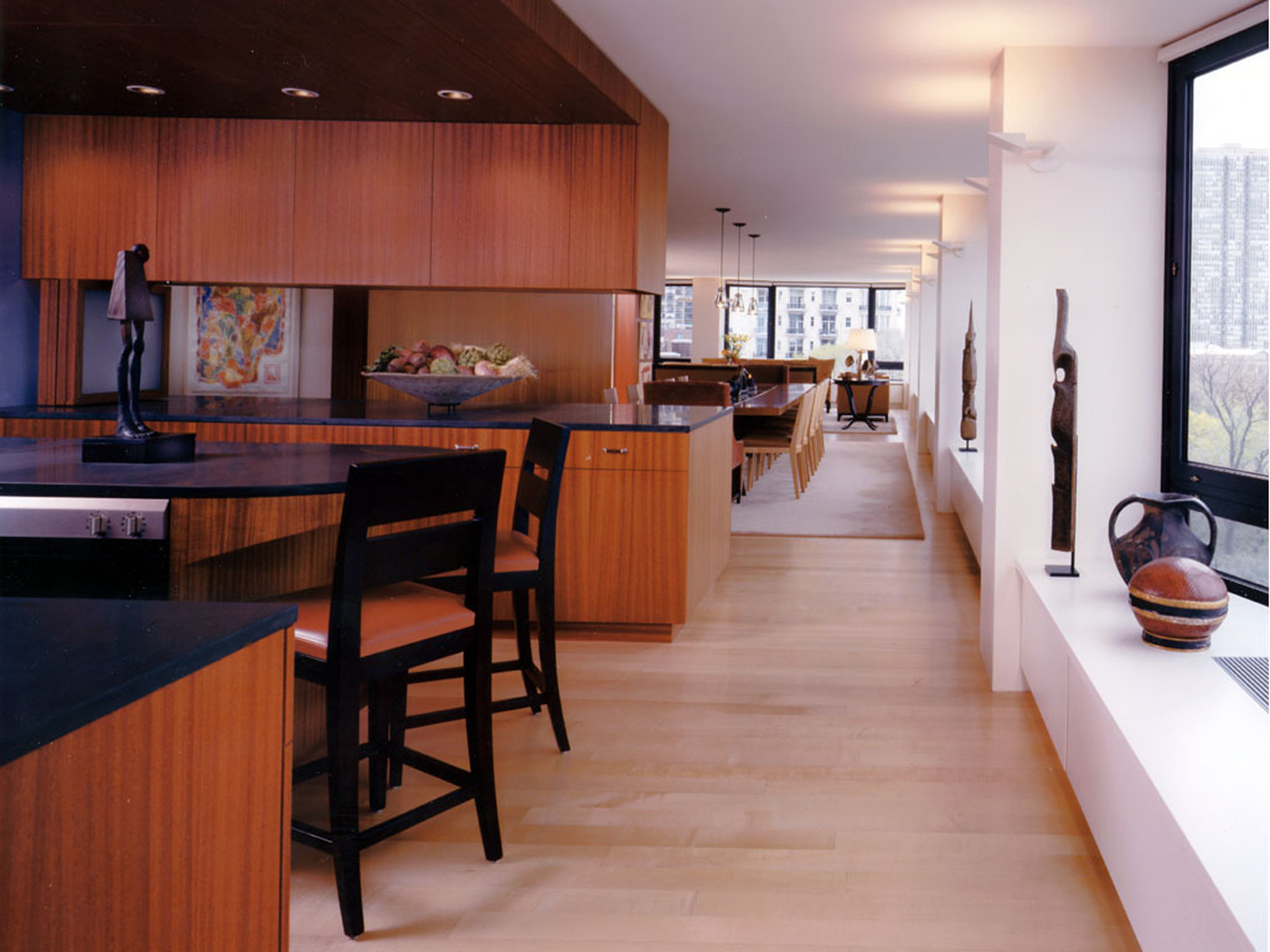 This 7500 sf duplex condominium apartment located in a high-rise overlooking Lincoln Park includes a single 6000 sf floor plate and a 1500sf upper level. Limited by the concrete floor and concrete ceiling to a 7ft 10in finished ceiling height, the goal was to create a gracious and open living space for a family of five.