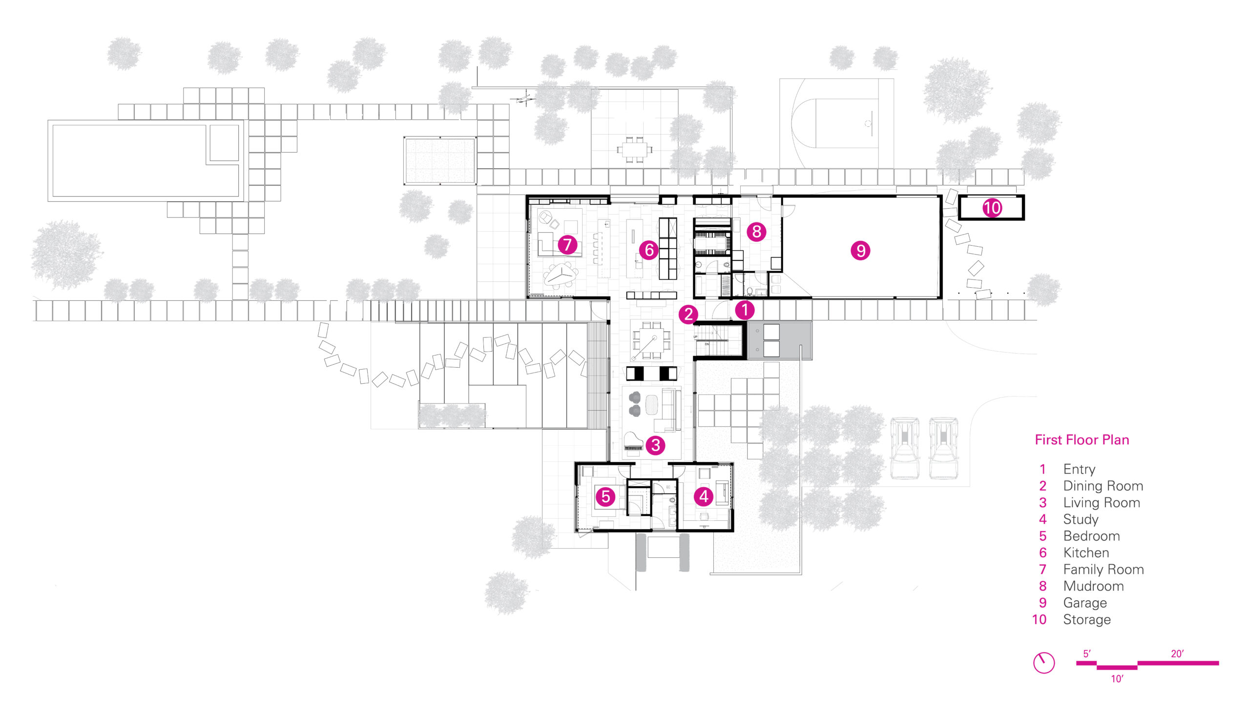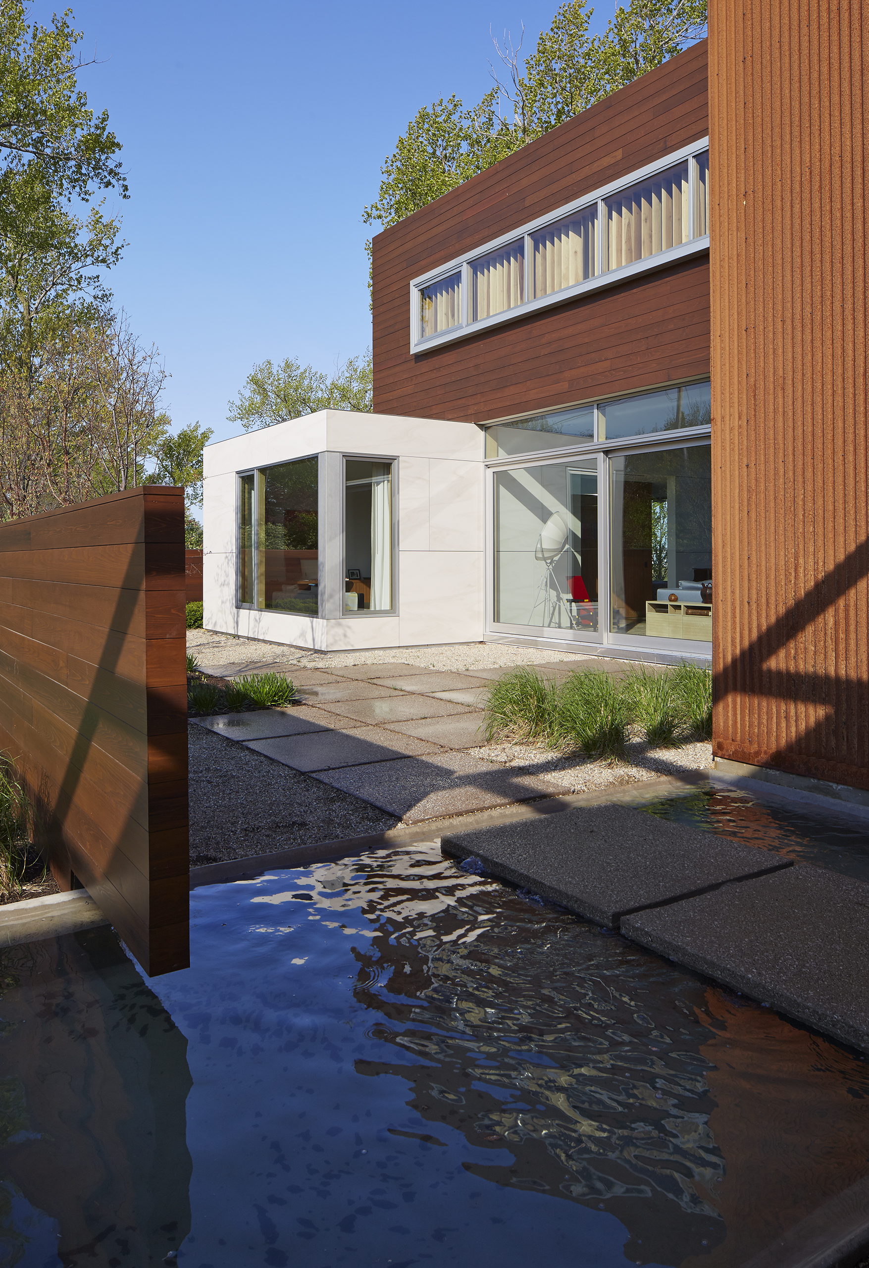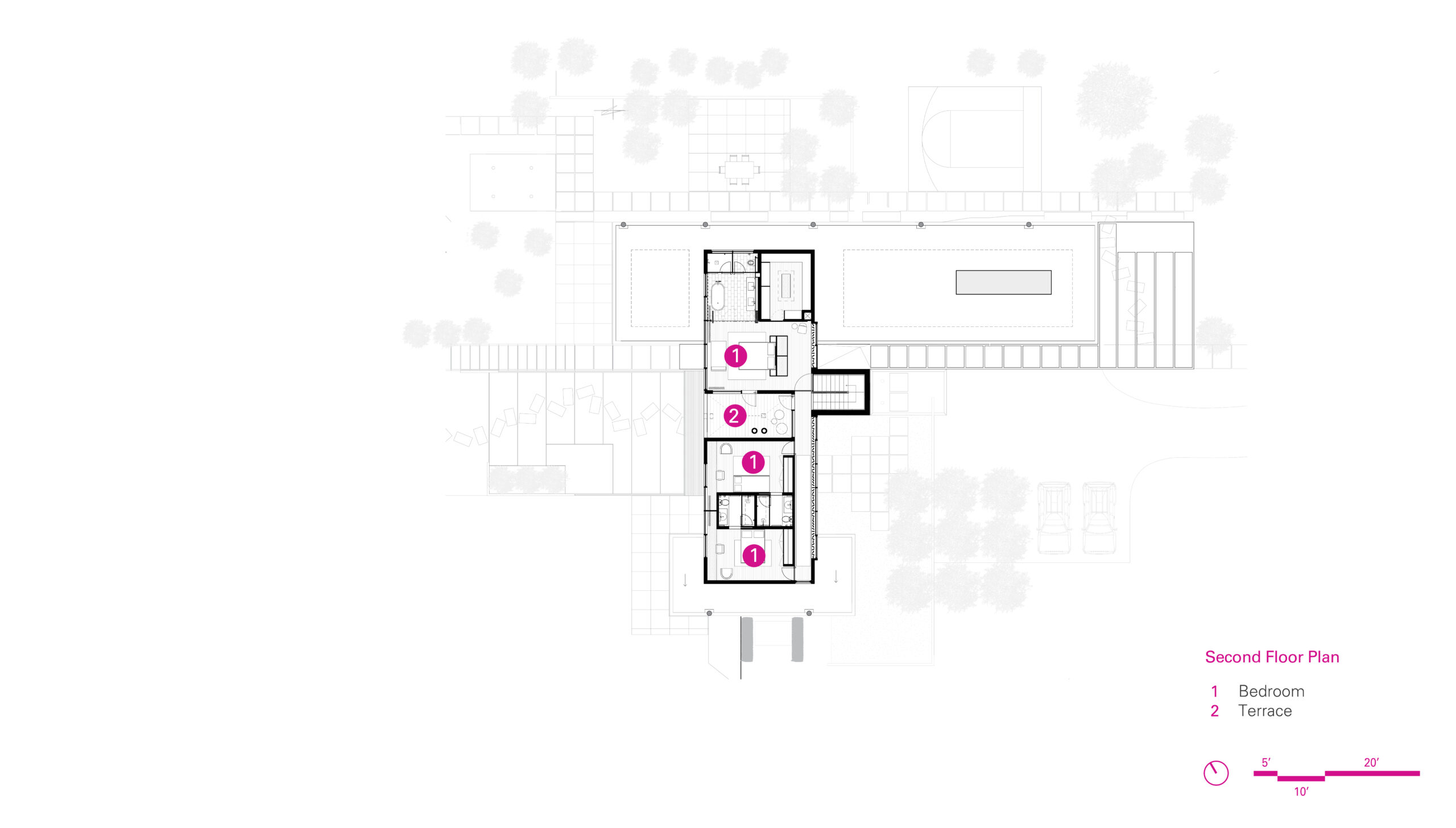 Secondary architectural elements are introduced, (trellis, screen wall, stepped garden, screened pavilion) extending the house into the landscape, and back. The resultant is a deliberate sequence of domesticated spaces of varied scales, each with specific agendas, microclimates, sounds, smells, effects.