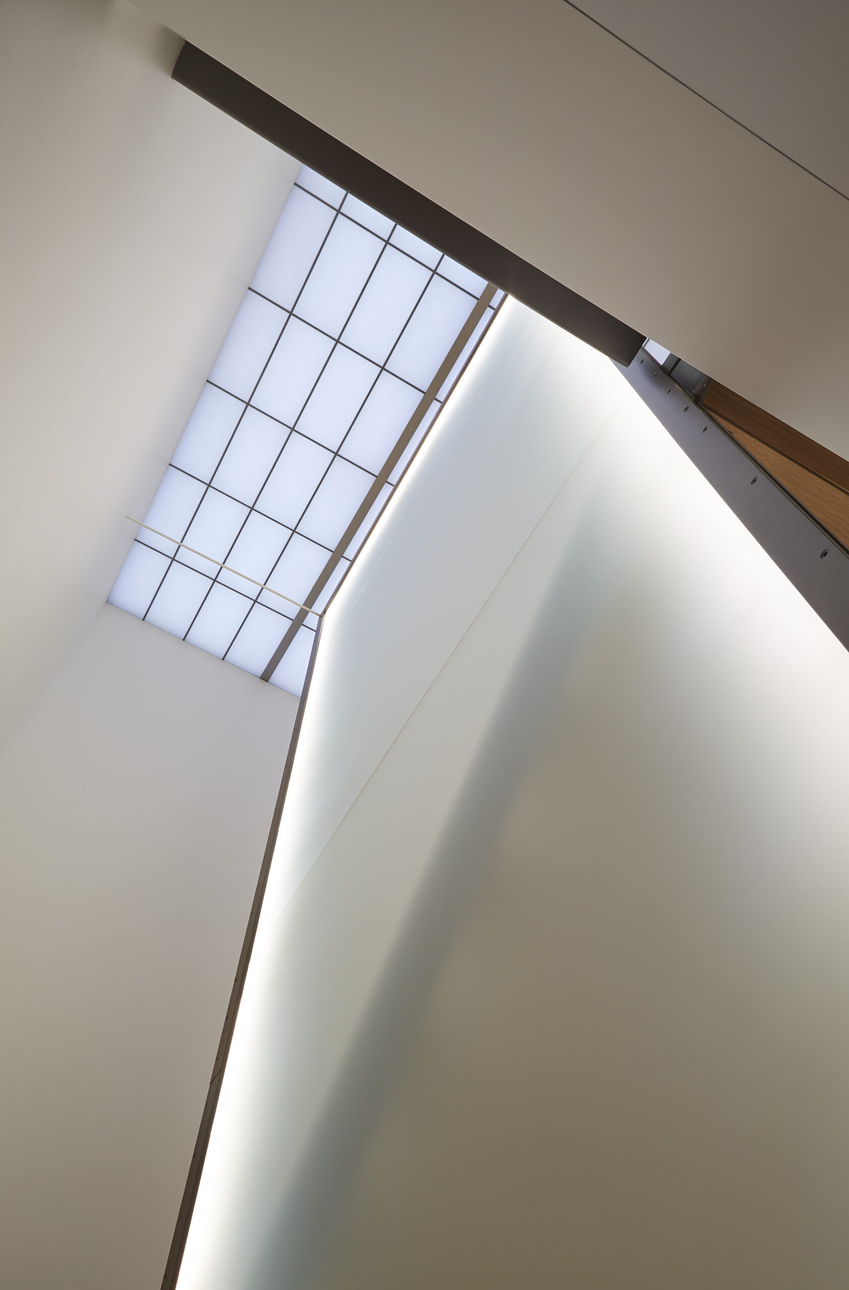 Two cross axis are laid down over a long rolling site – one extending and connective; one short, straddling the crest. A vertical shaft of weathering steel (seemingly roofless) is placed to mark the crossing. Three primary horizontal protective volumes are then placed, two on the ground (of porcelain), one bridging overhead (of wood). The resultant void becomes the fourth, most public volume.