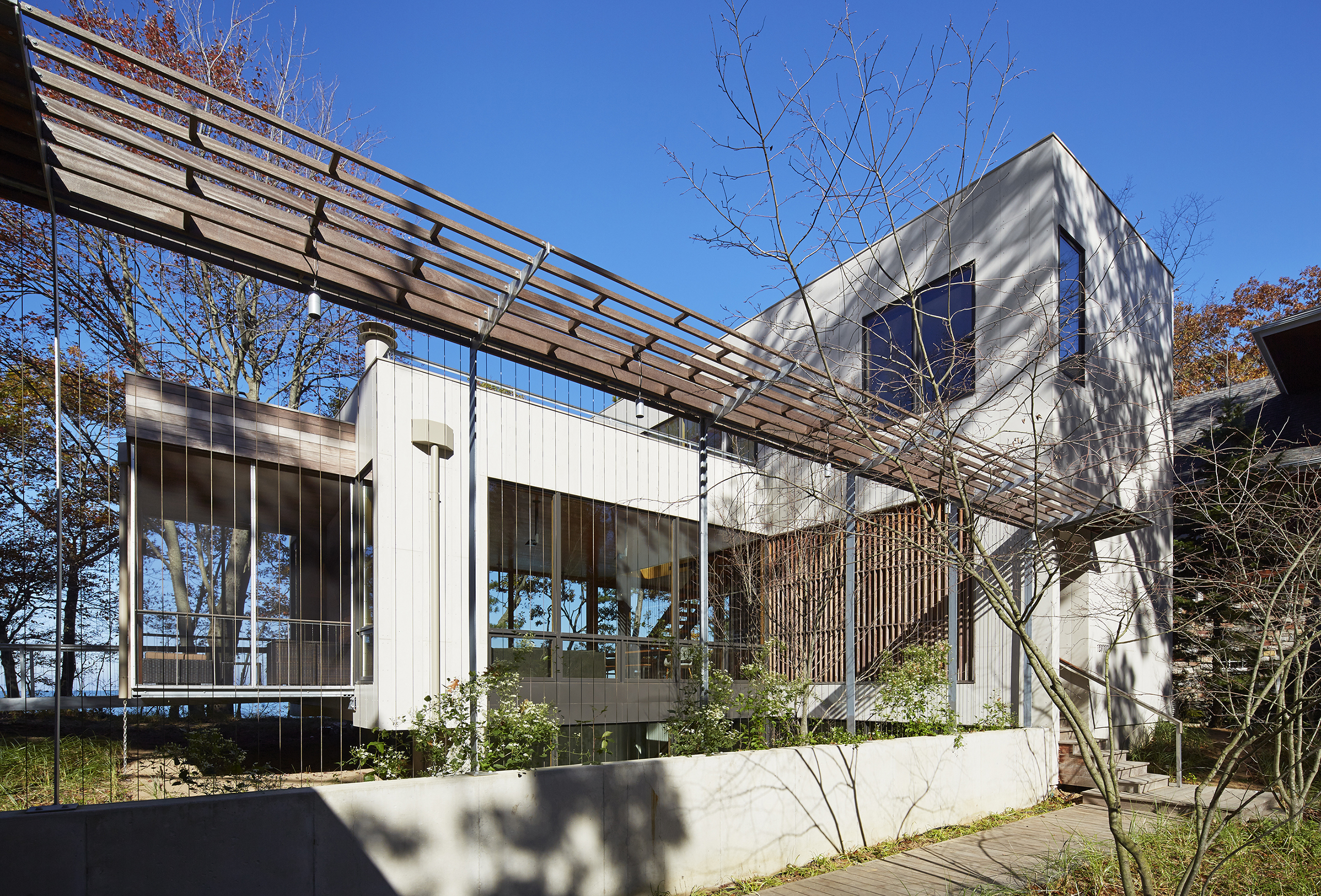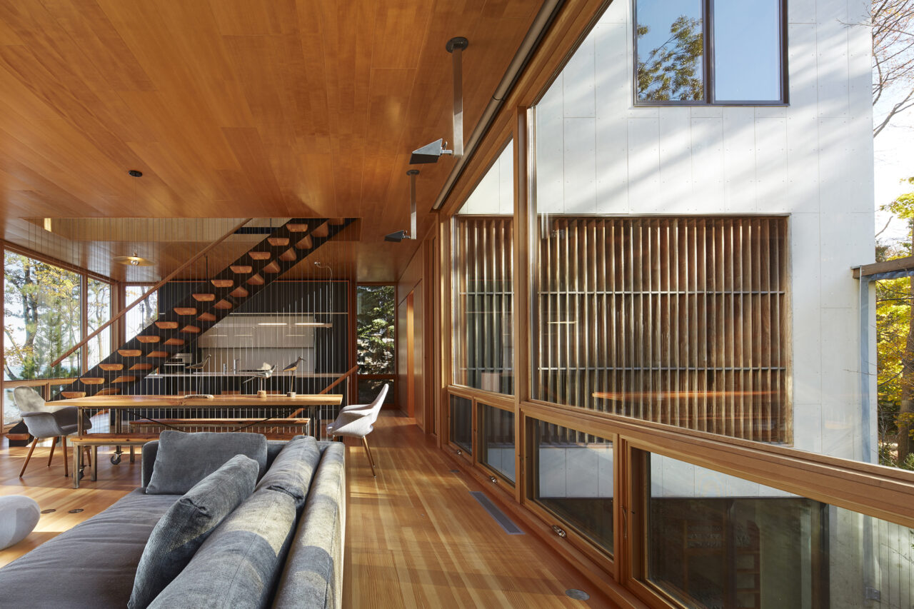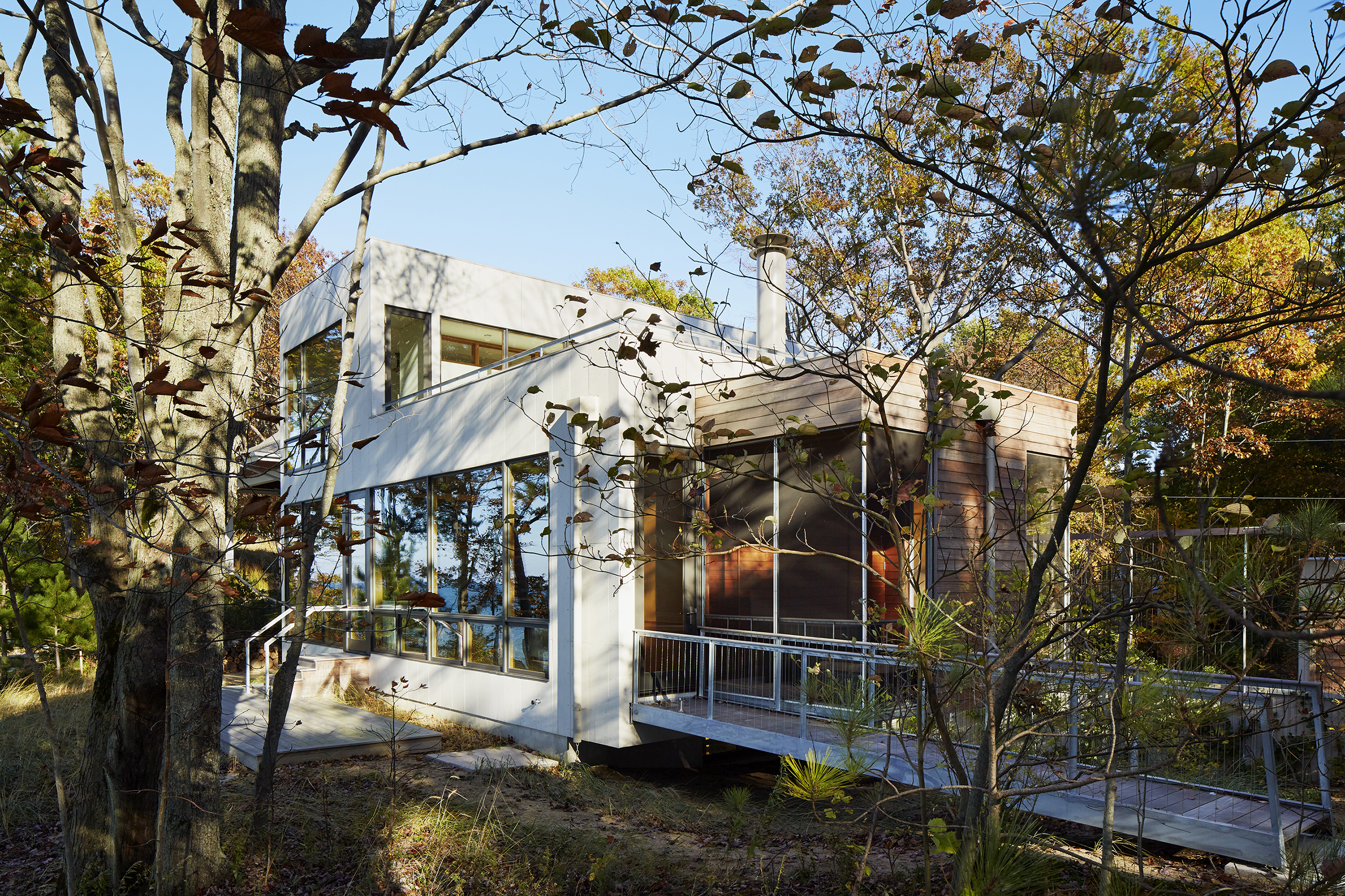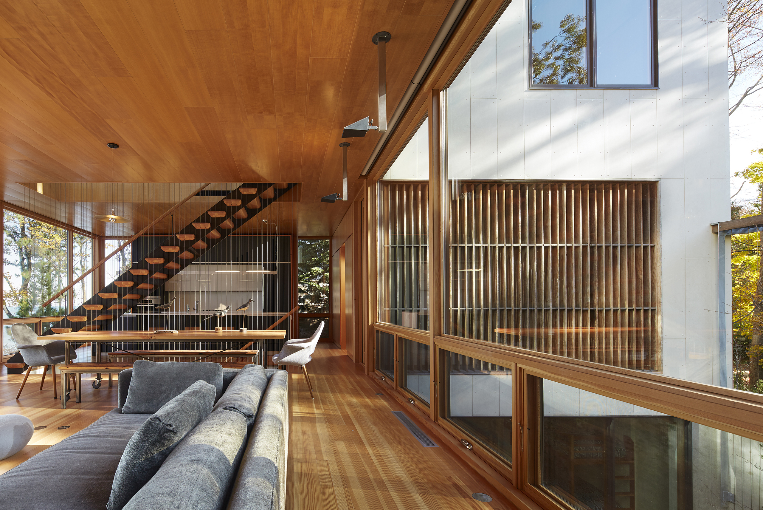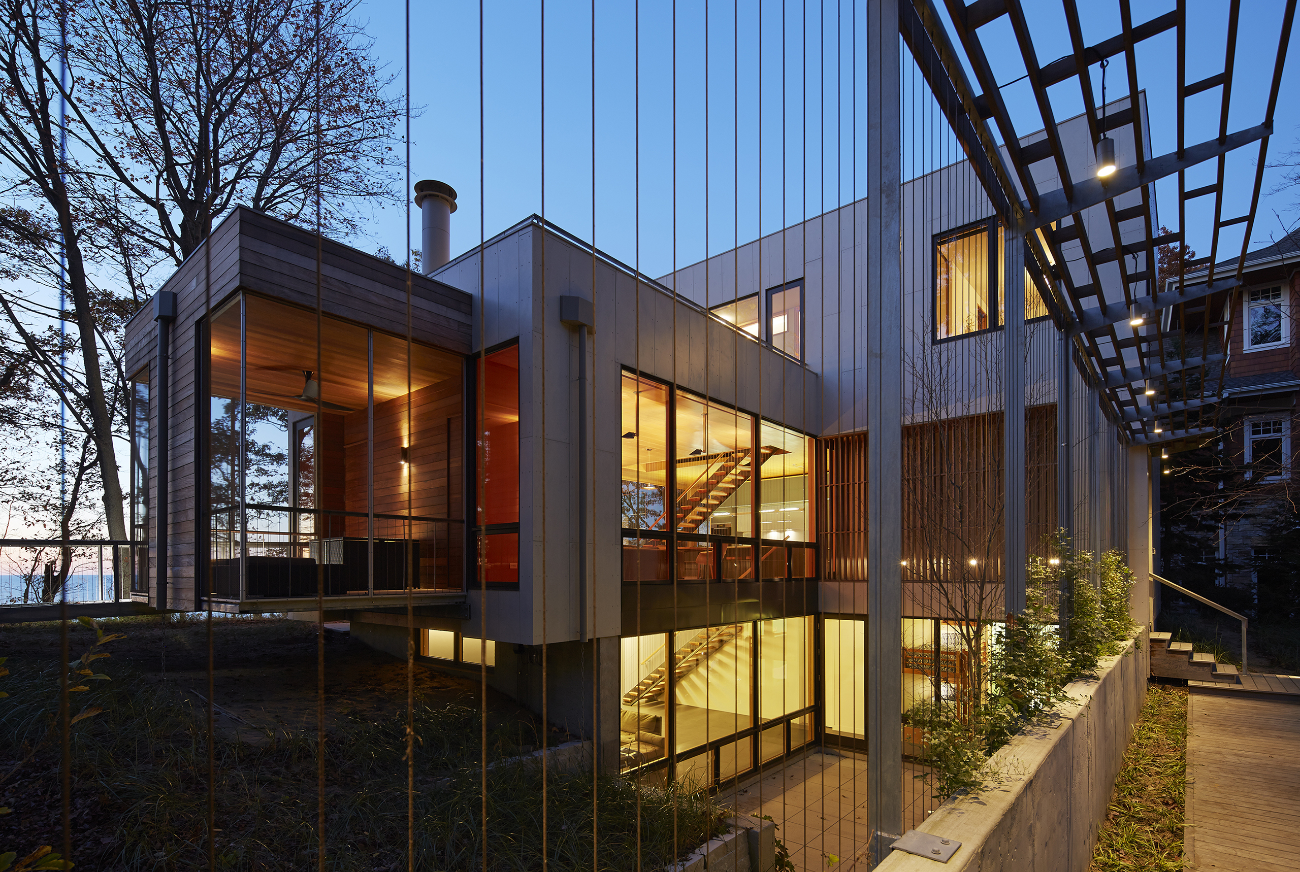 A sequence of layered planes, textures and spaces achieve a balance of privacy and openness to the outdoors. The two-story, opaque volume parallels the adjacent property to provide seclusion while the public, glassy volume bridges the lake-side beach landscape and the road-side wooded landscape. A sunken sun-court formed by the alternating forms gathers natural light for the rooms below and provides a quiet, sheltered environment in contrast to the wind, noise and high energy environment of the kinetic lake.