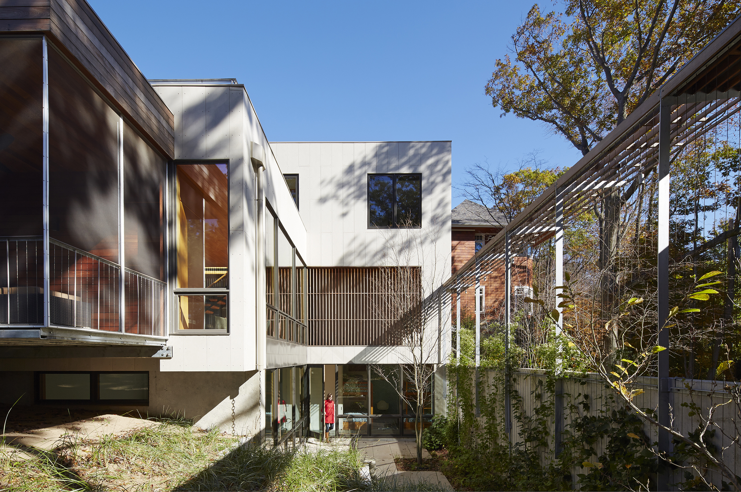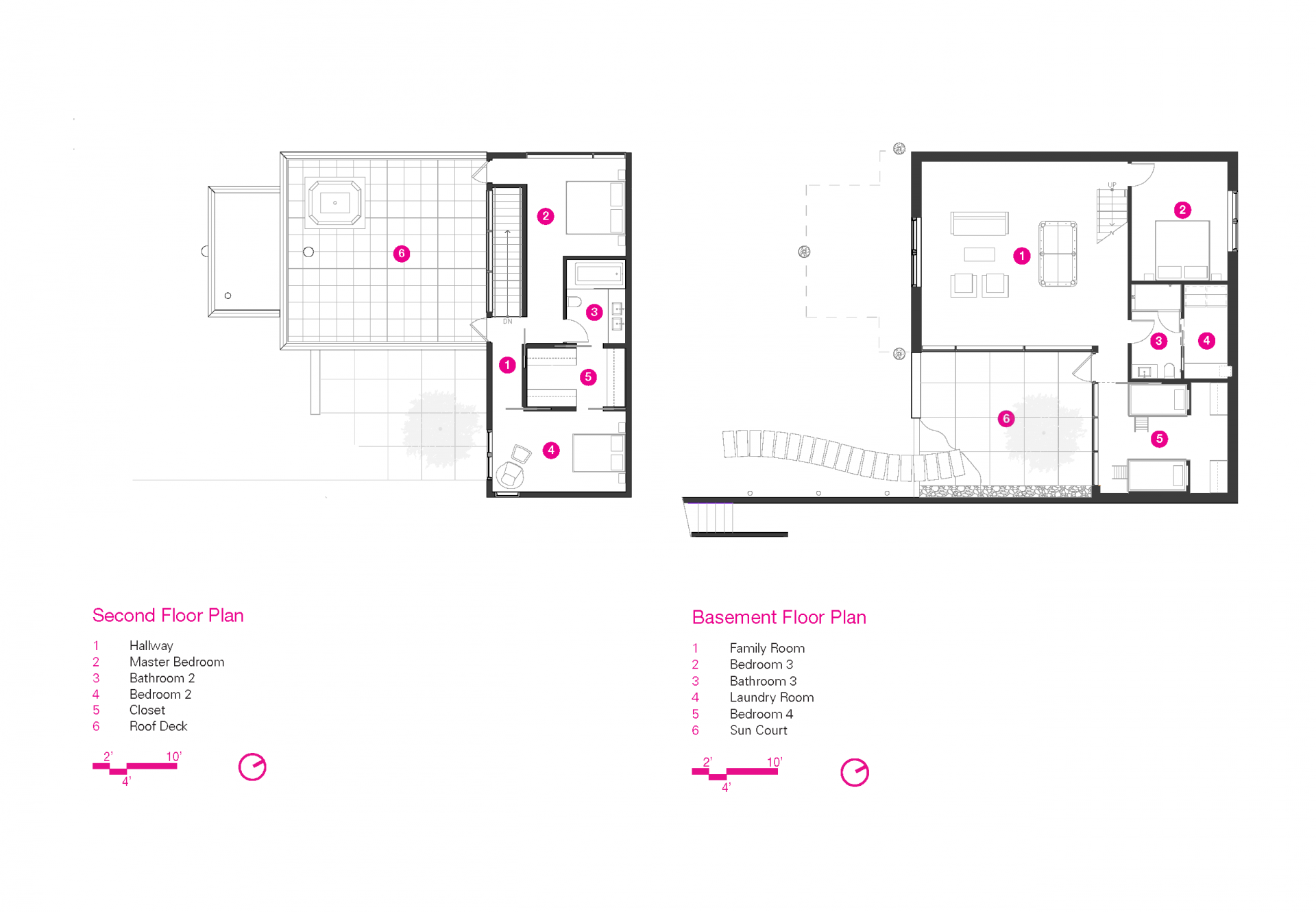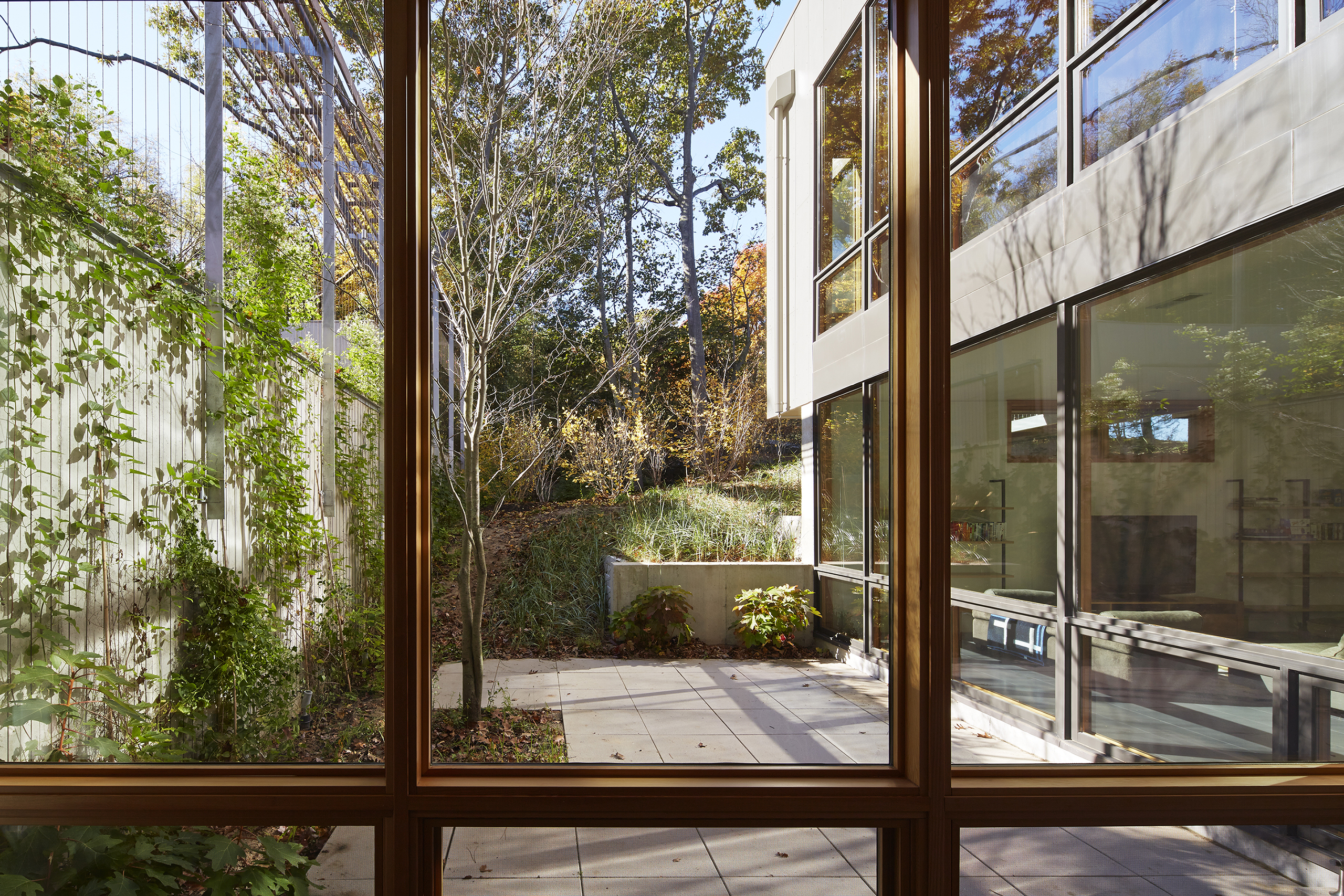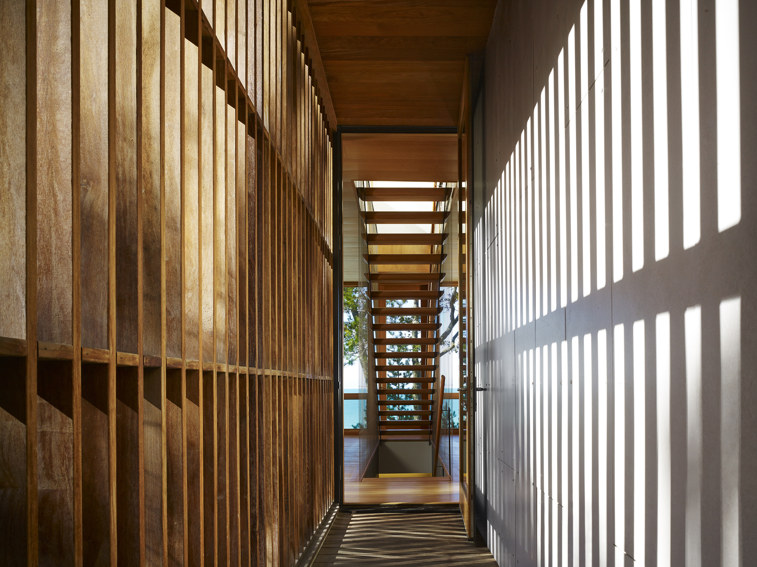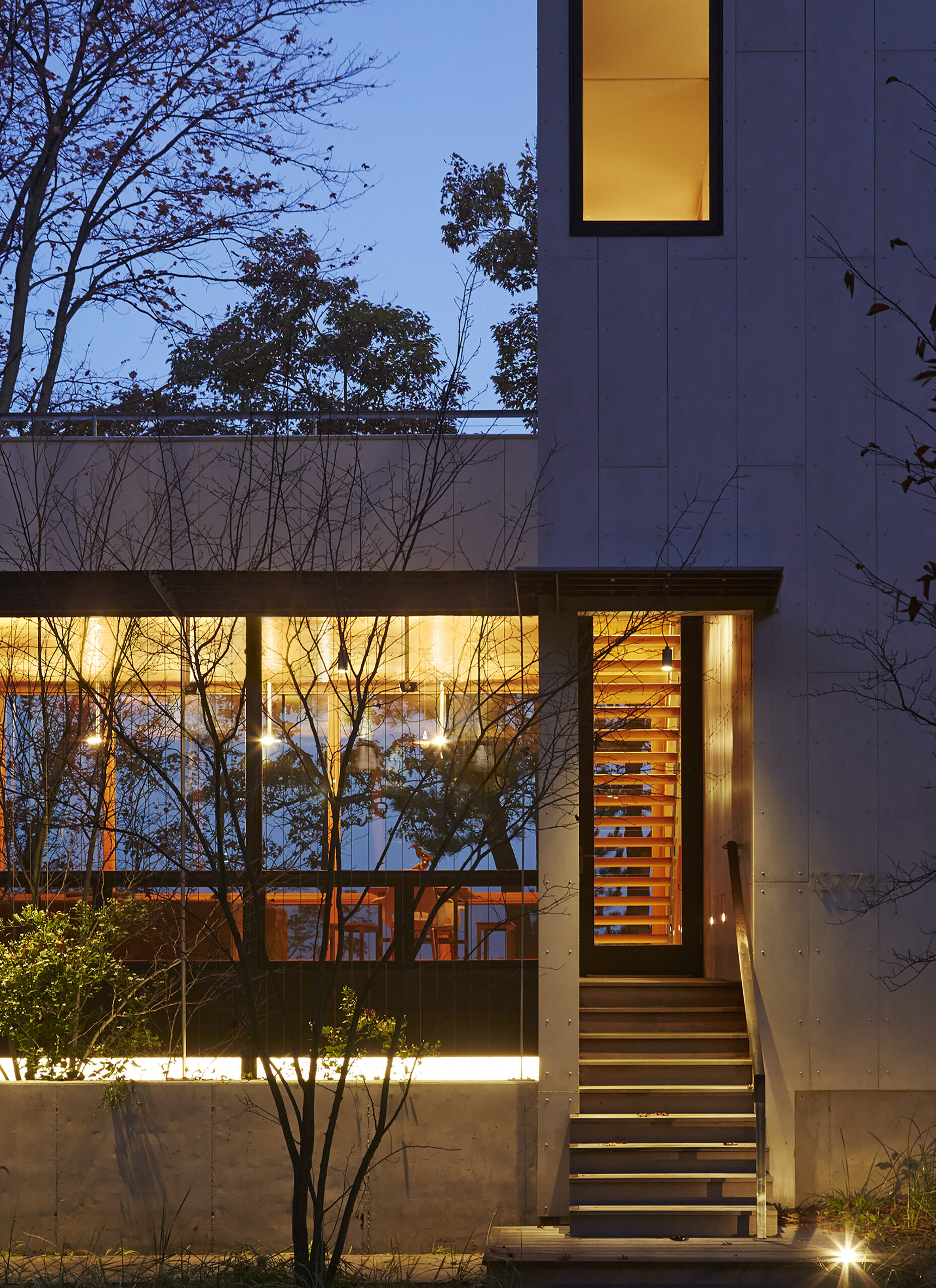 A sequence of layered planes, textures and spaces achieve a balance of privacy and openness to the outdoors. The two-story, opaque volume parallels the adjacent property to provide seclusion while the public, glassy volume bridges the lake-side beach landscape and the road-side wooded landscape. A sunken sun-court formed by the alternating forms gathers natural light for the rooms below and provides a quiet, sheltered environment in contrast to the wind, noise and high energy environment of the kinetic lake.