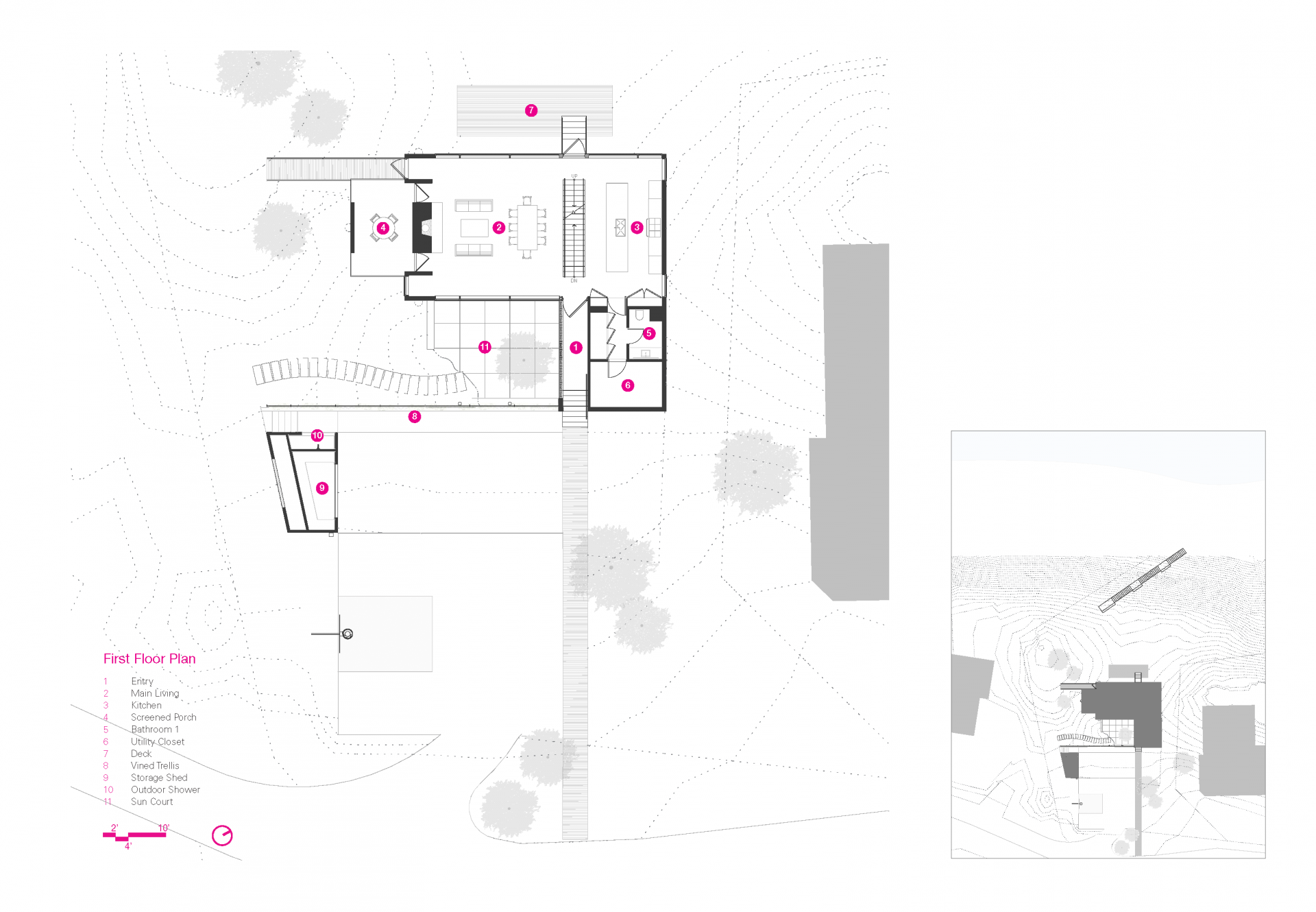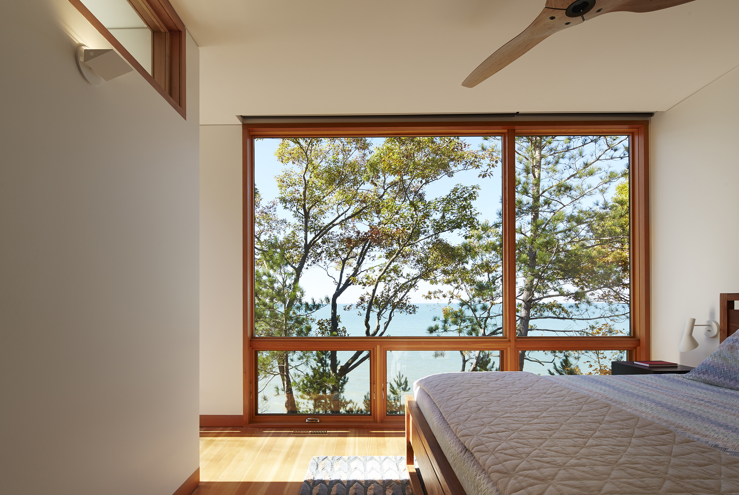 The site context informed the arrangement of the home. With a pronounced, sloping, dune topography and sizeable neighboring house to the east, the design entails two shifting volumes that maximize southern exposure, privacy, and diverse environments to enjoy. The home is positioned on the inland-side of the dune crest to maintain the integrity of the dune, and take advantage of the prow-like position for expansive views of the lake.