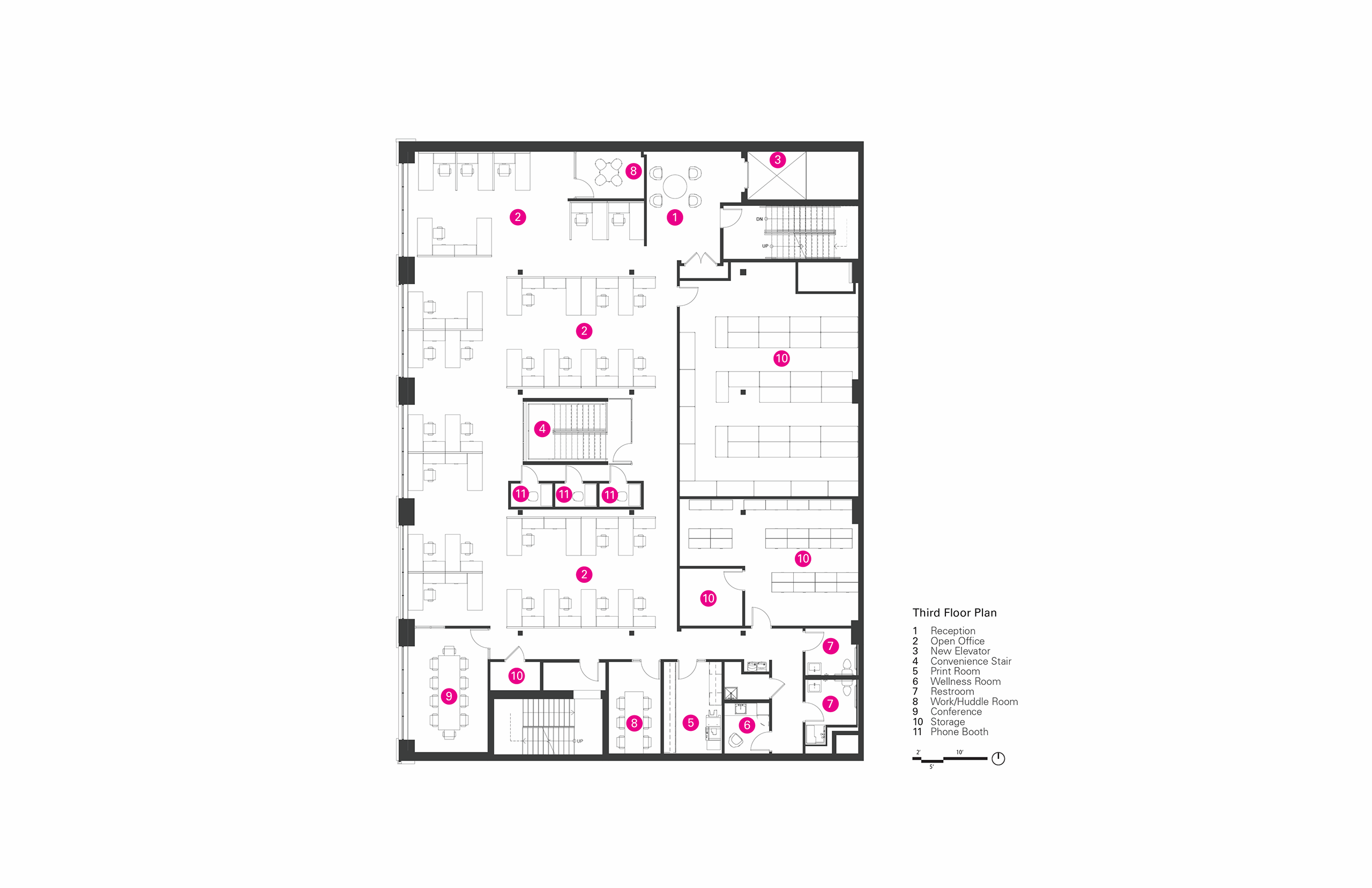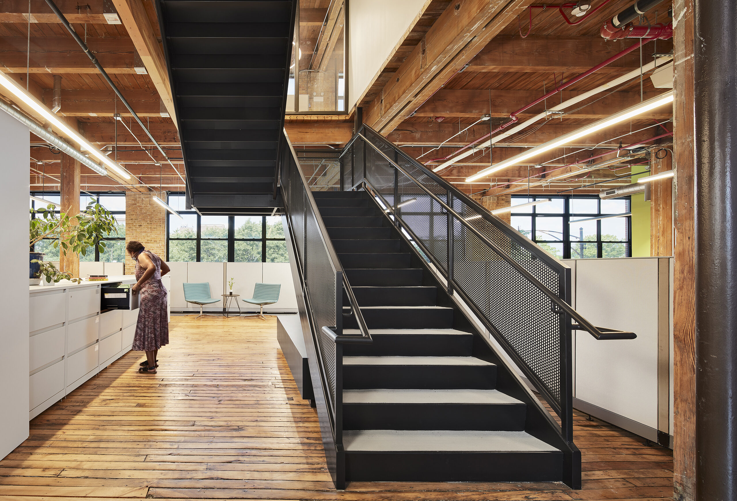 The second and third floors are home to the administrative offices, where employees and volunteers can now comfortably meet under one roof. Here, a new suspended metal stair serves as the primary architectural element, connecting the floors visually and physically, further promoting the organization’s core values of openness, collaboration and human connection.