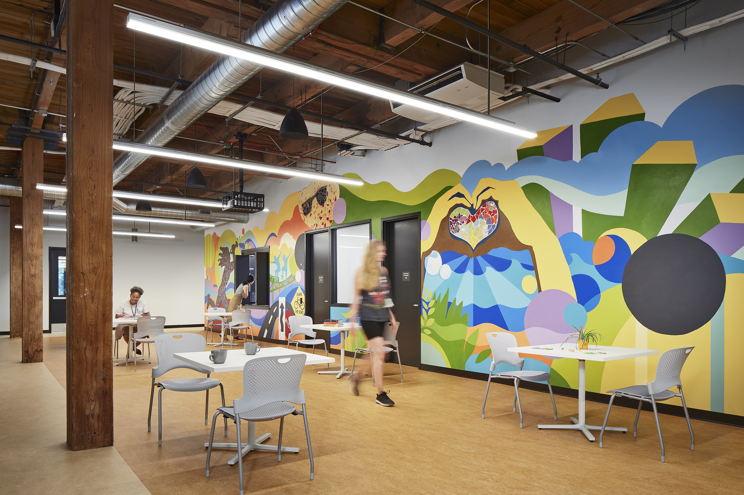 The vibrant mural wall in the central dining space embodies the organization’s commitment to supporting and uplifting those in need. This colorful artwork, designed by the local nonprofit Marwen, also provides a glimpse into the serving kitchen, where essential nourishment and care extend to individuals experiencing homelessness.