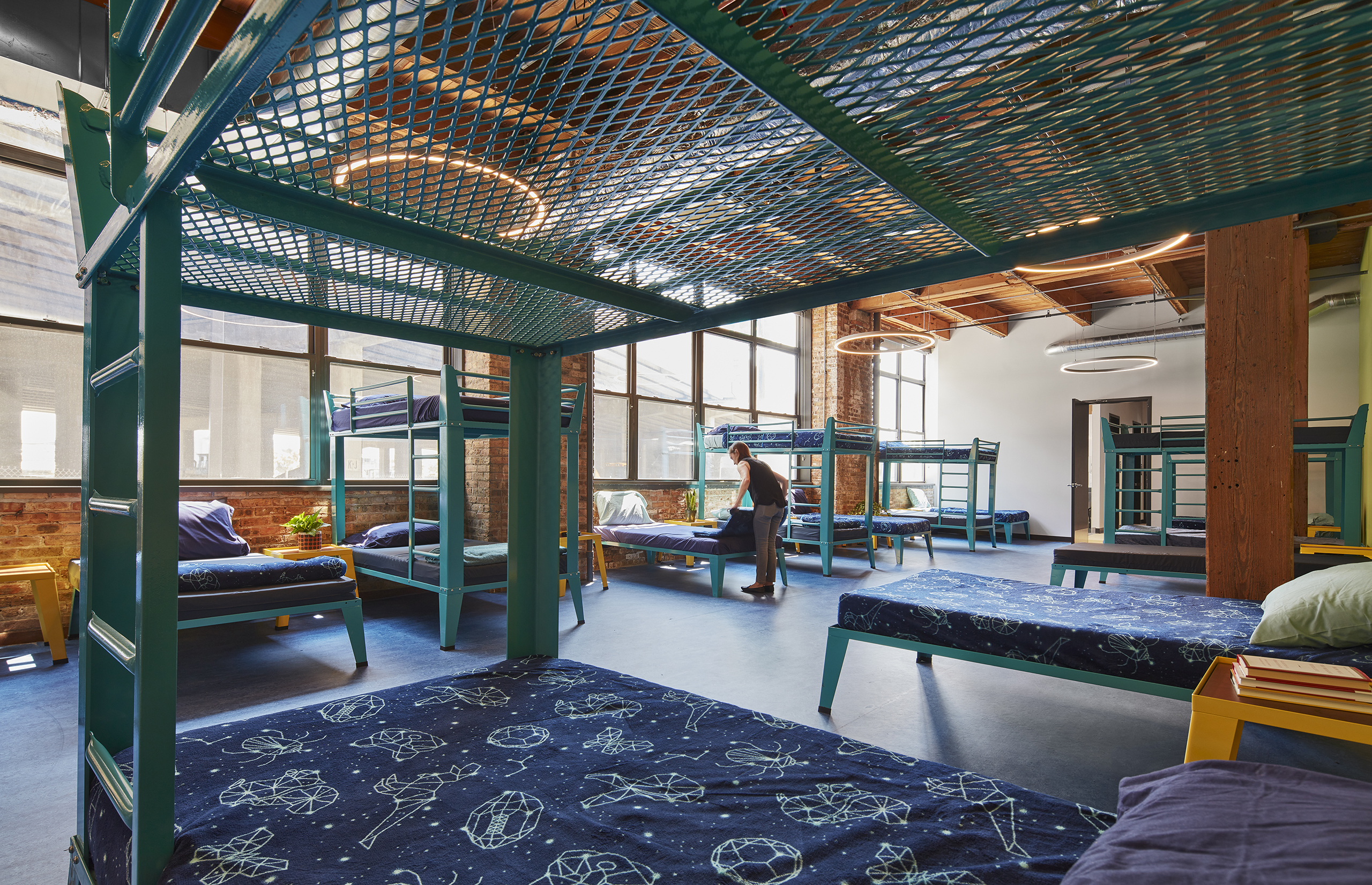 To reinforce feelings of security, safety, and privacy, a new entrance created from a former loading dock welcomes overnight guests on the side of the building away from the busy street; a large awning above and ramp provide protection and accessibility. Here and throughout, glass doors and windows are critical elements designed to build trust, allowing guests to glimpse inside before entering to further alleviate feelings of stress.