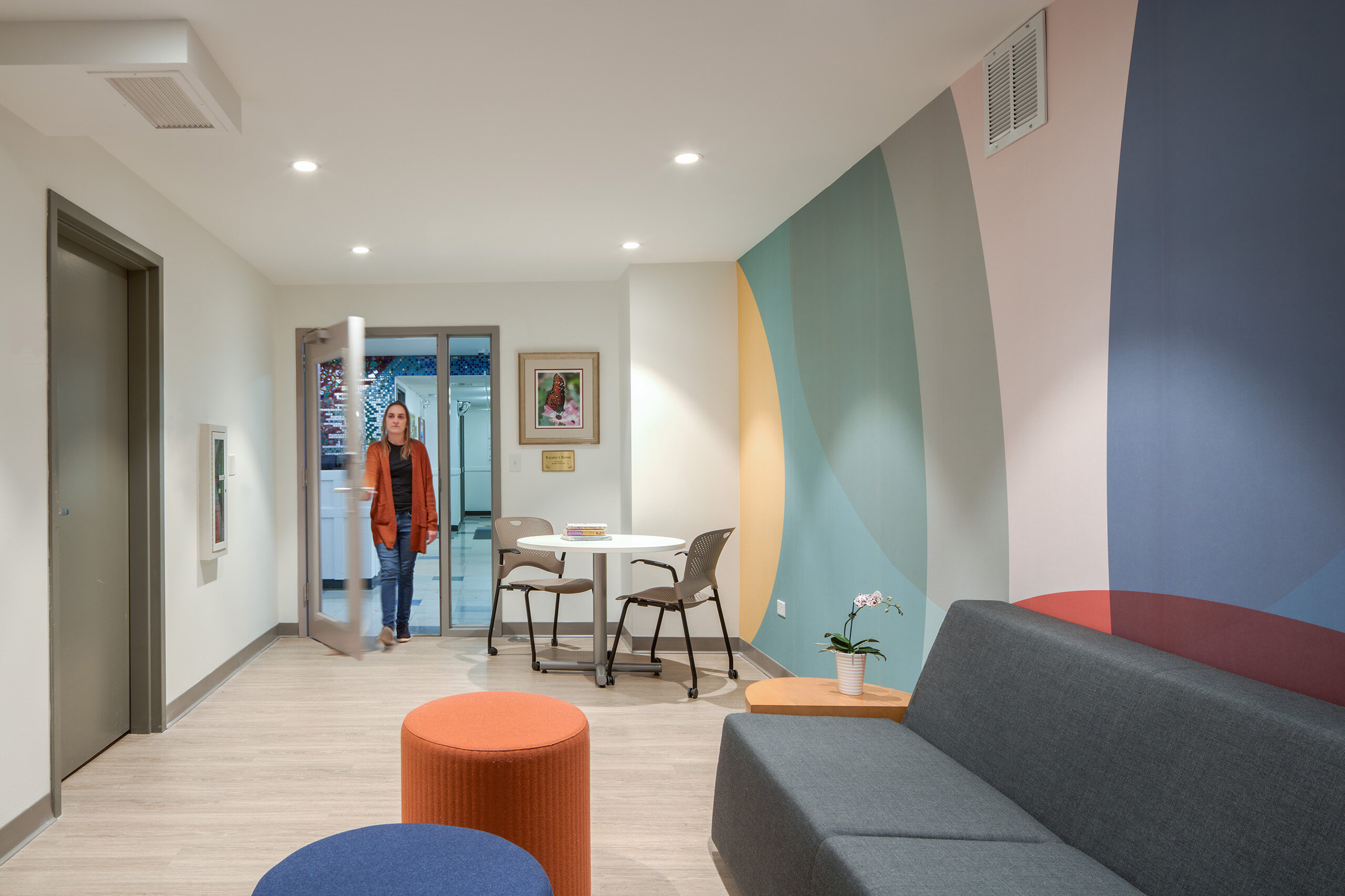 A large, underutilized staff meeting room on the first floor is reconfigured to create a visitation room and a smaller staff conference/meeting space. The conference space is a dedicated room for clients and staff on-site meetings. Lounge seating and a colorful feature wall in the visitation room create a safe and uplifting space for family members and friends to connect with new parents.