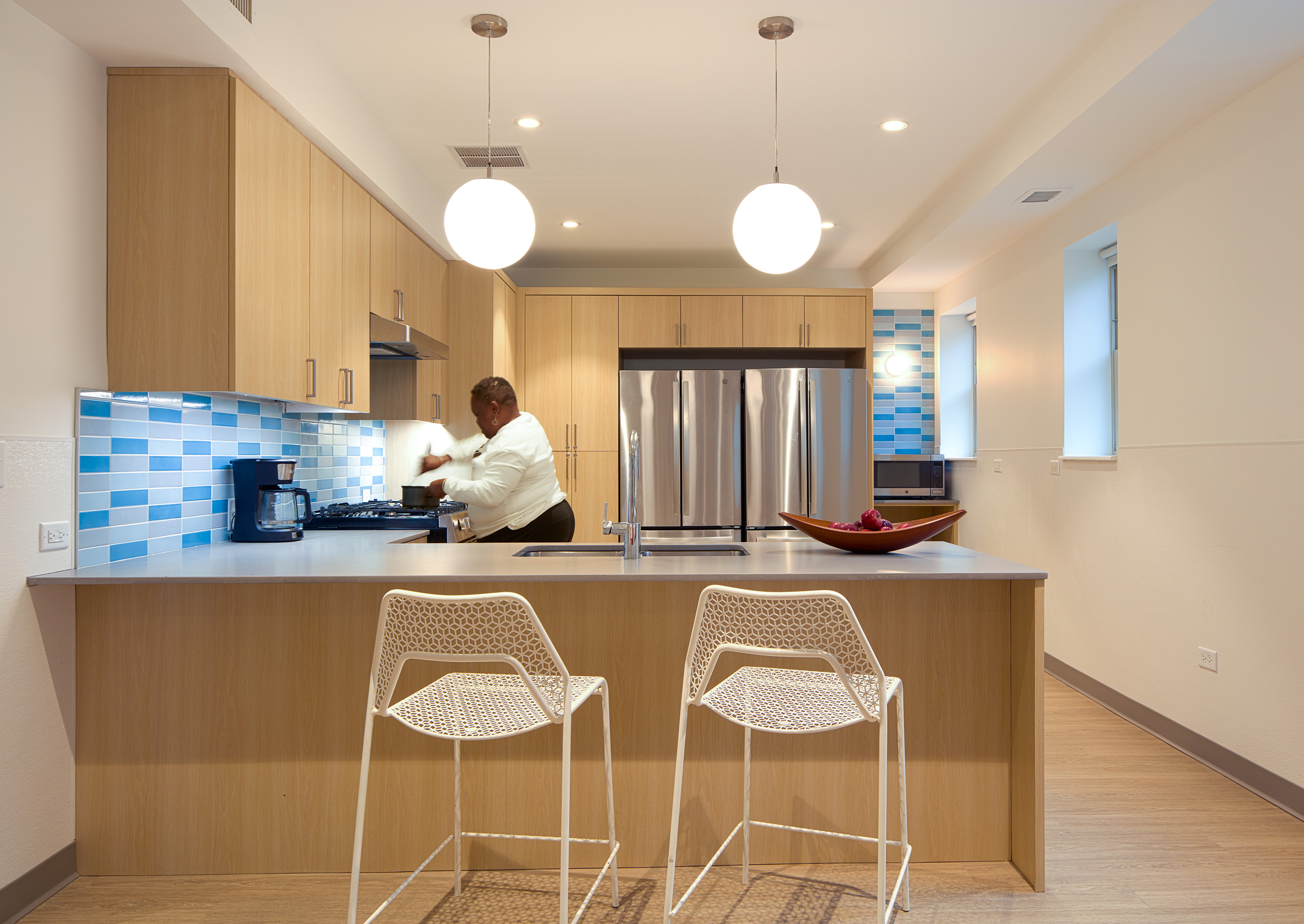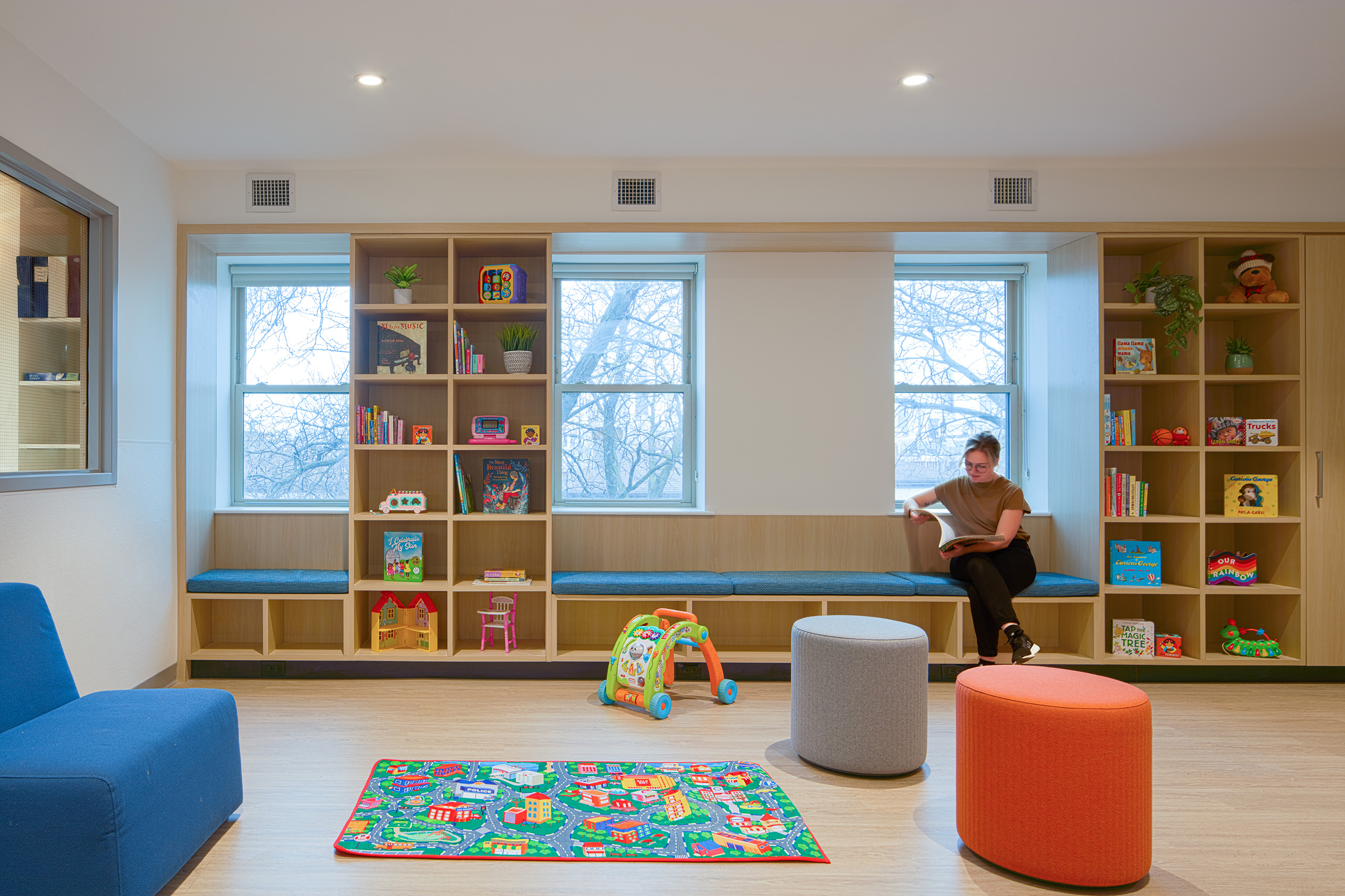 On the fourth floor, an existing kitchen is updated to have modern appliances and personal storage, with a new comfortable seating area for parents and their children. In the living room, comfortable and safe furnishings surrounded by a wall of built-in storage holding games, toys, and books, provide a place for rest and play. In addition, new laundry facilities better accommodate the new parents’ needs.