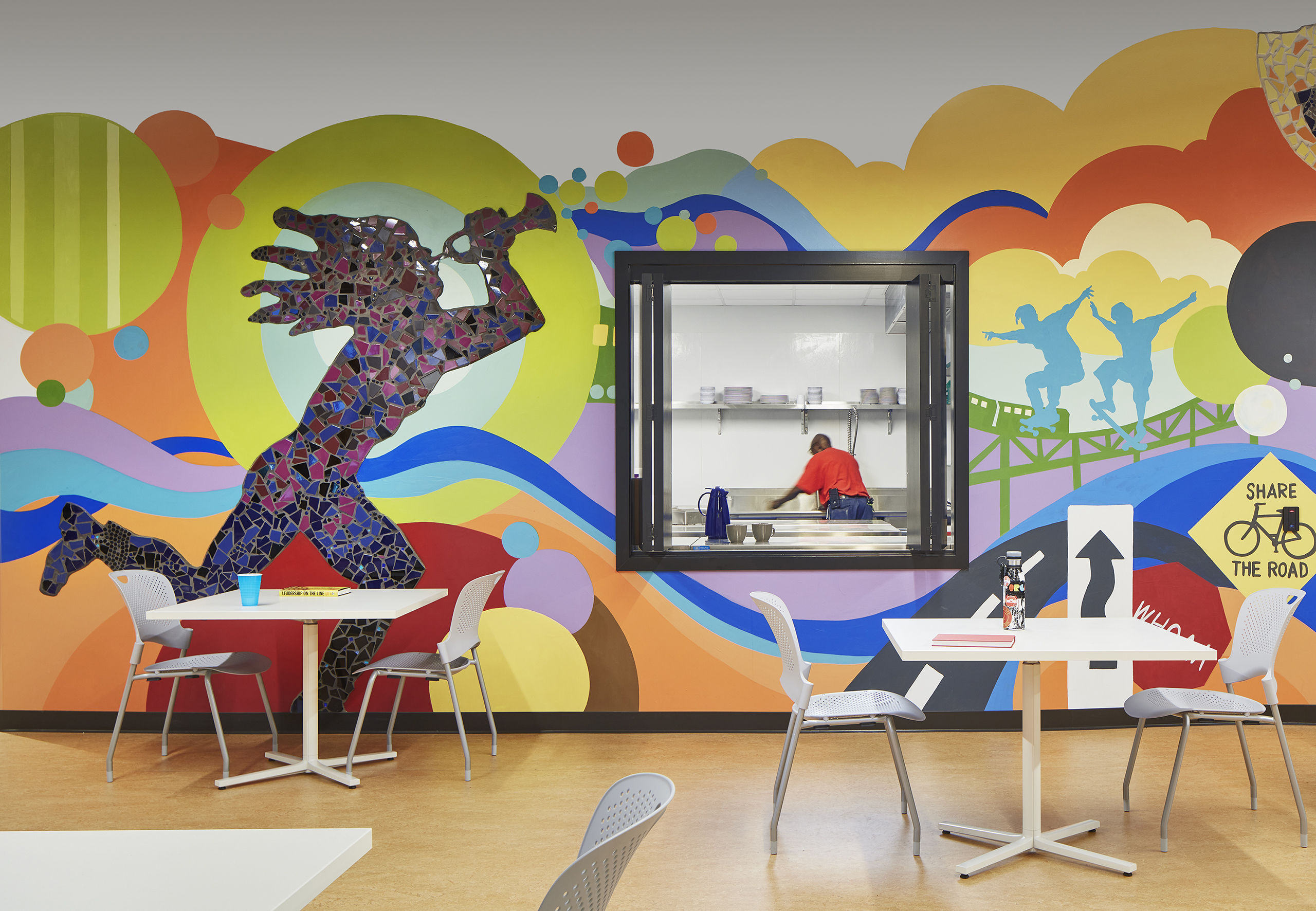 The vibrant mural wall in the central dining space embodies the organization’s commitment to supporting and uplifting those in need. This colorful artwork, designed by the local nonprofit Marwen, also provides a glimpse into the serving kitchen, where essential nourishment and care extend to individuals experiencing homelessness.