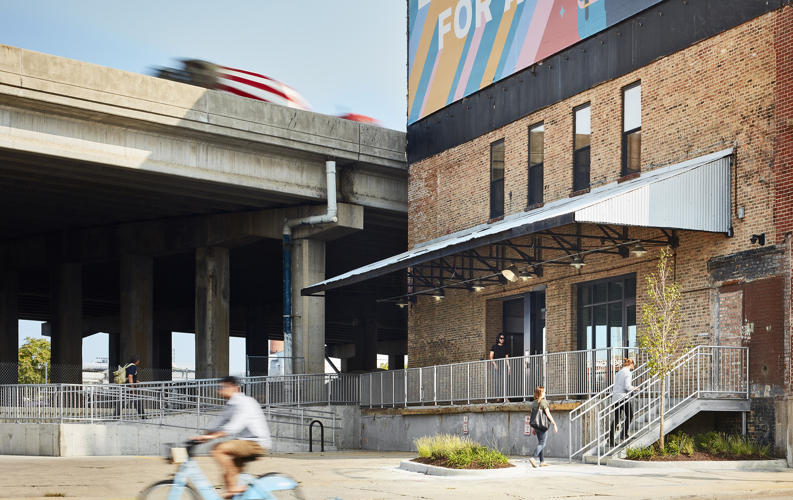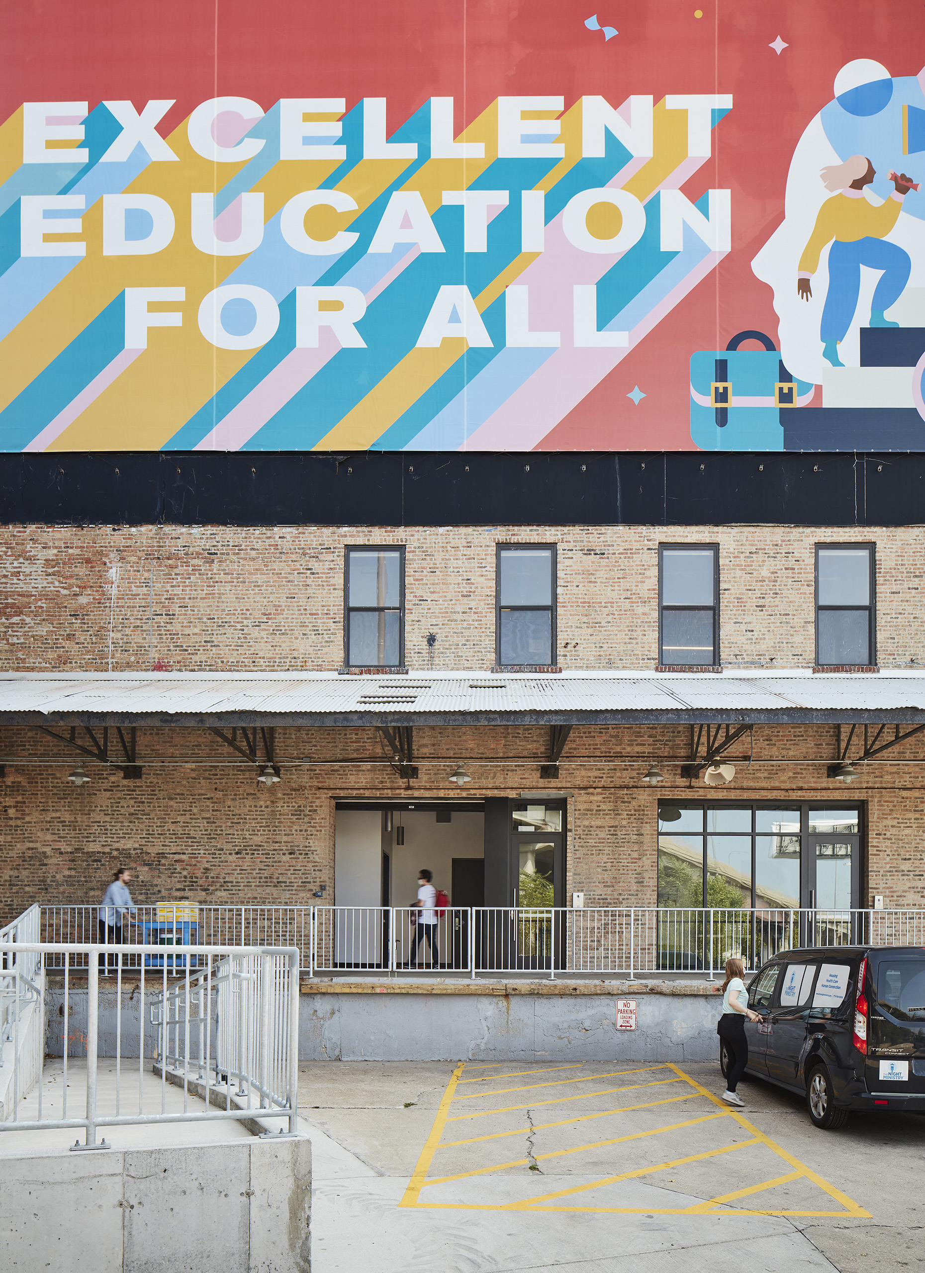 Three stories of a 1910 heavy-timber manufacturing building, known for the two-story exterior murals on three of its facades, are renovated to support the growing needs of the nonprofit organization providing housing, healthcare, and human connection to those experiencing homelessness.