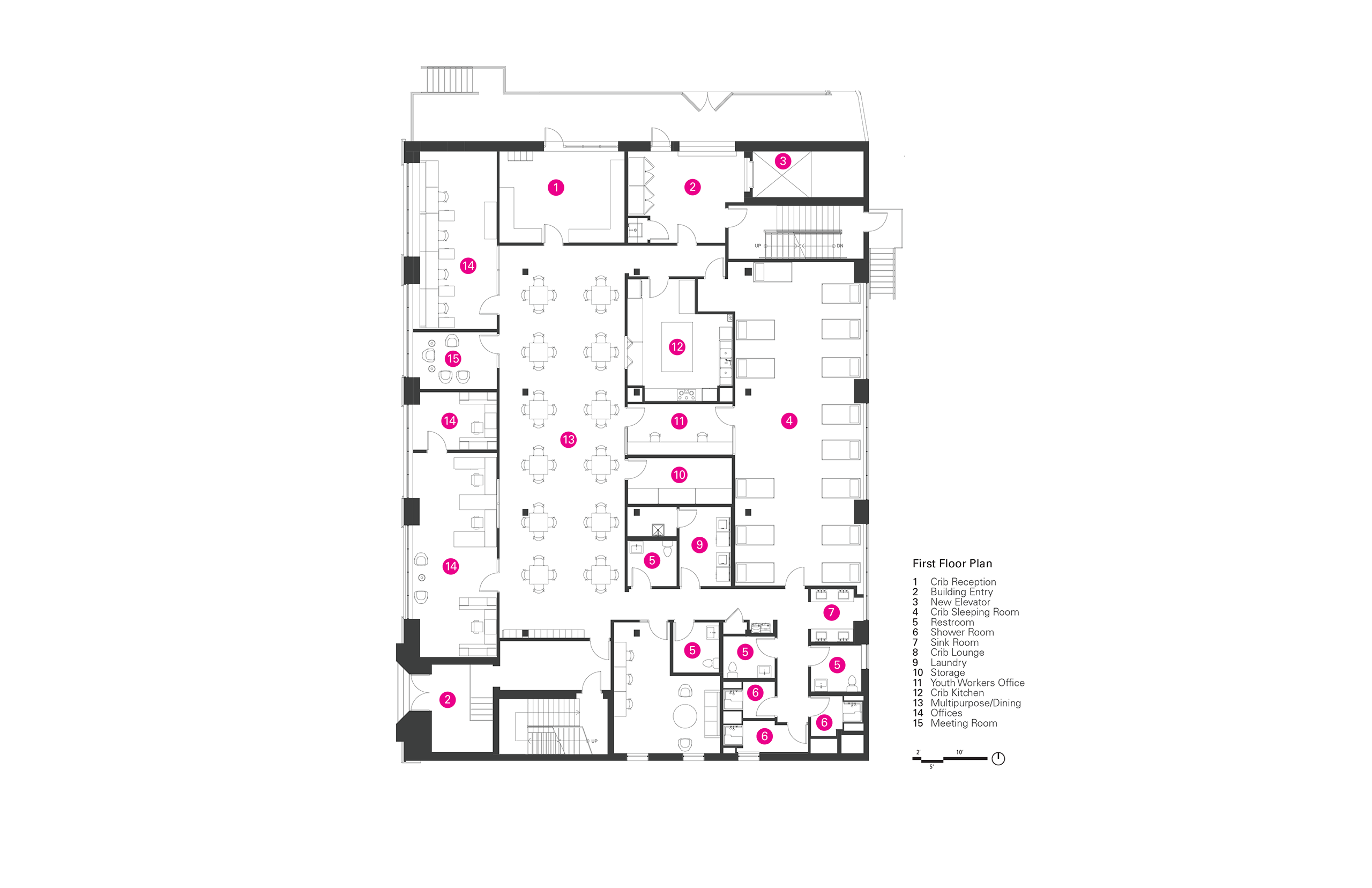 Inside “The Crib”, which operates on the first floor, corridor space is reduced to increase openness, visibility, and monitoring, thus promoting feelings of emotional and physical safety.