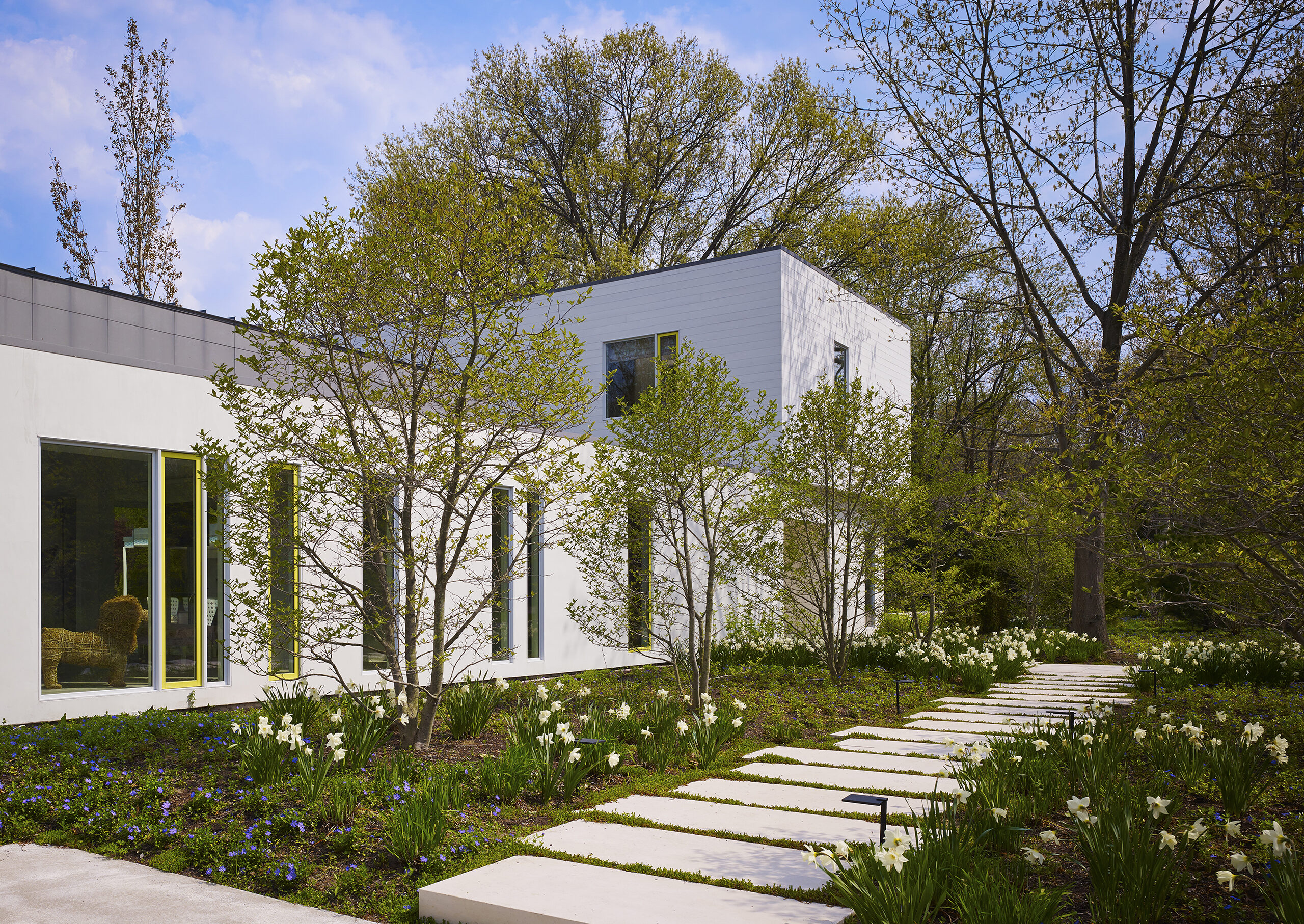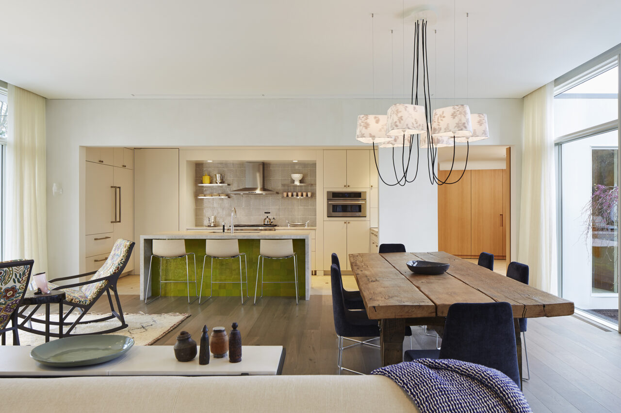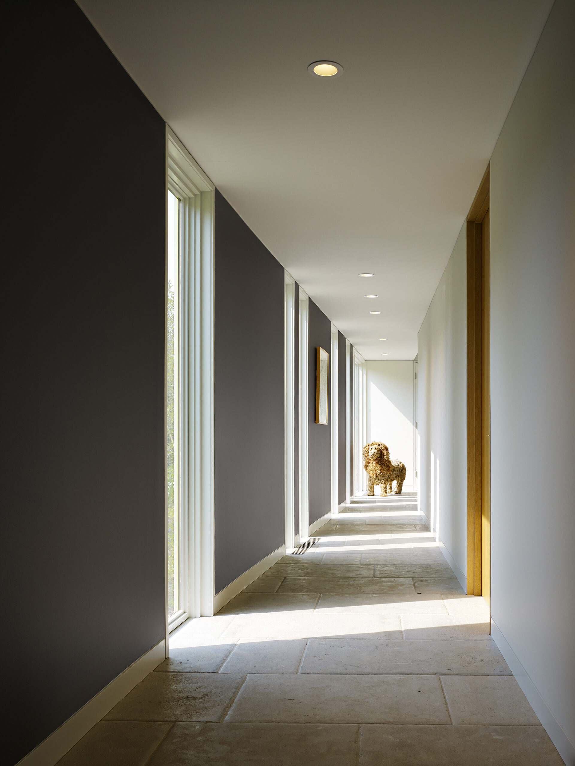 The owner was integrally involved in fine tuning the spirit of the house, particularly with finishes and furnishings. The bright palette of smooth white stucco, white stained flush wood siding, and weathered zinc metal cladding are contrasted against the lush green landscape. Operable window sashes are colored citron yellow and patterned tiles are randomly placed within the stone paving adding a touch of casual whimsy. As an extension of this theme, patterned tiles are randomly placed within the exterior and interior stone paving, floors and walls, in homage to the 1930’s era craft artisan Edgar Miller. The furnishings and art complete the theme with equally creative selection.