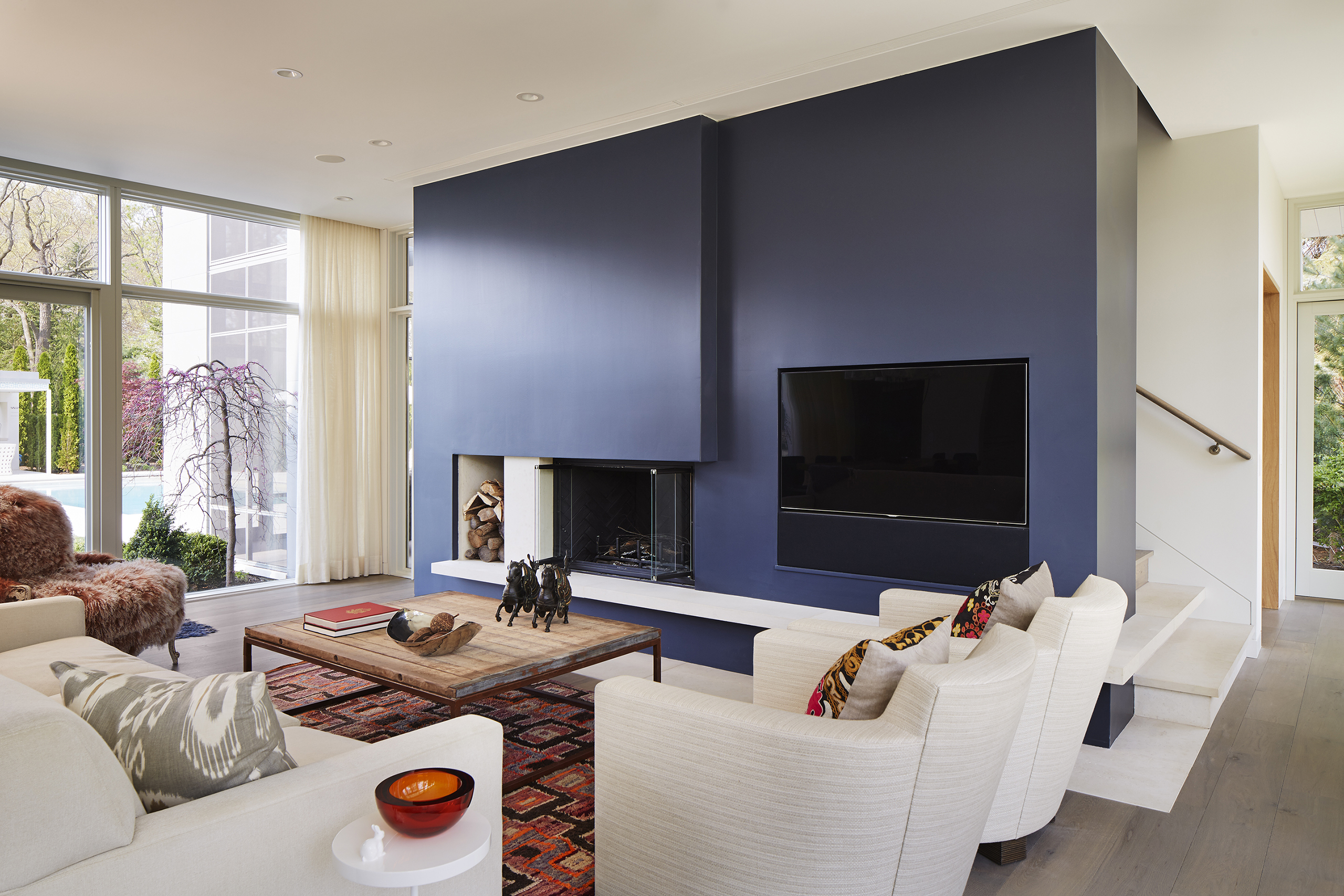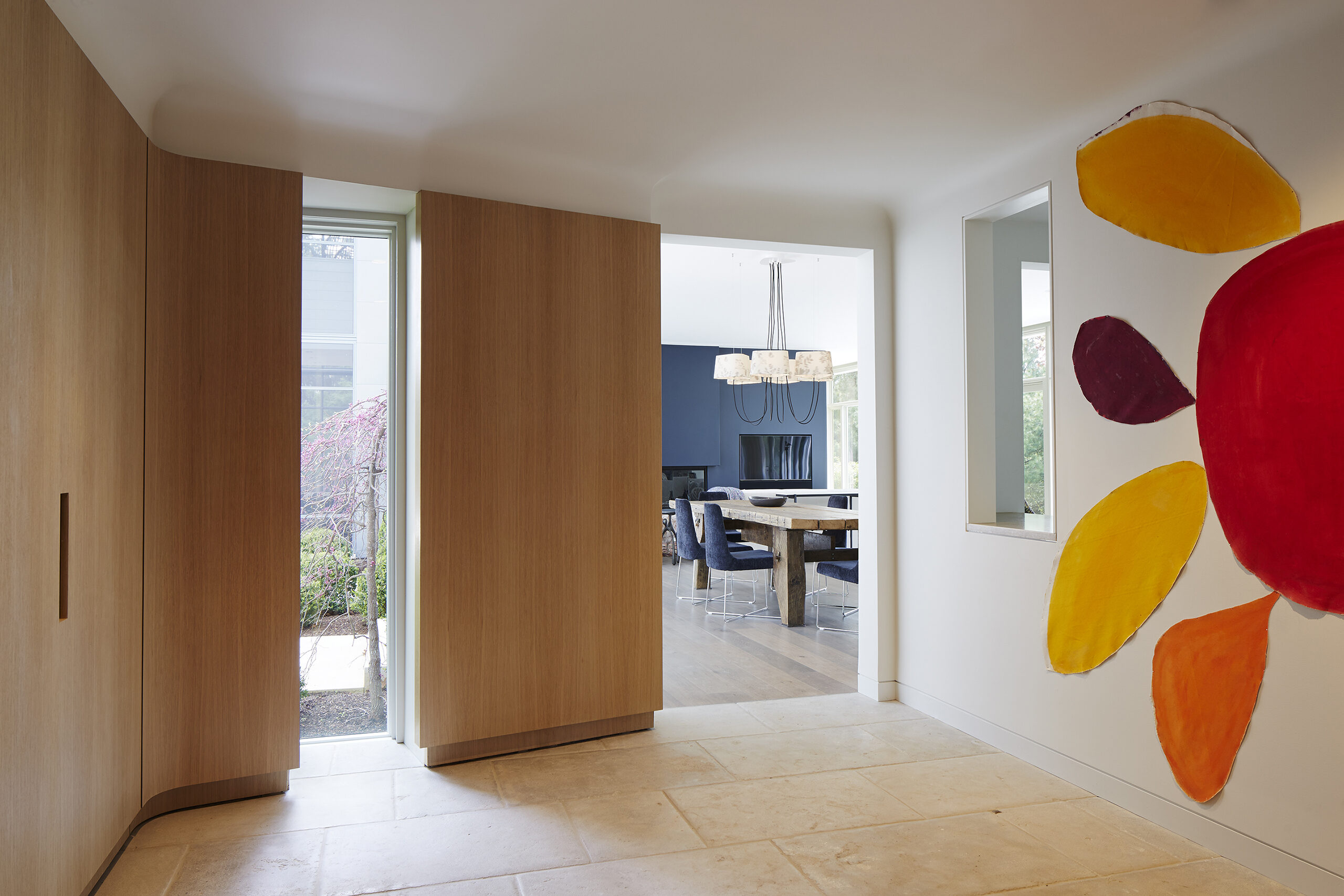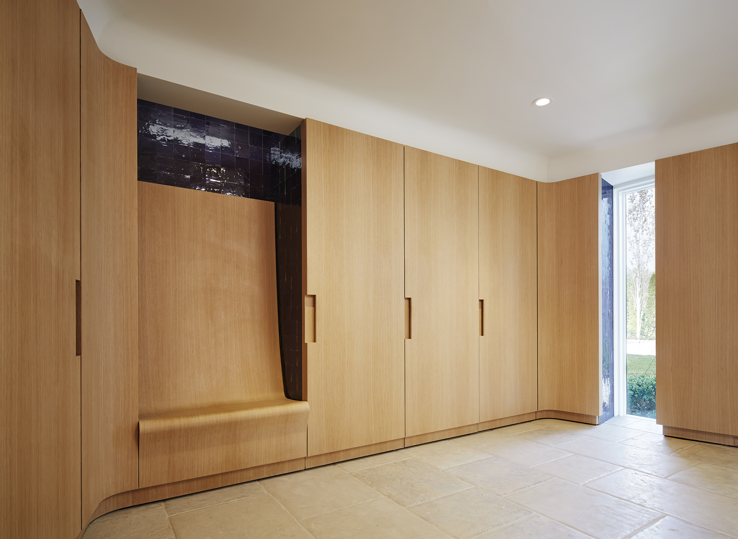 The owner was integrally involved in fine tuning the spirit of the house, particularly with finishes and furnishings. The bright palette of smooth white stucco, white stained flush wood siding, and weathered zinc metal cladding are contrasted against the lush green landscape. Operable window sashes are colored citron yellow and patterned tiles are randomly placed within the stone paving adding a touch of casual whimsy. As an extension of this theme, patterned tiles are randomly placed within the exterior and interior stone paving, floors and walls, in homage to the 1930’s era craft artisan Edgar Miller. The furnishings and art complete the theme with equally creative selection.
