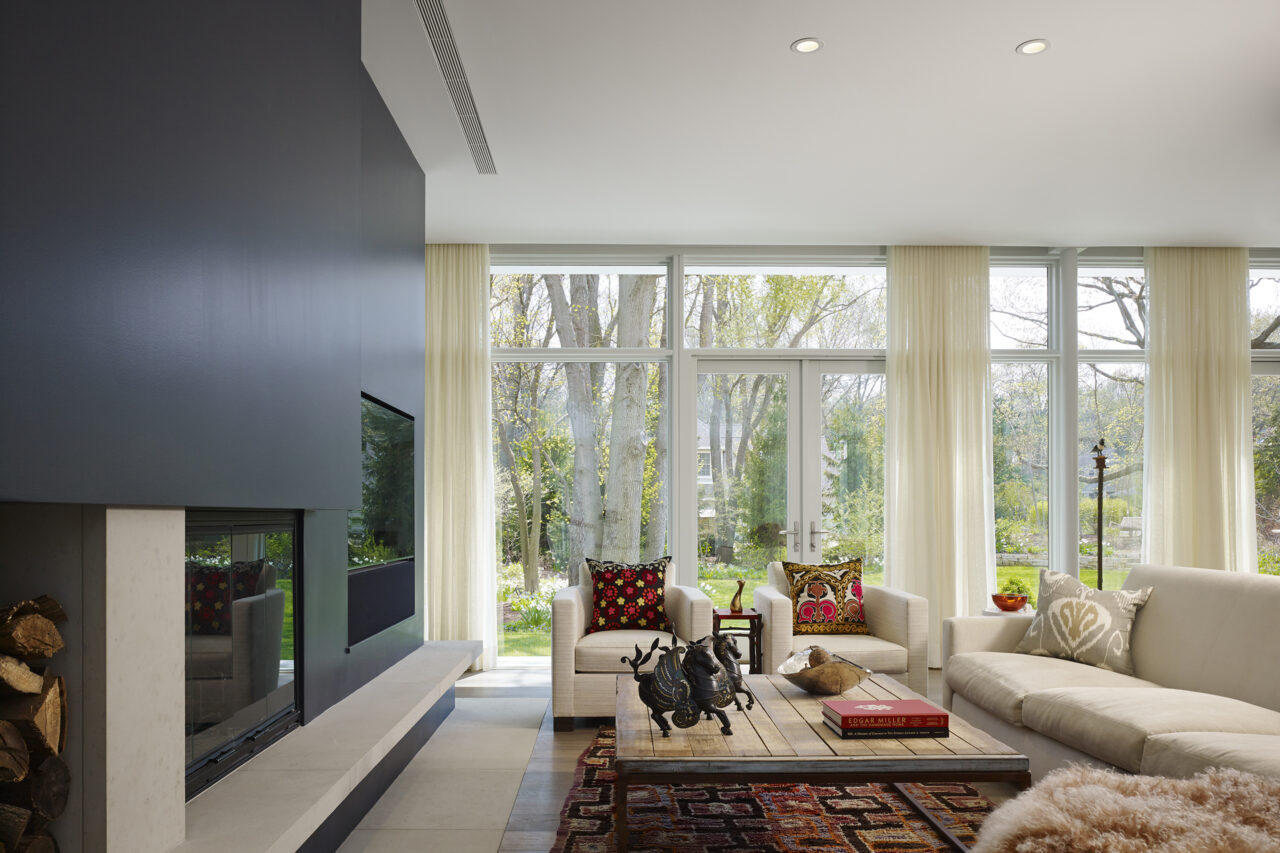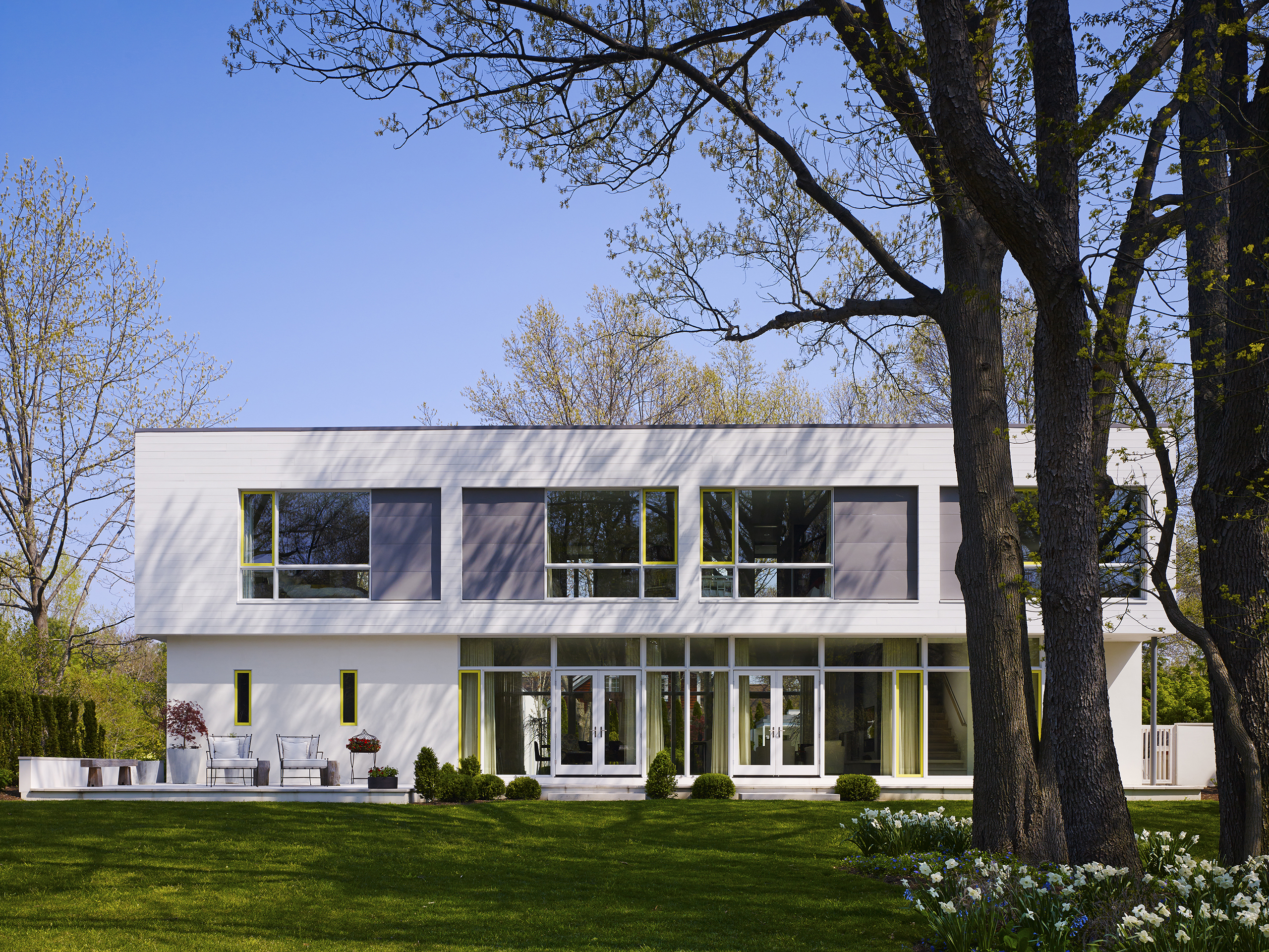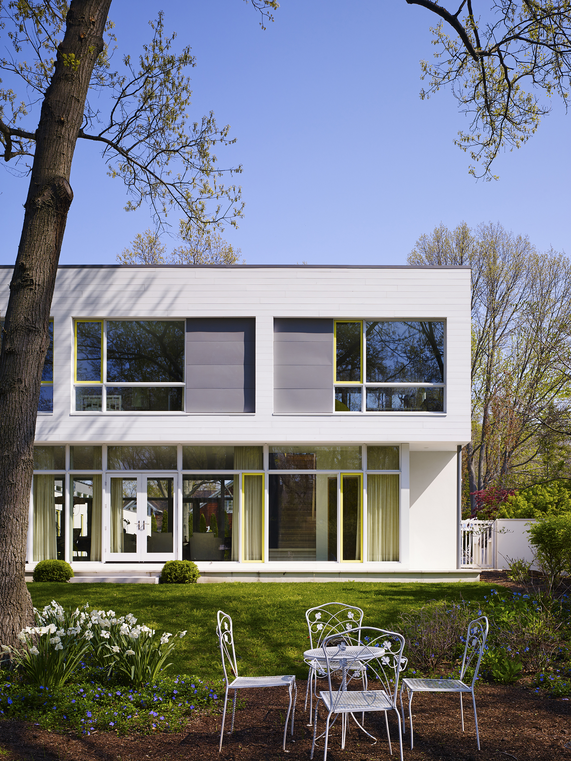 The design was informed by the large double lot site surrounded by beautiful mature oak trees, one block away from the lake. Orientation to the south sun was very important to offset extended periods of gray weather. In response, this contemporary house is composed of 3 volumes that organize the site between the rustic south half and the domesticated north half, with the primary living space straddling the middle to unite both environments.