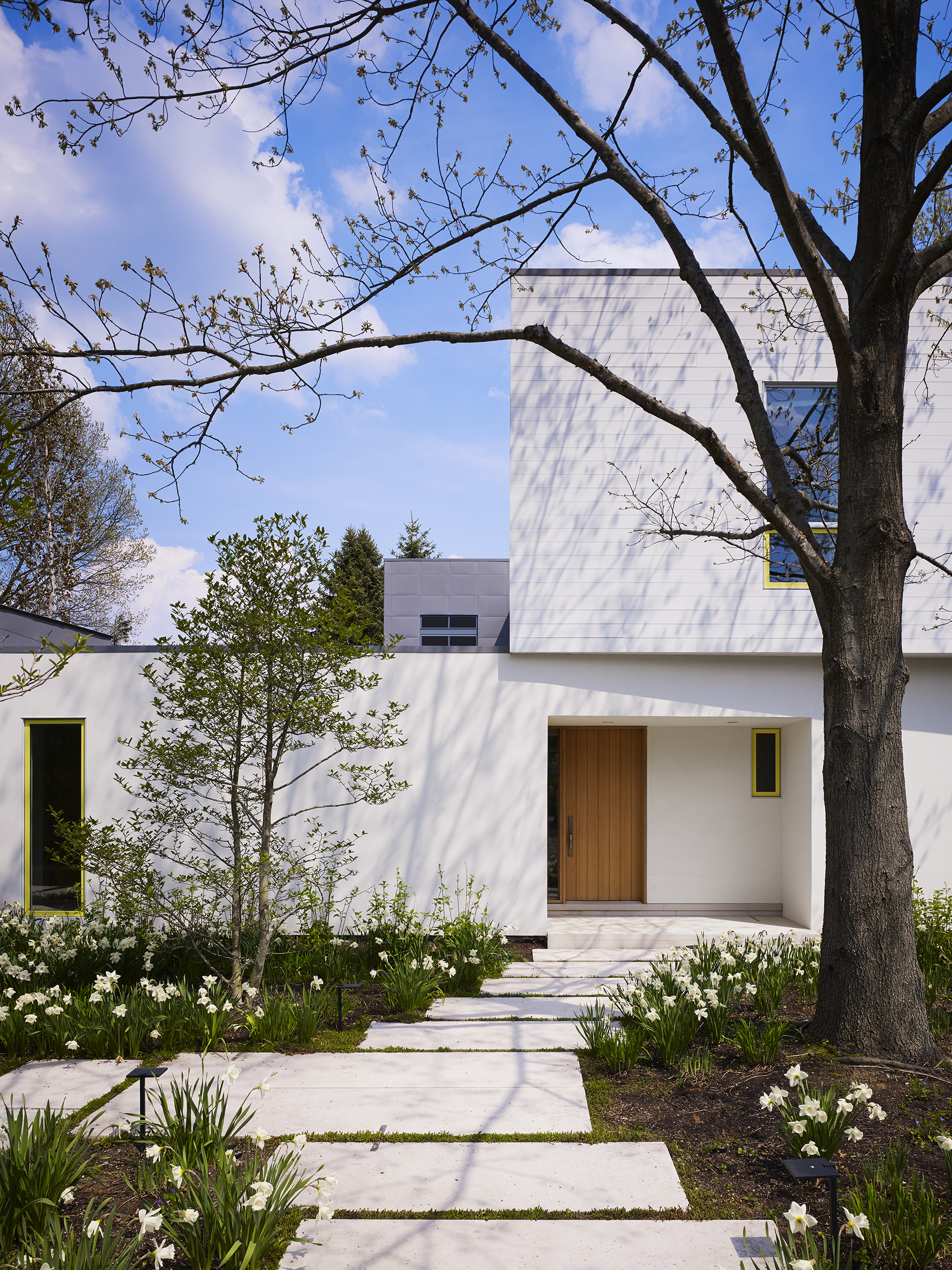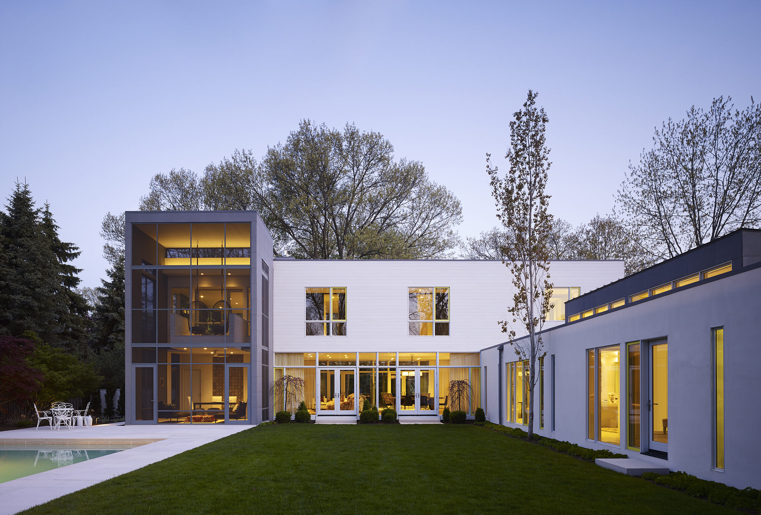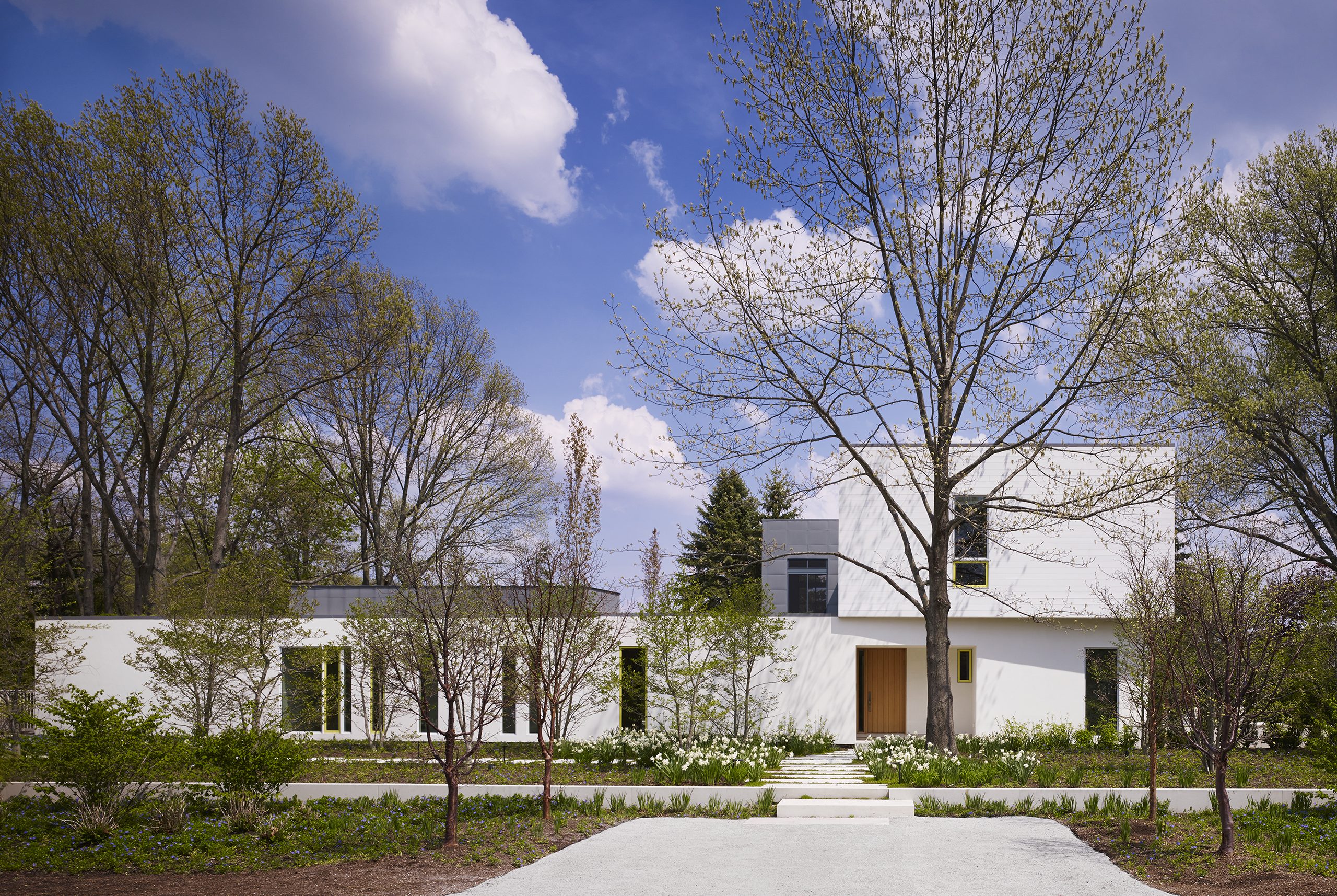 The design was informed by the large double lot site surrounded by beautiful mature oak trees, one block away from the lake. Orientation to the south sun was very important to offset extended periods of gray weather. In response, this contemporary house is composed of 3 volumes that organize the site between the rustic south half and the domesticated north half, with the primary living space straddling the middle to unite both environments.