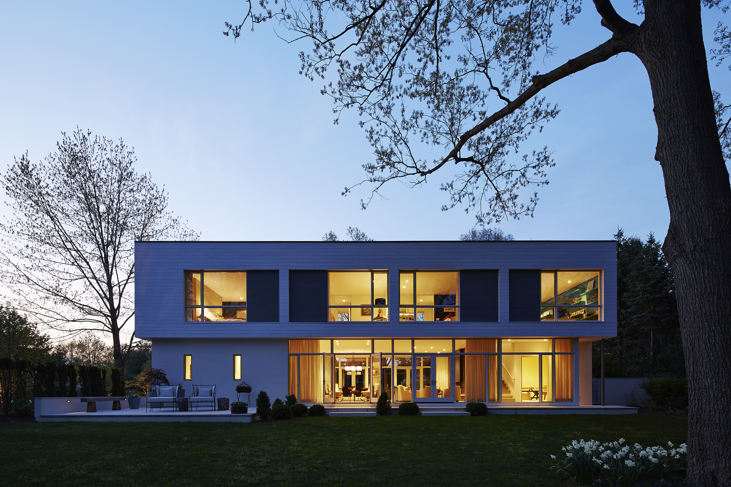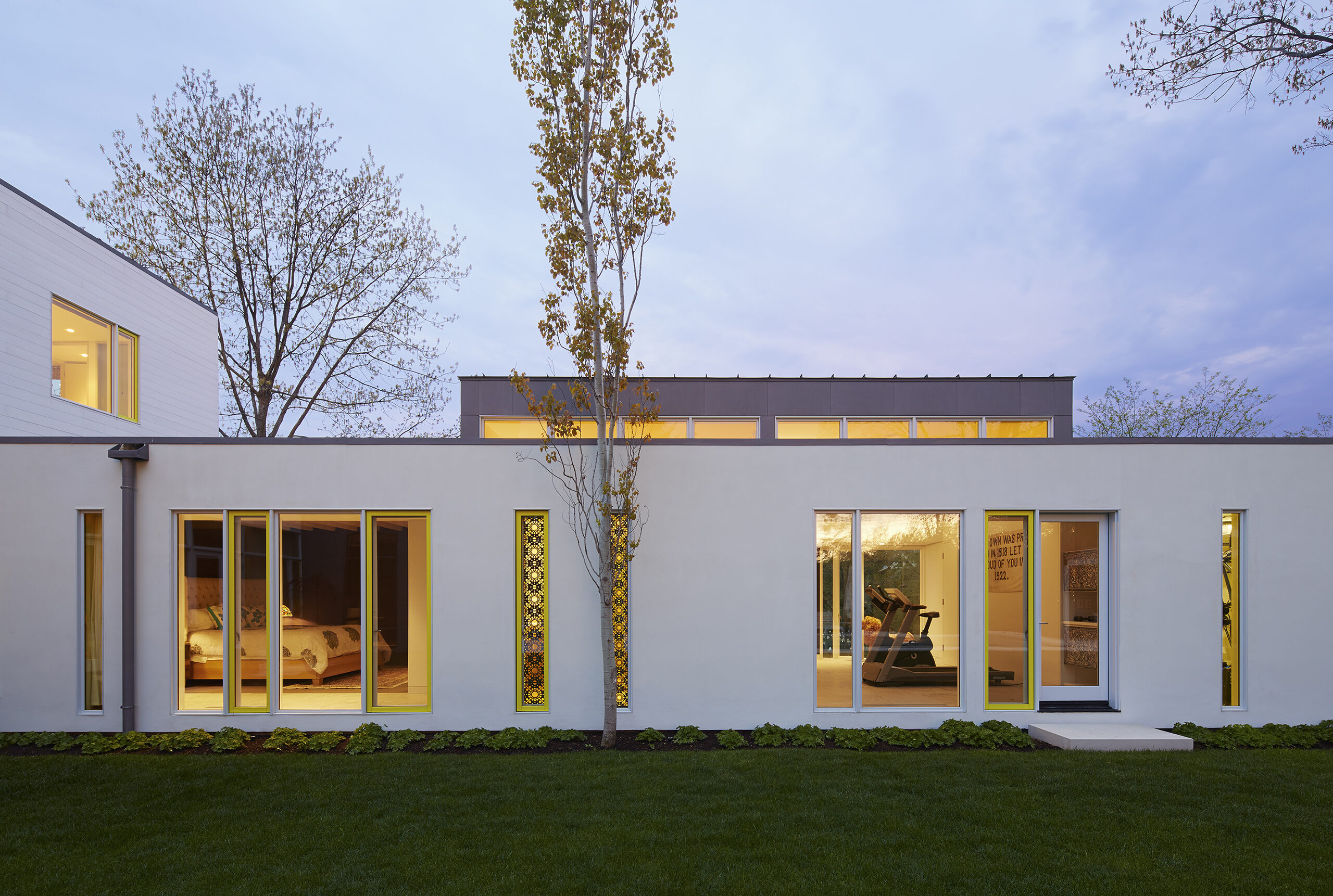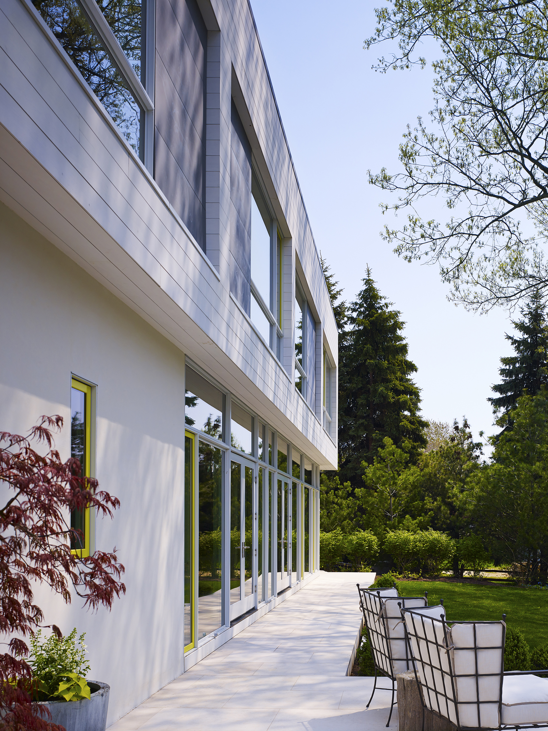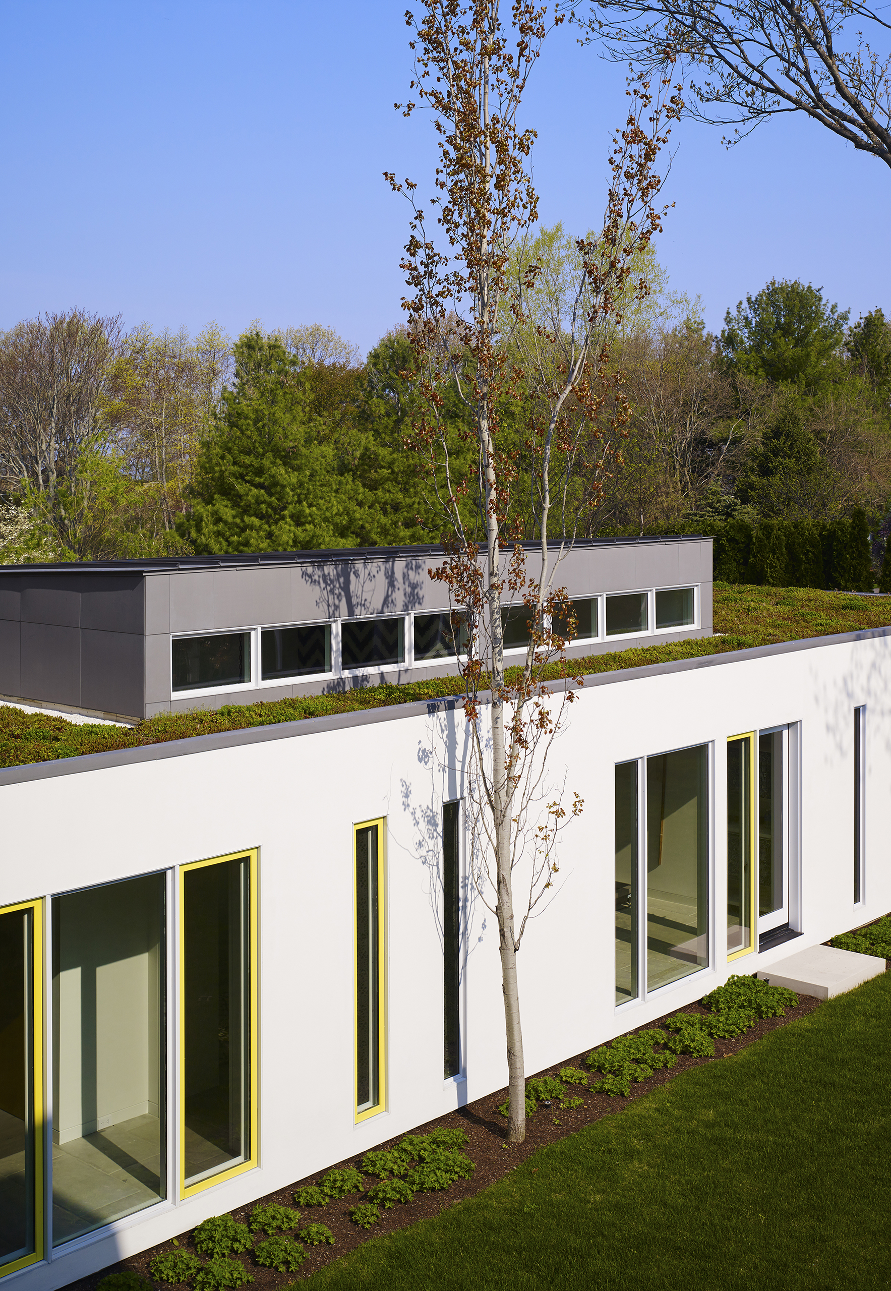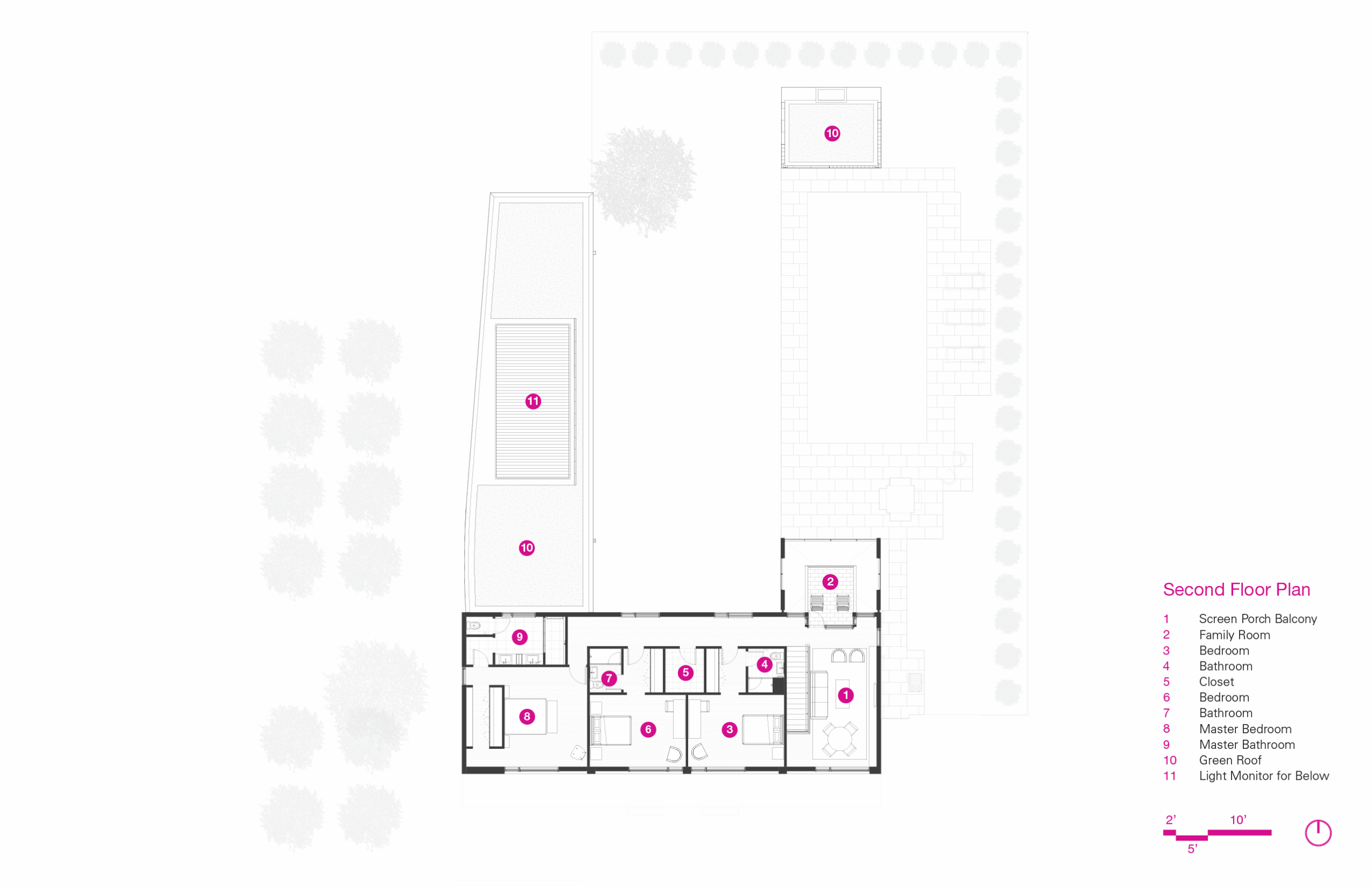 The one story guest wing with a green roof shields the north outdoor environment from the street and the surrounding evergreen trees provide enhanced privacy. The family room and bedrooms are placed on the second floor with generous access to south sunlight and are visually connected to the north with a balcony perch suspended within the two-story screen porch.