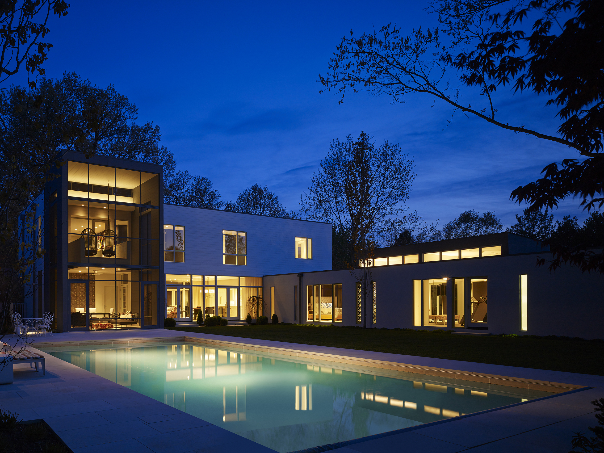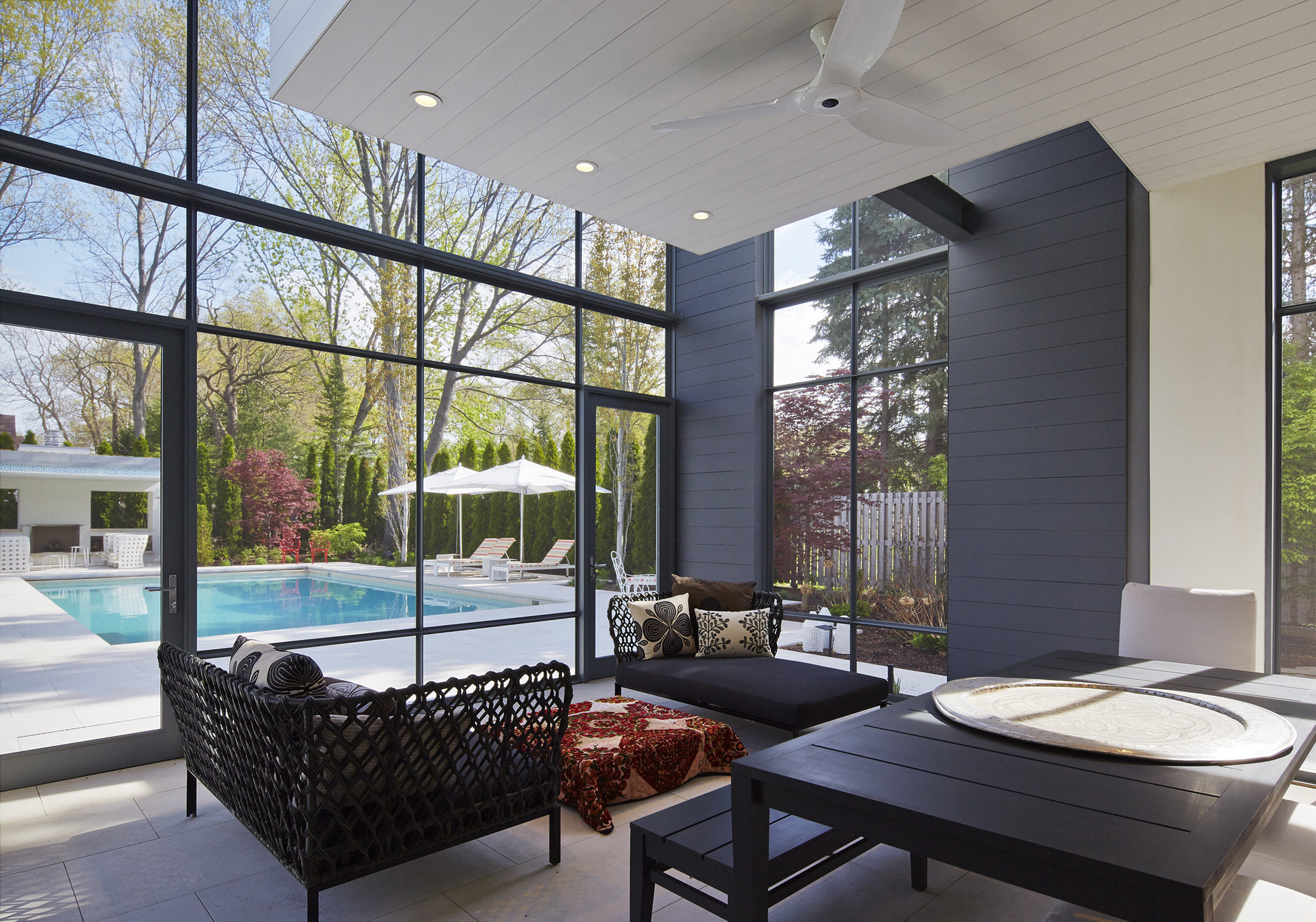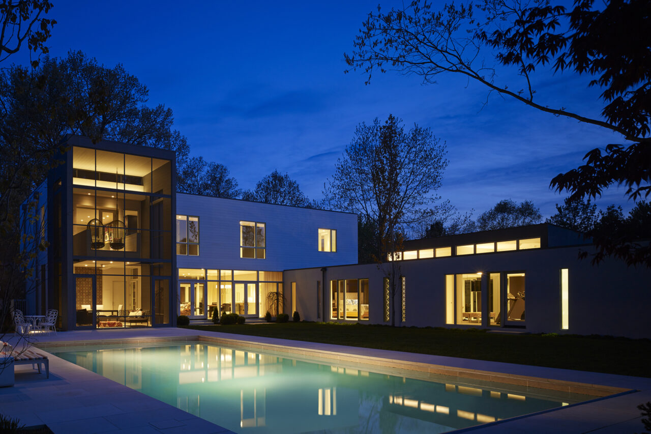 From the living and dining room, the south view provides generous access to sunlight and views of the mature trees, with the irregular landscape manipulated to enhance the casual picturesque qualities. The north view, by contrast, reveals a more formal organization for outdoor activities with a broad level lawn, rectilinear pool, 2 story screen porch, and a furnished outdoor room with a fireplace.
