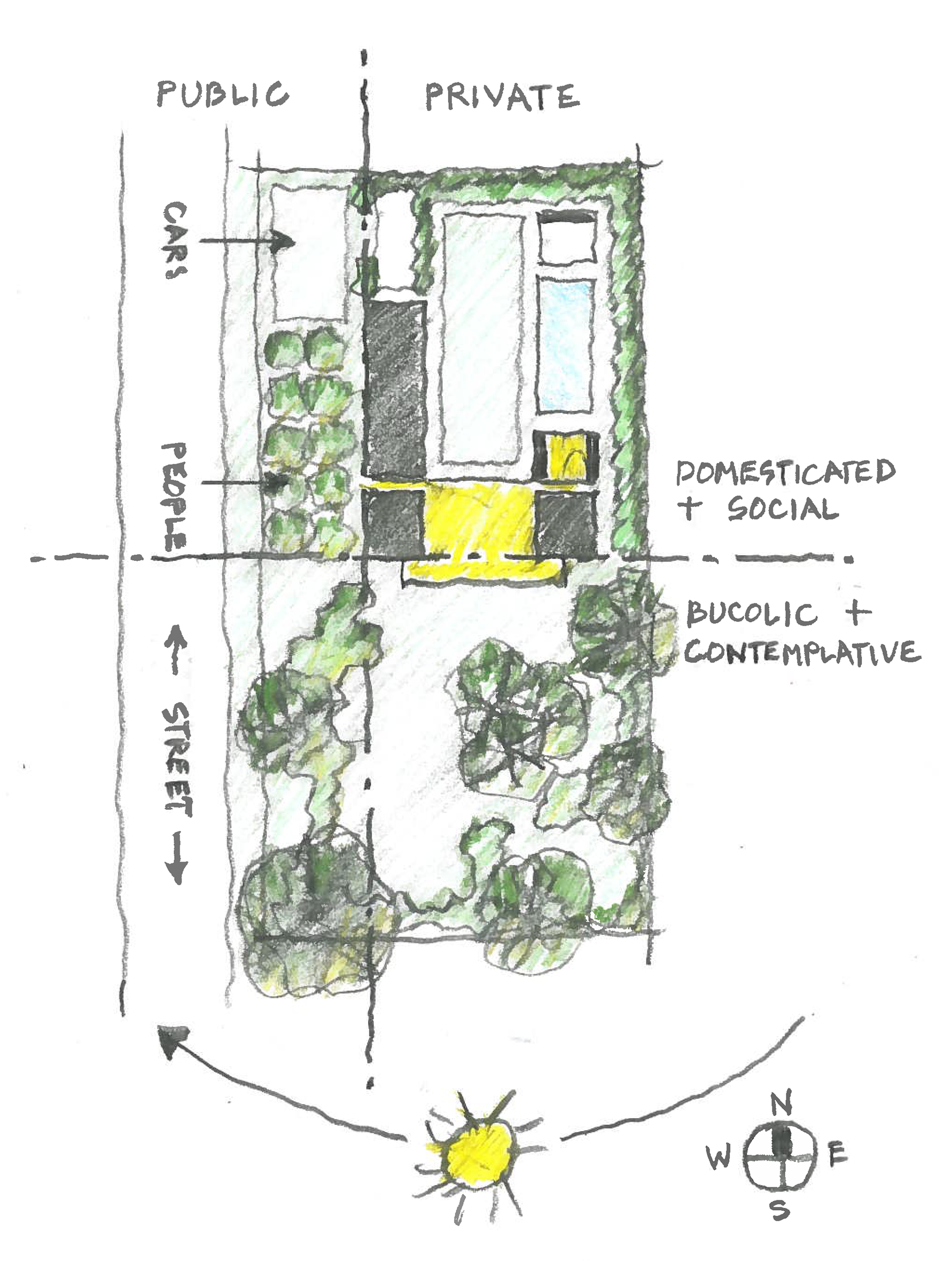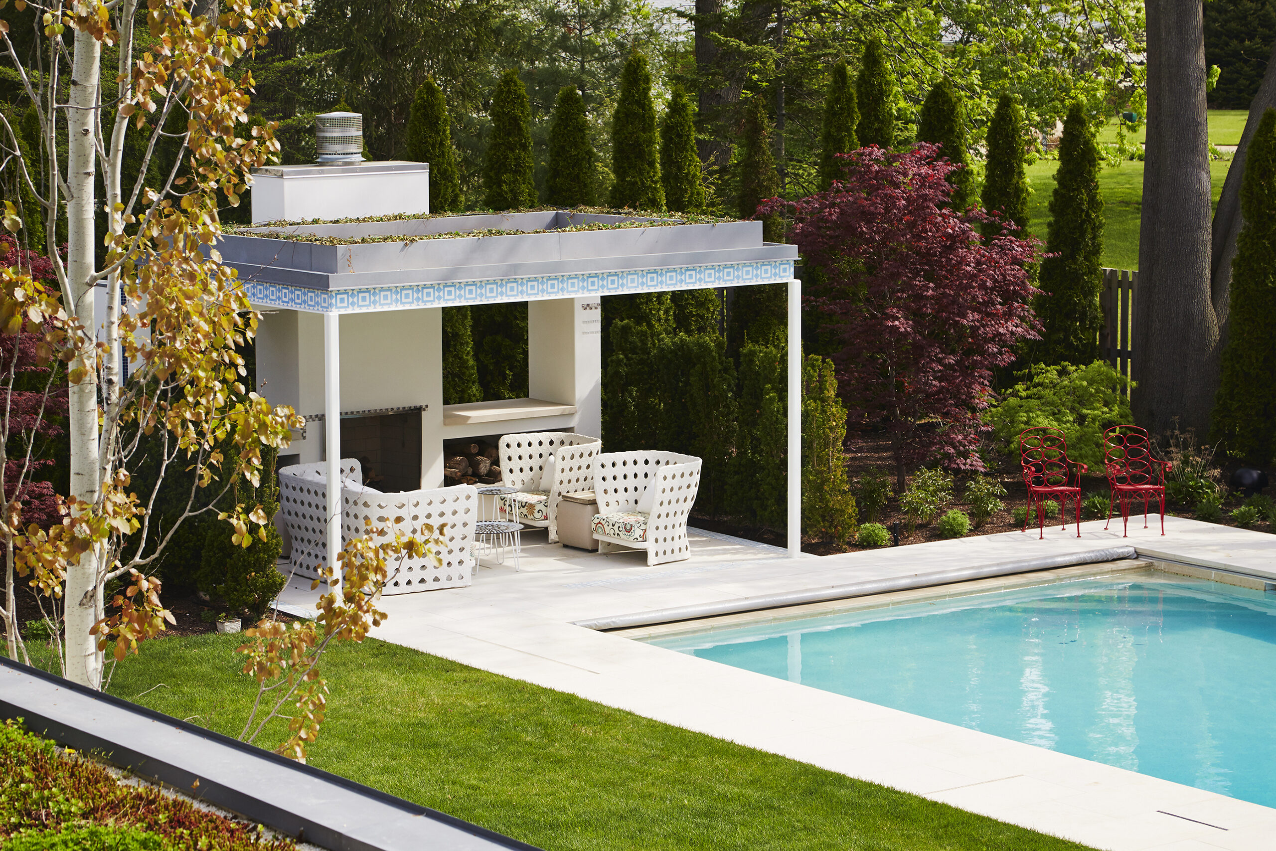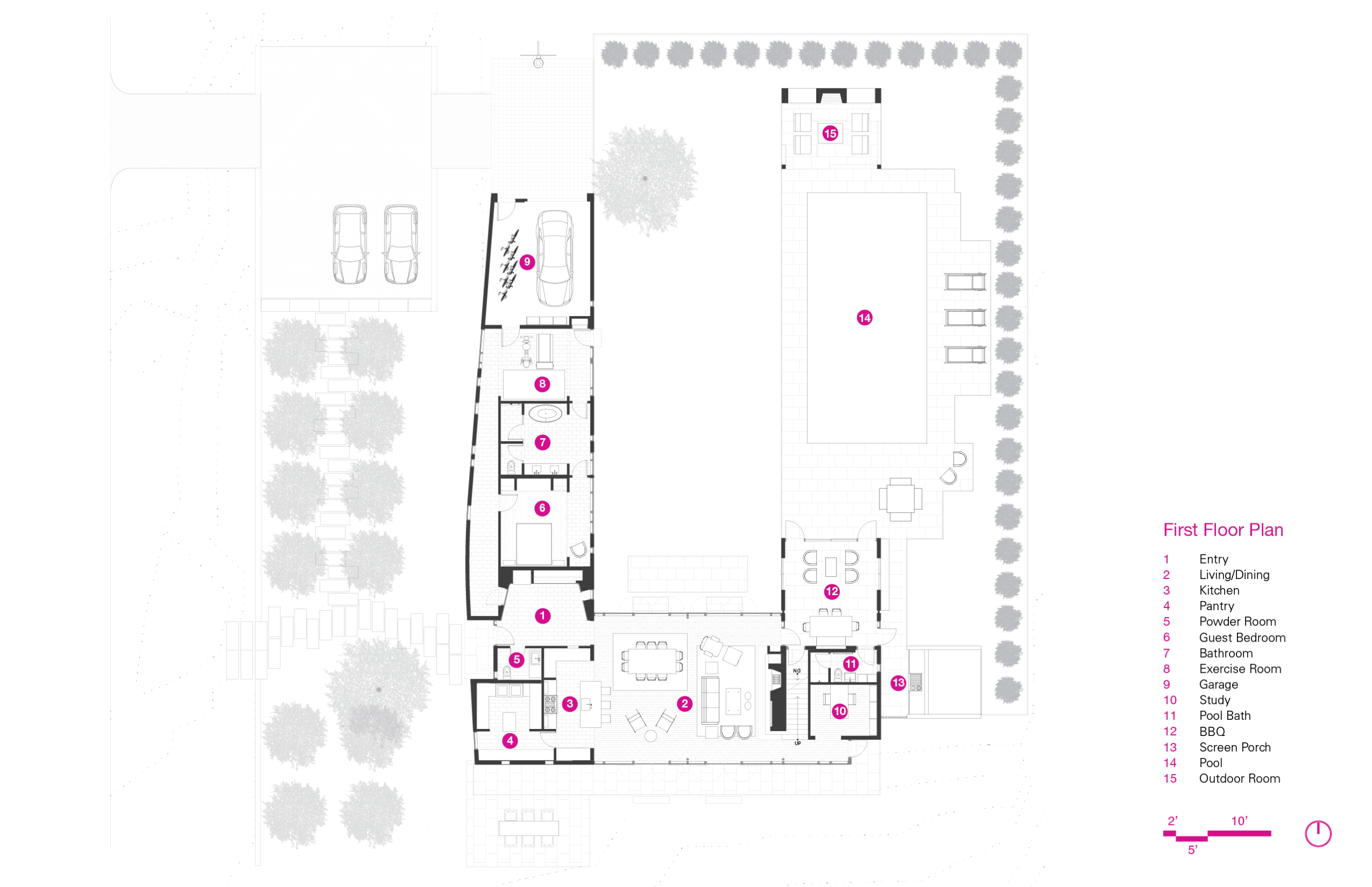 From the living and dining room, the south view provides generous access to sunlight and views of the mature trees, with the irregular landscape manipulated to enhance the casual picturesque qualities. The north view, by contrast, reveals a more formal organization for outdoor activities with a broad level lawn, rectilinear pool, 2 story screen porch, and a furnished outdoor room with a fireplace.