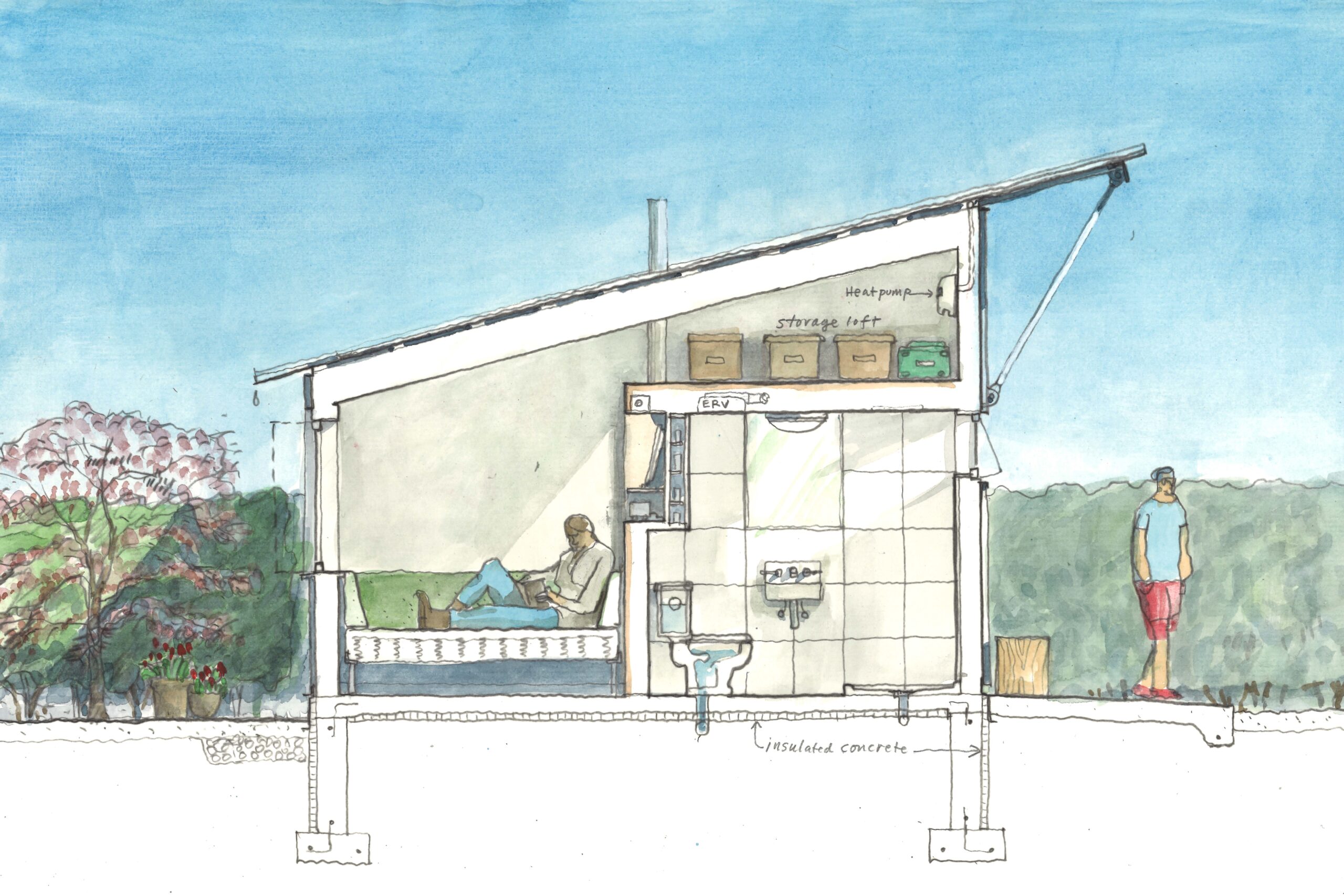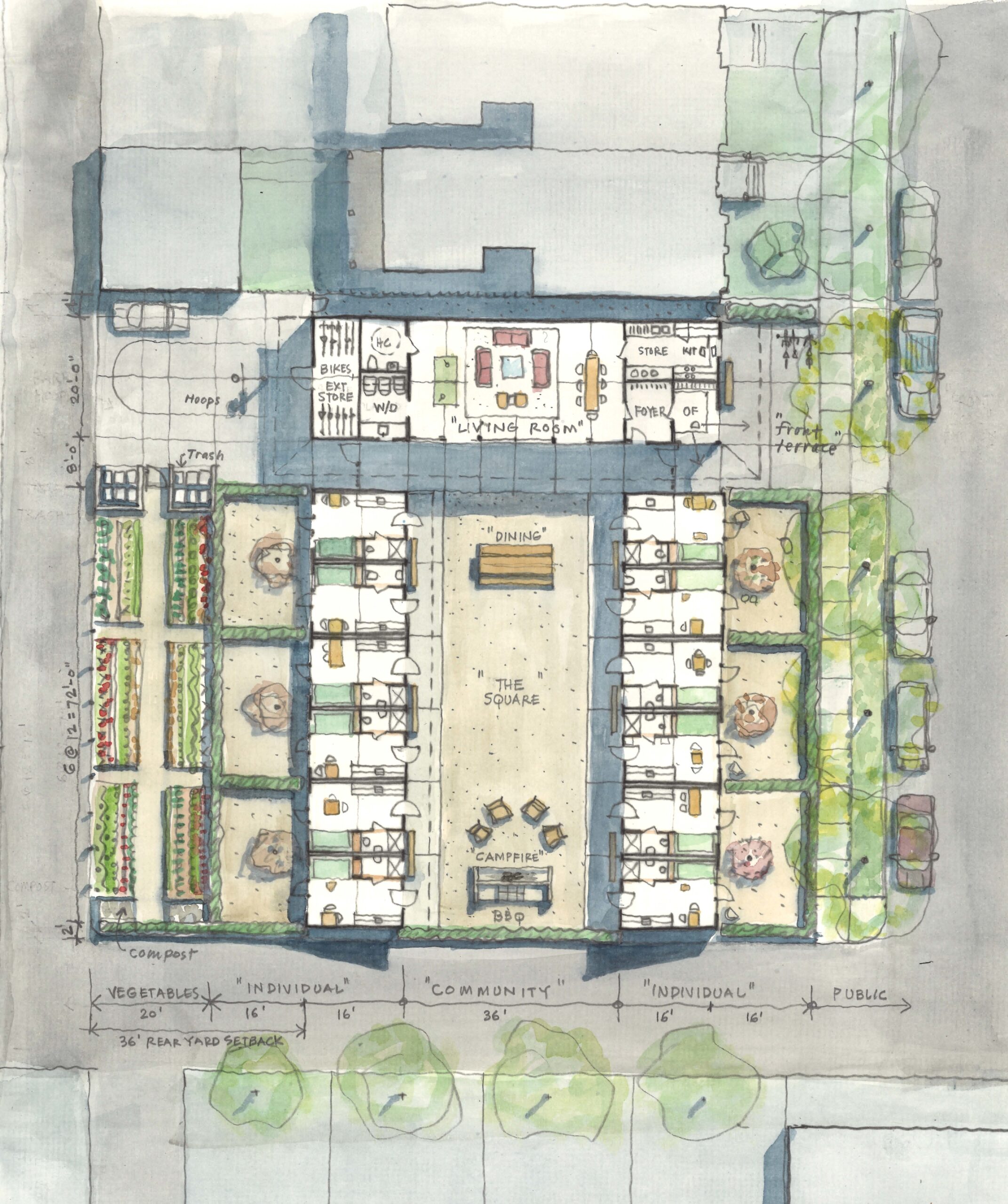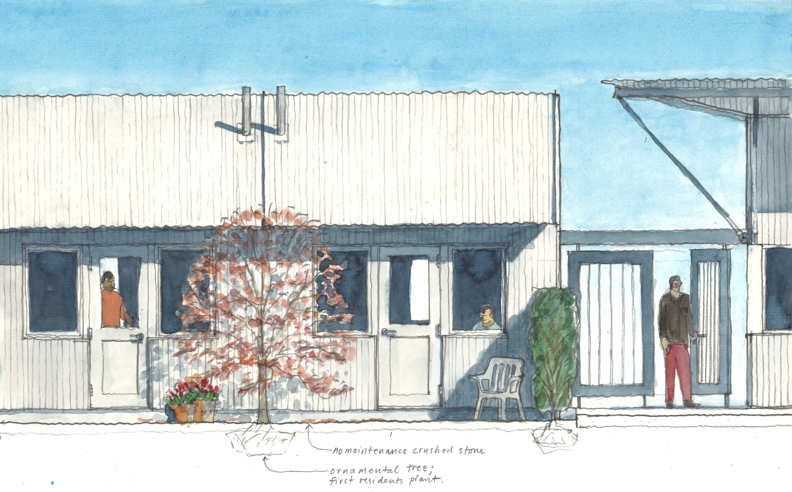 The two bands of six Tiny Town Houses sit shoulder to shoulder fronting Tiny Town’s social center, “The Square.” Bathed by south light and extending visually and literally into the “living room” of the staffed community center to the north, The Square is Tiny Town’s interactive center: greetings, conversations, communal food preparation, dinners, and campfires. Residents can engage within this space when the spirit moves or find refuge in their homes and complementary private gardens defined by a privet hedge. The Tiny Town House has two faces, postures: one big and public, one modest and private.