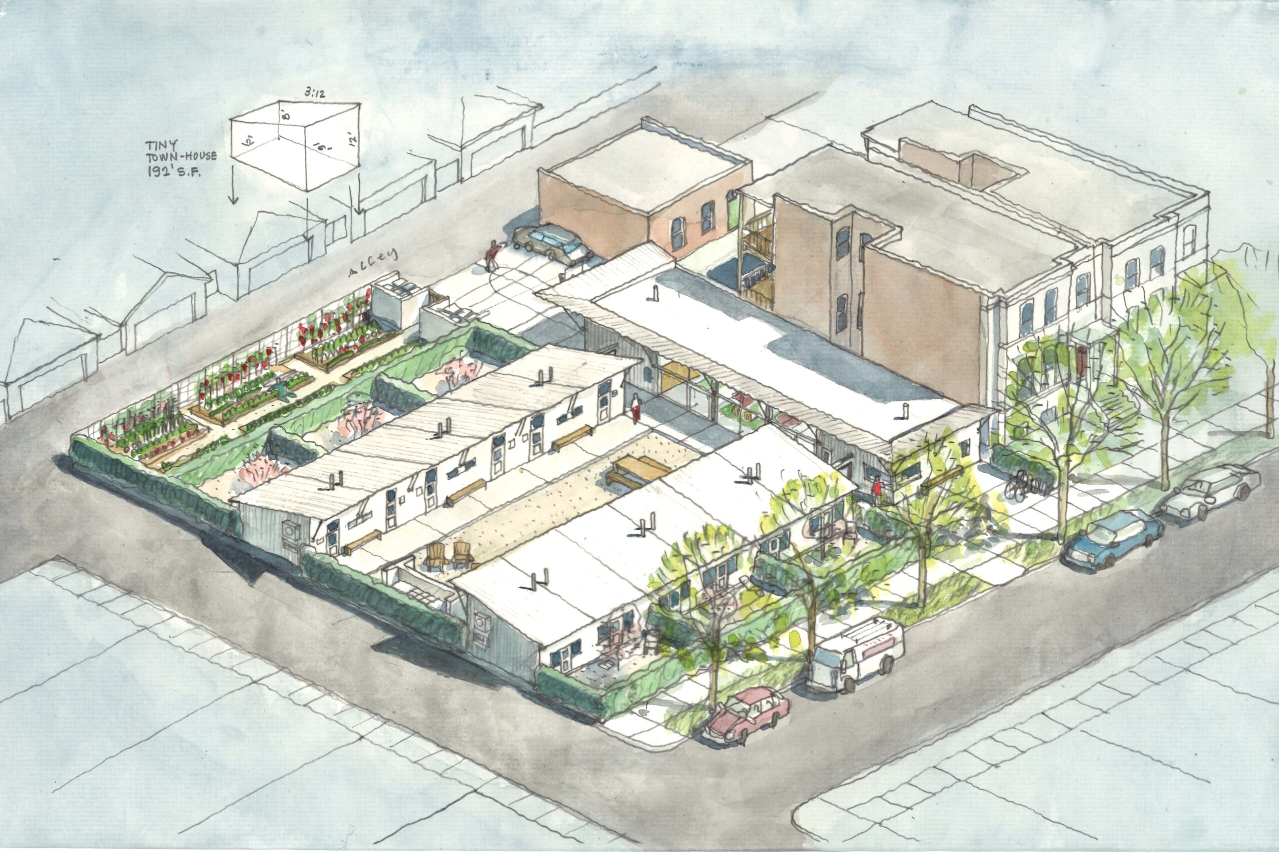 Located in Chicago’s historic Bronzeville neighborhood, “Tiny Town” is an alternative solution to Chicago’s affordable housing shortage. Tiny Town, composed of (12) $60K “Tiny Town Houses,” provides homeless young adults with privacy in a shared community. Tiny Town provides a low cost, low maintenance, viable solution that can easily be replicated in other neighborhoods facing similar housing needs.