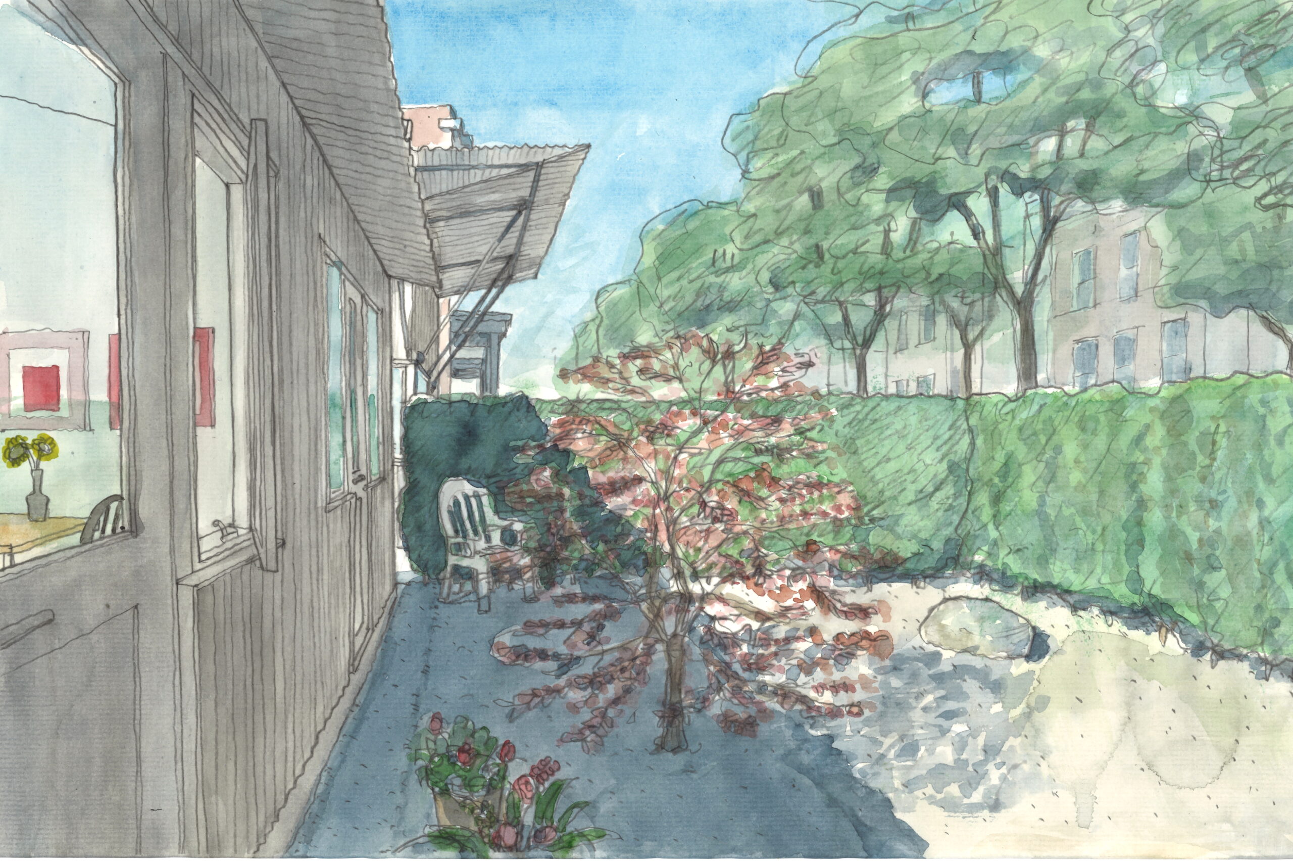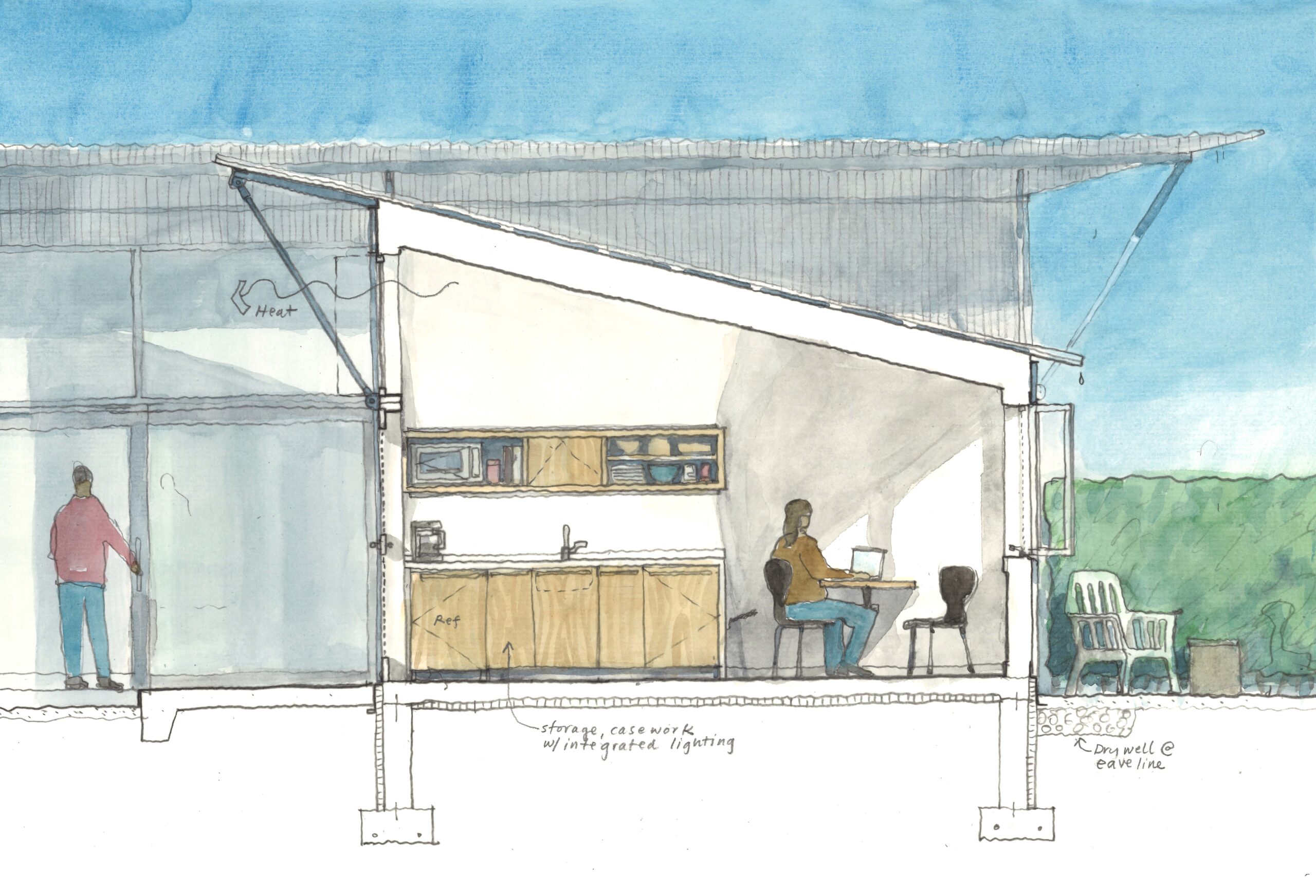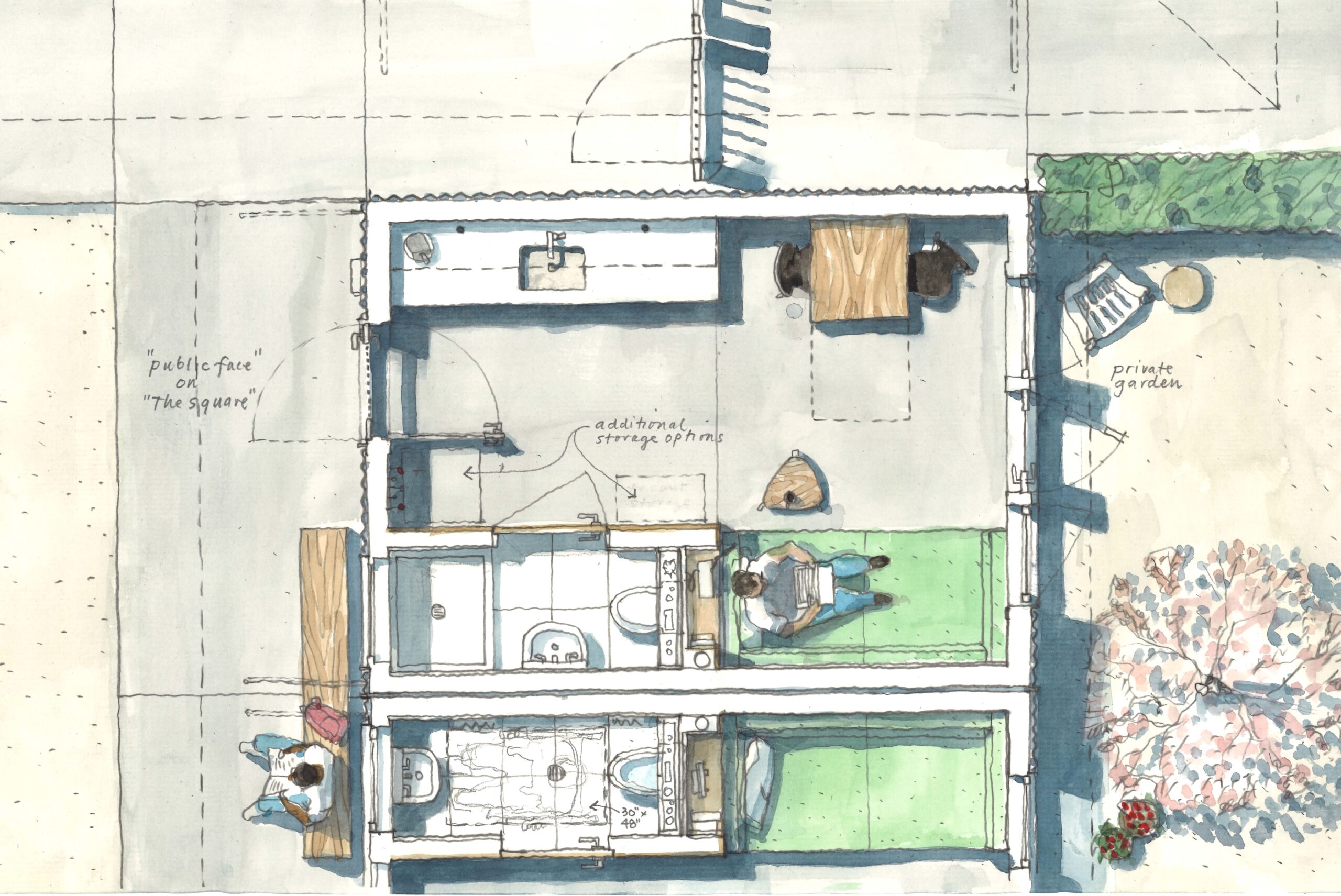 The two bands of six Tiny Town Houses sit shoulder to shoulder fronting Tiny Town’s social center, “The Square.” Bathed by south light and extending visually and literally into the “living room” of the staffed community center to the north, The Square is Tiny Town’s interactive center: greetings, conversations, communal food preparation, dinners, and campfires. Residents can engage within this space when the spirit moves or find refuge in their homes and complementary private gardens defined by a privet hedge. The Tiny Town House has two faces, postures: one big and public, one modest and private.