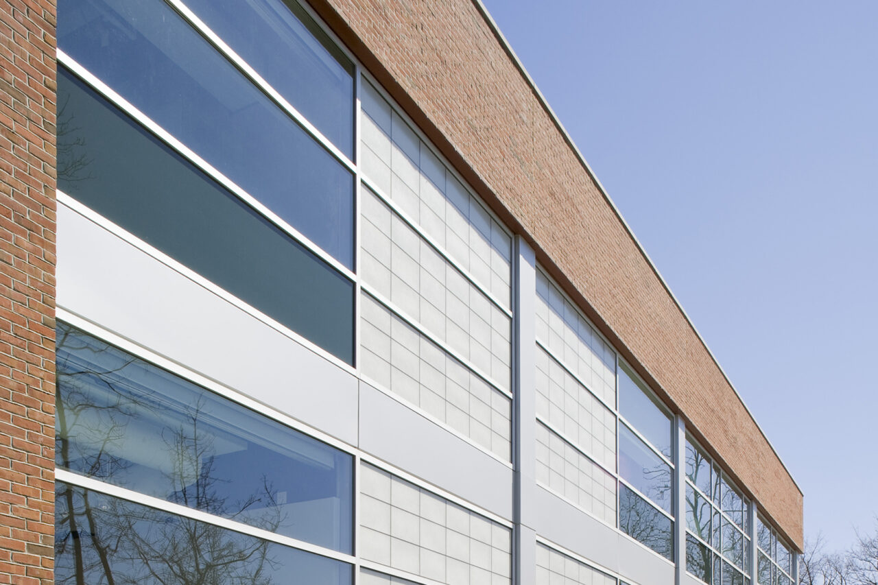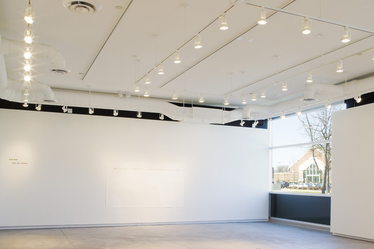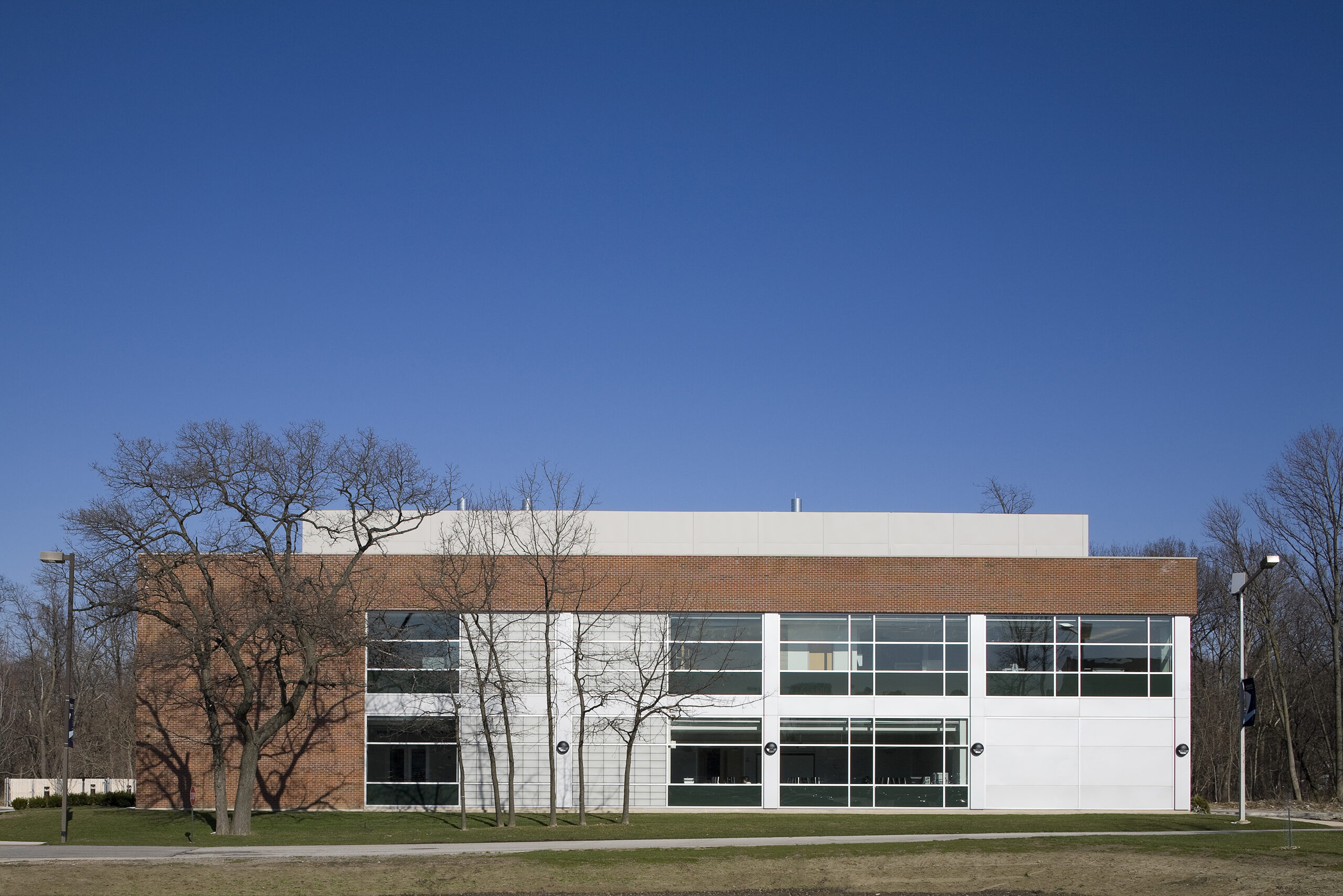 Sited along the entry drive to a suburban Trinity Christian College campus, the Theater Arts Building presents a public face that addresses the road, while simultaneously opening up at the back to a landscaped courtyard that nestles up to a scenic wooded ravine and floodplain boundary.