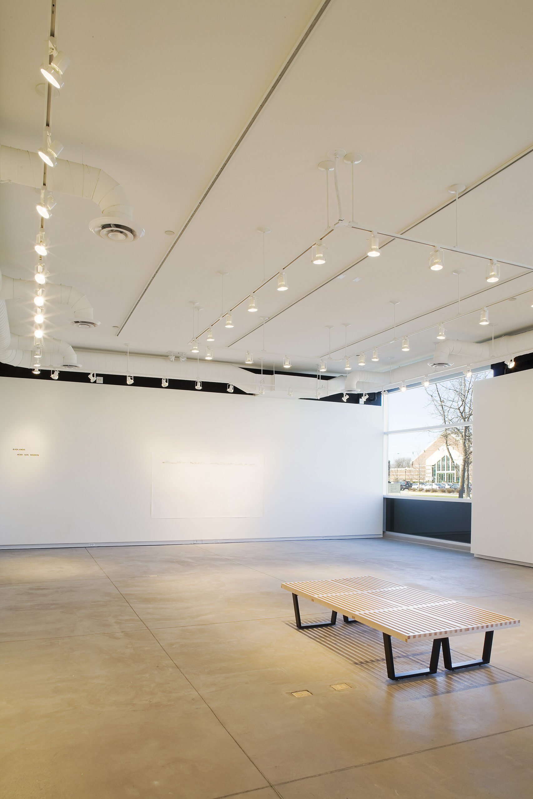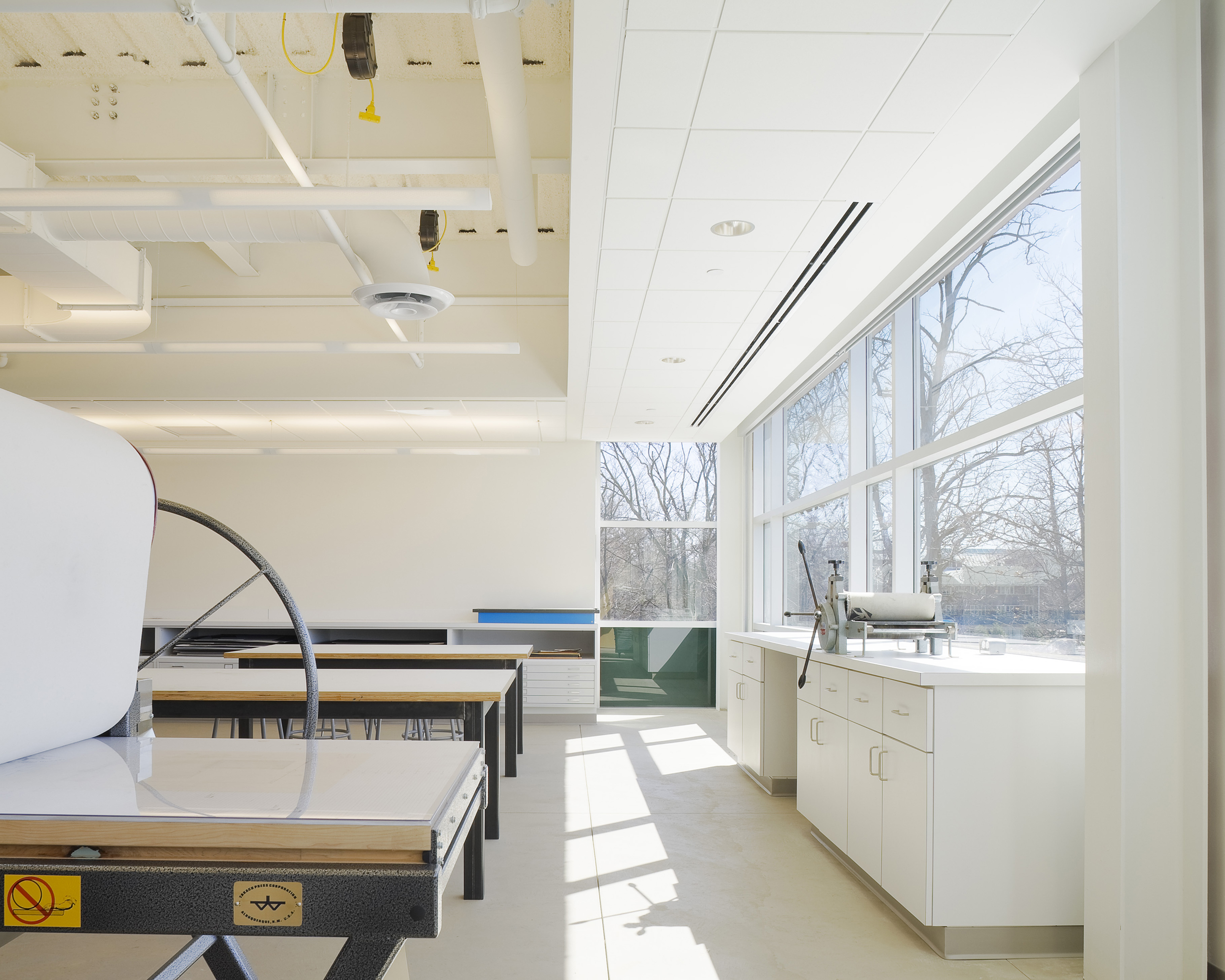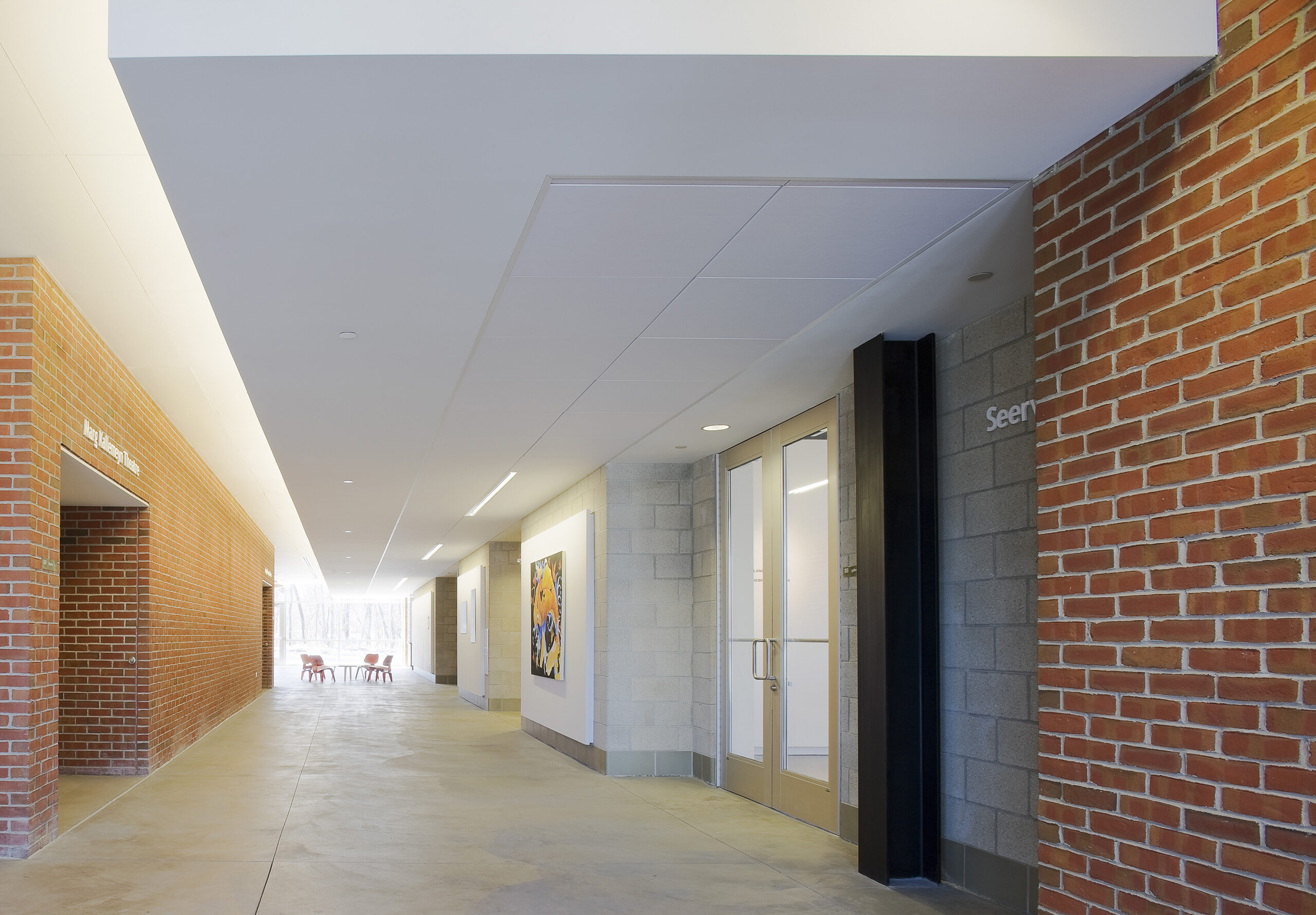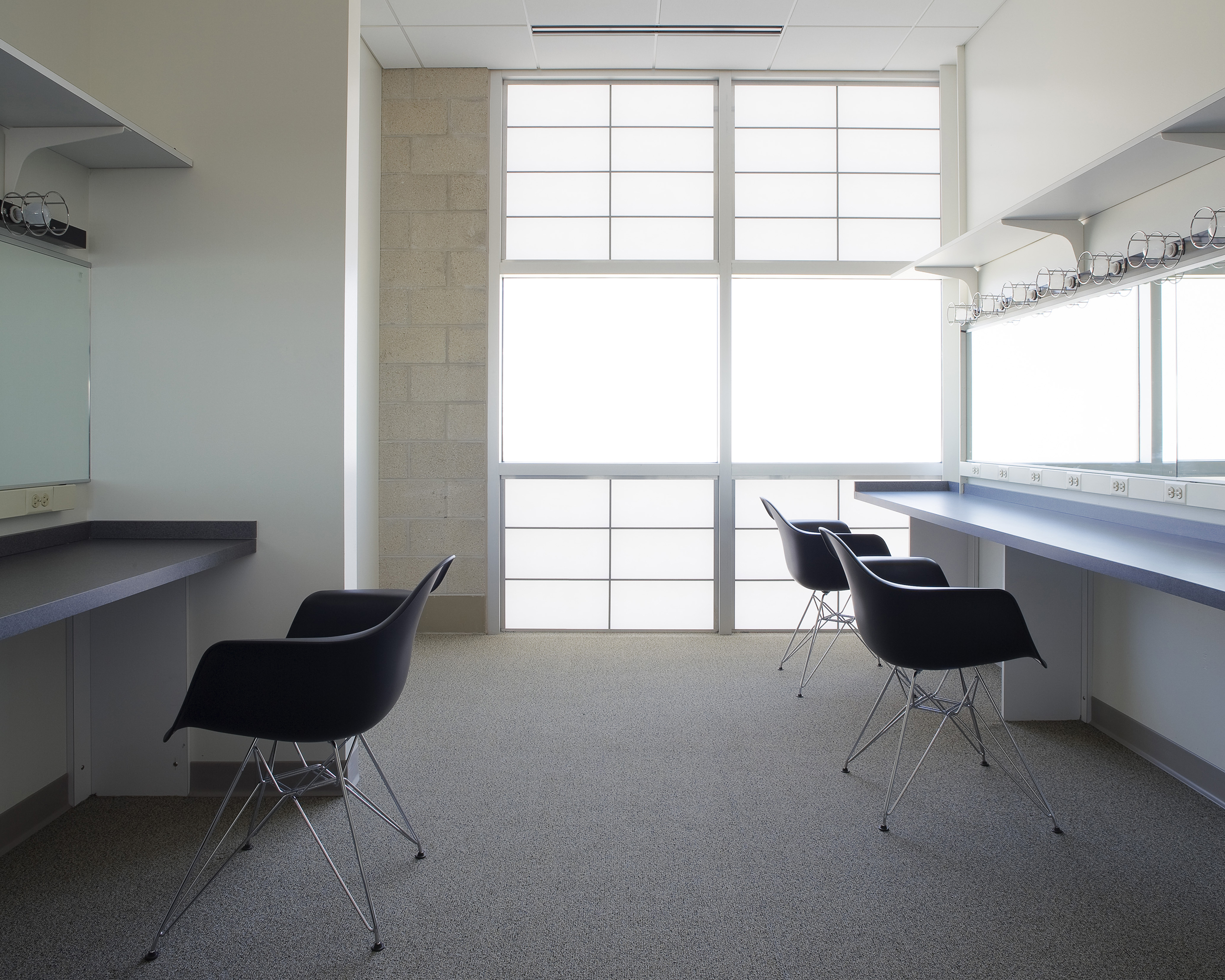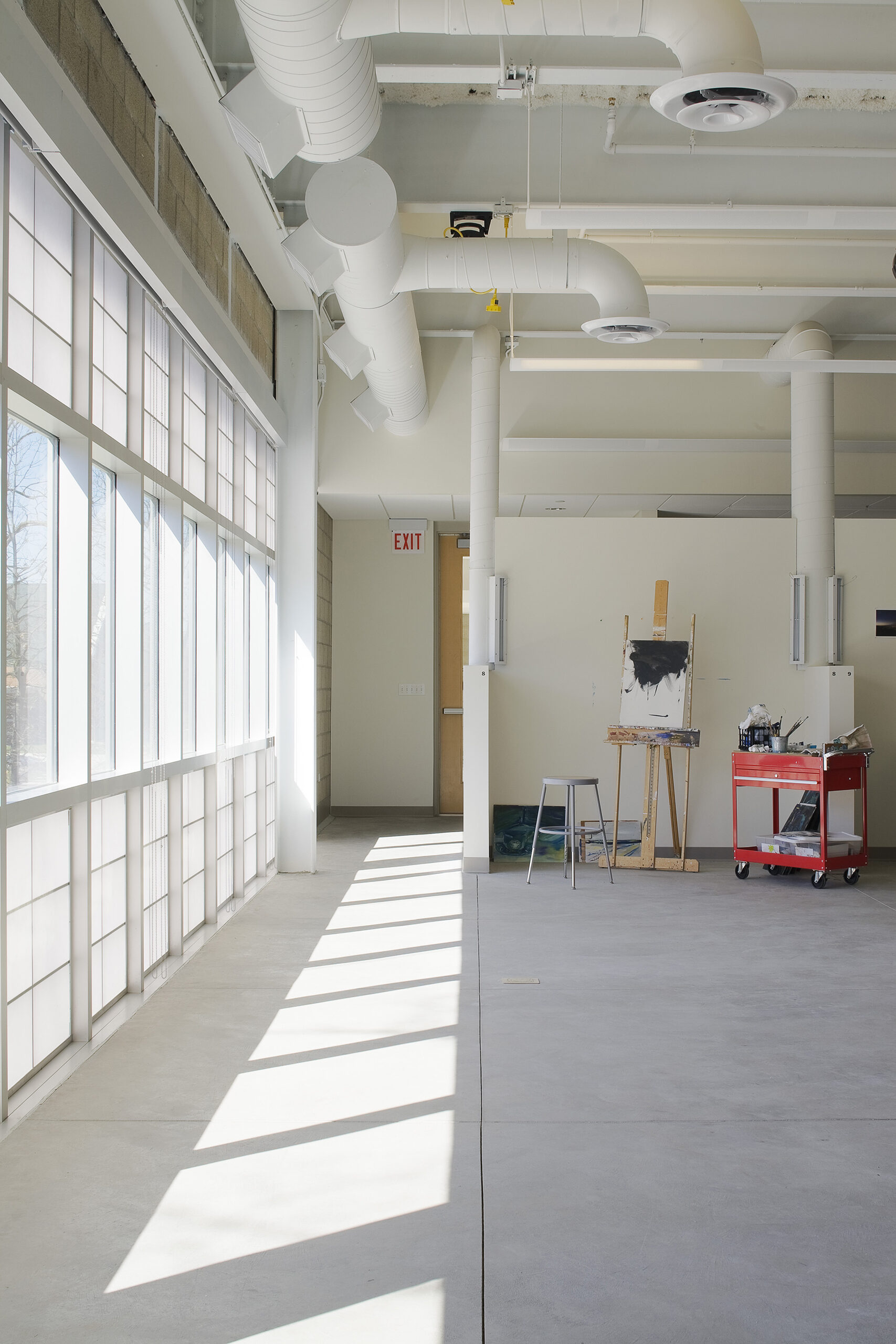 Similarly, the program for the building also has two distinctly different components. A 200 seat black box theater, contained by exposed coarse aggregate precast concrete panels, becomes a public face for the college and community. A steel frame and masonry envelope provides studios and classrooms for hands on coursework including painting, ceramics and printmaking.