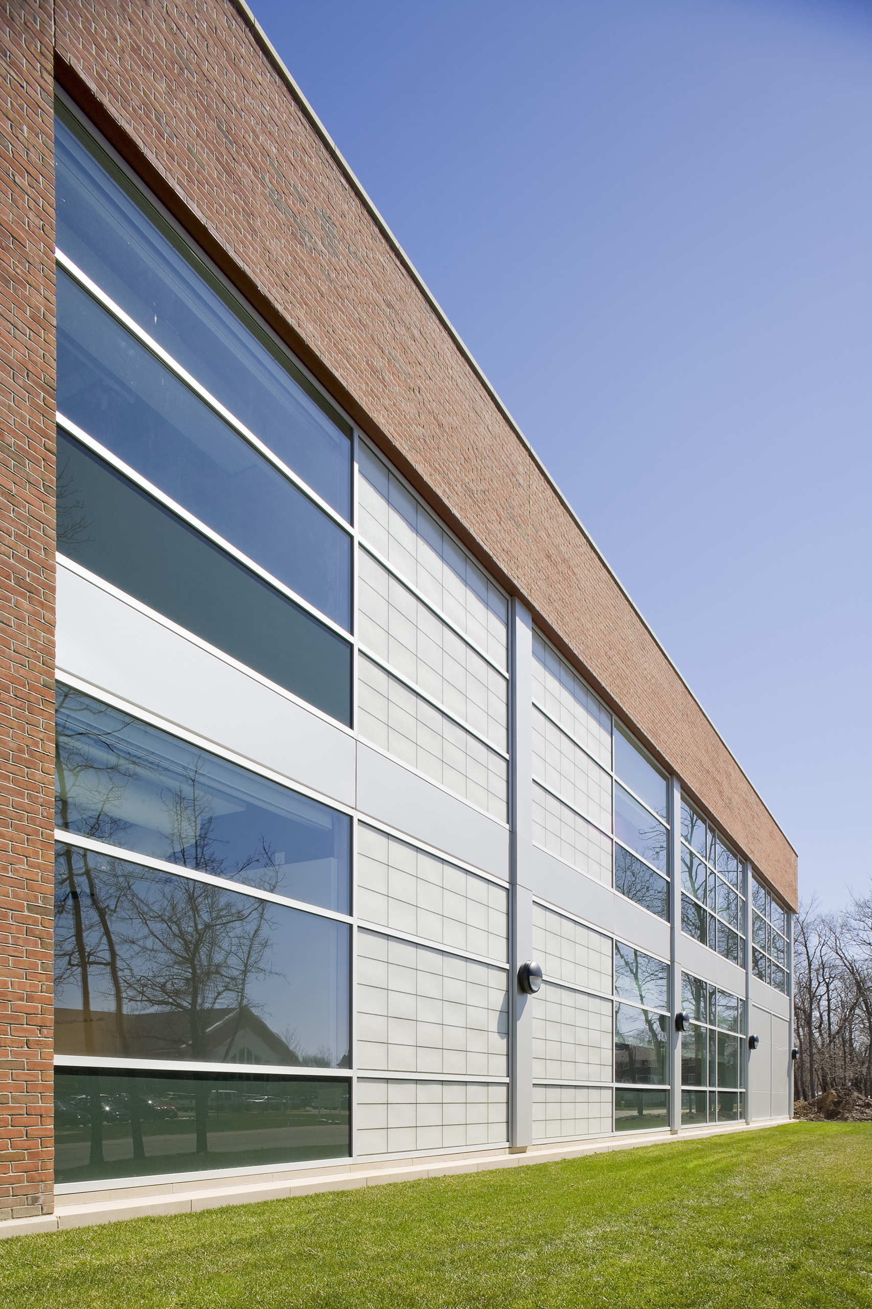Sited along the entry drive to a suburban Trinity Christian College campus, the Theater Arts Building presents a public face that addresses the road, while simultaneously opening up at the back to a landscaped courtyard that nestles up to a scenic wooded ravine and floodplain boundary.