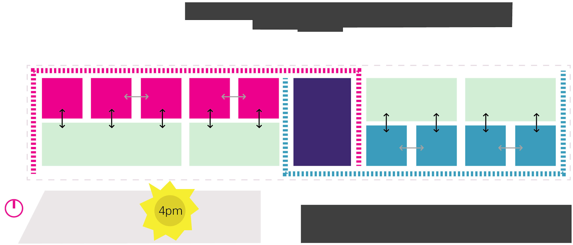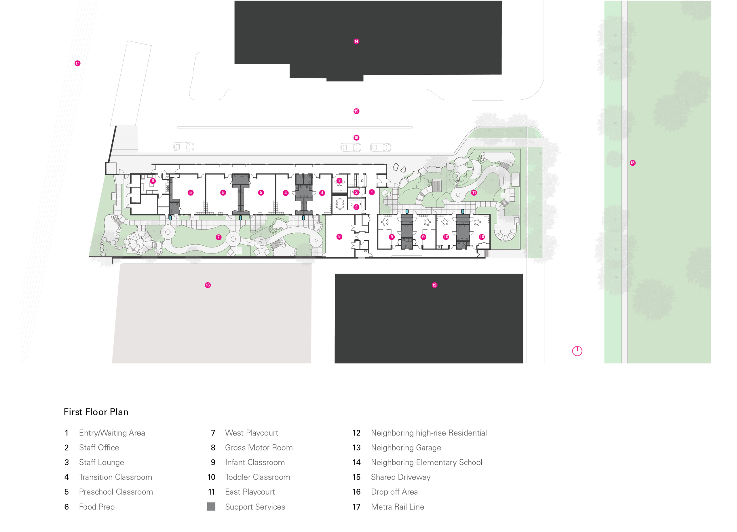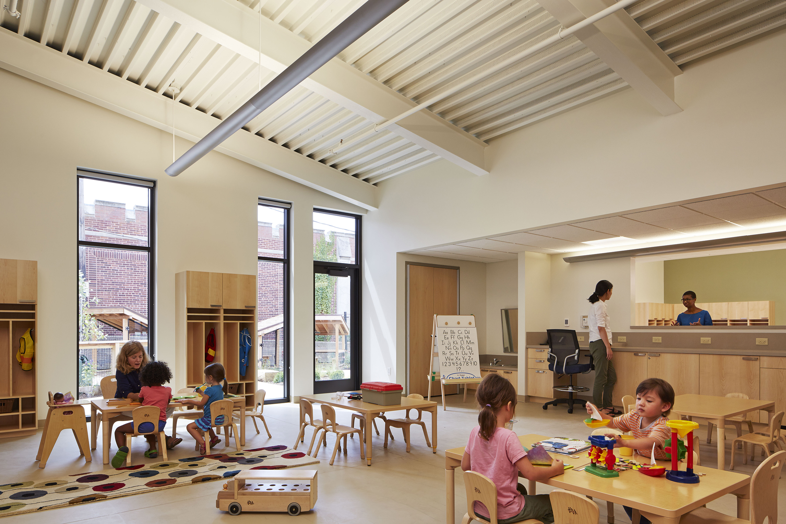 Unencumbered open plan tandem classrooms are leveraged for long-term flexibility and adaptability. Common classroom-related support functions including teacher workstations, diaper changing, children lavatories and toilets are placed in a shared zone between pairs of classrooms. The open sharing arrangement allows teachers to supervise the other classroom when needed.