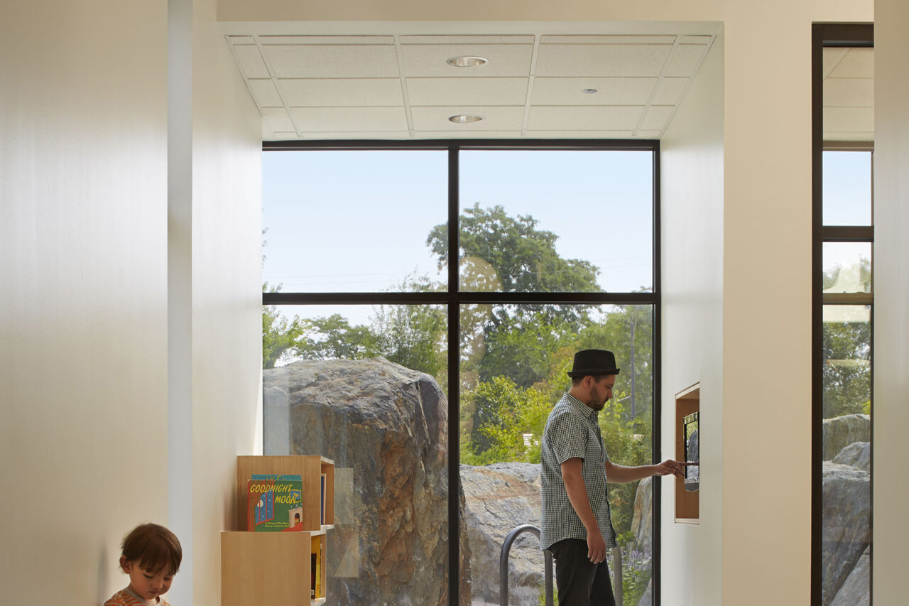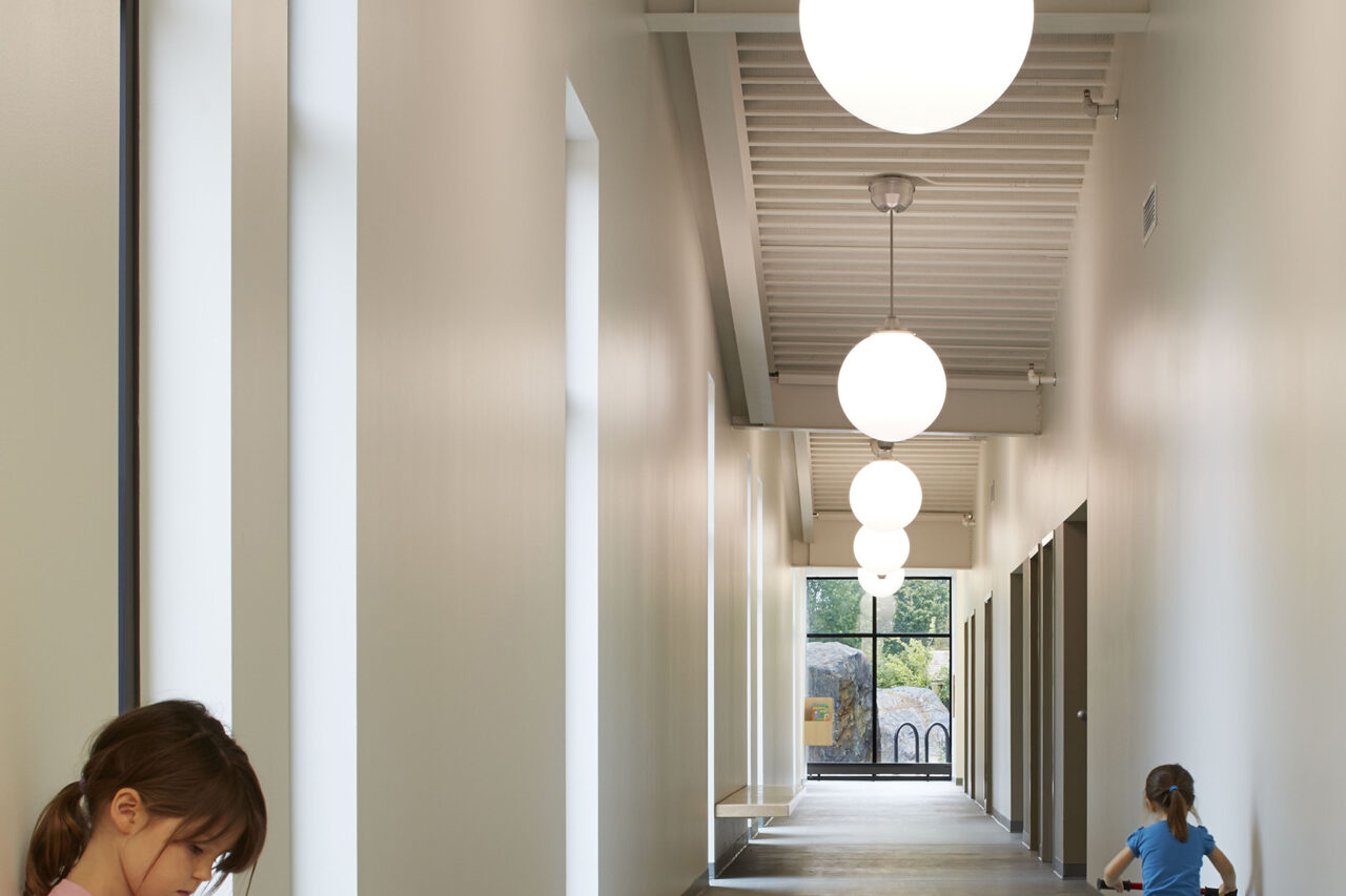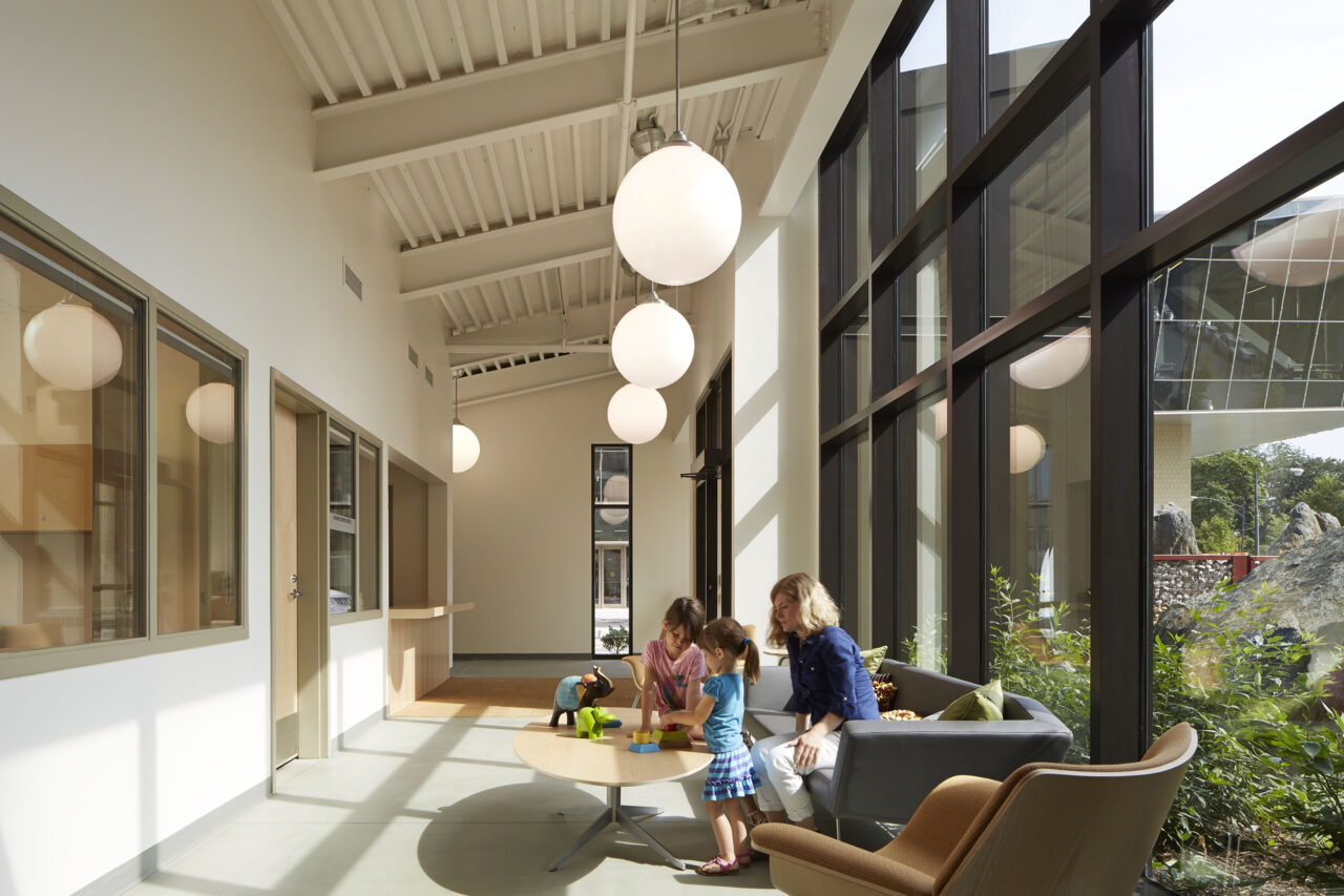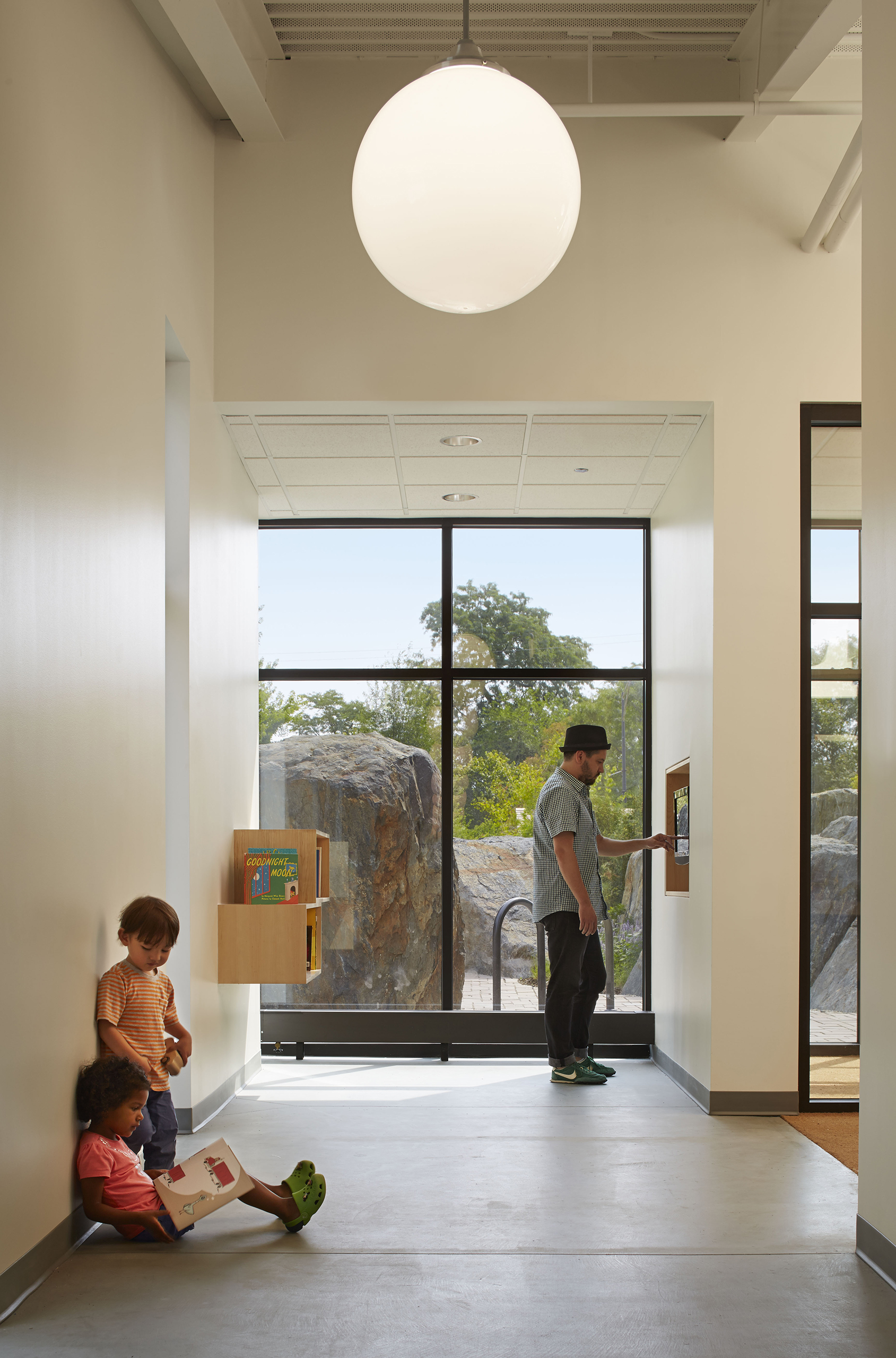 At the heart of the building, an inviting glassy lobby provides a space for guests to enter, parents to converse, and families to drop off their children. Here, a captivating world unfolds before children’s eyes: the natural bark siding gracefully extends inside, inviting nature’s wonders through full-height windows that reveal the east play court adorned with boulders, trees, plants, and natural textures.