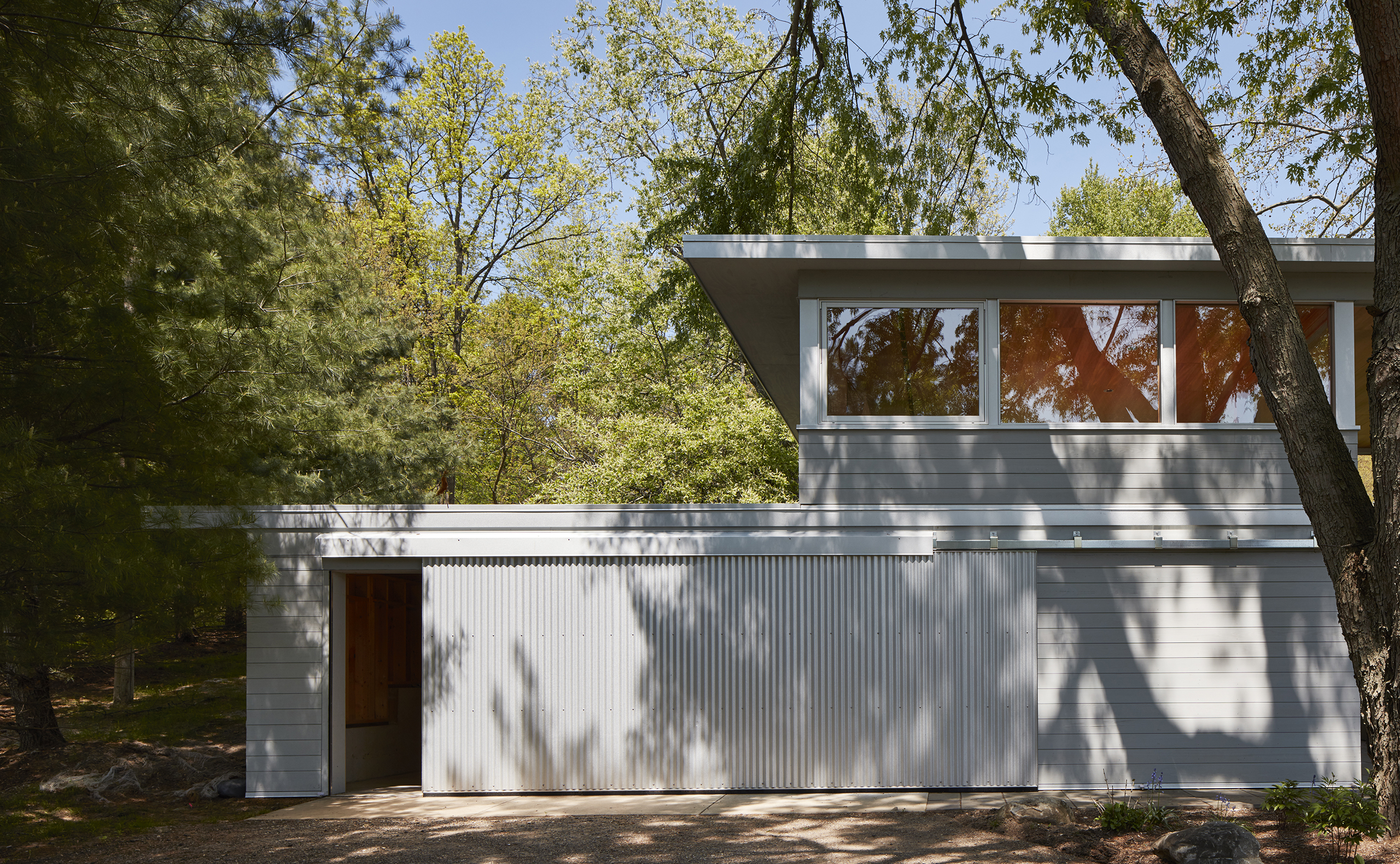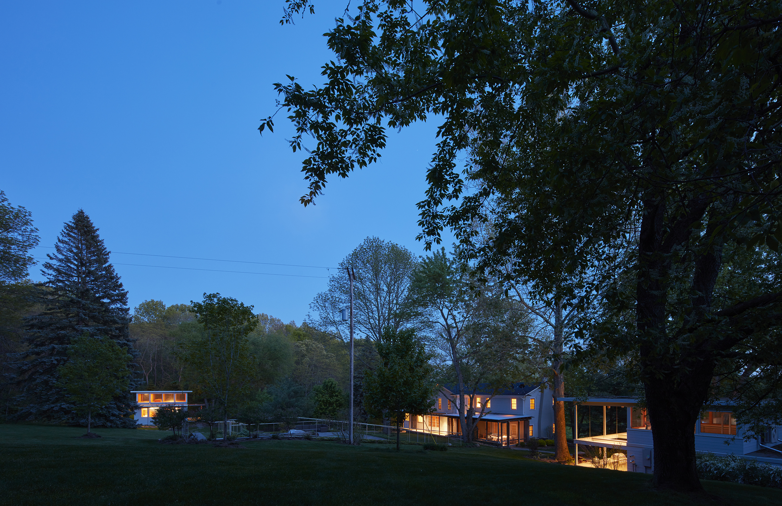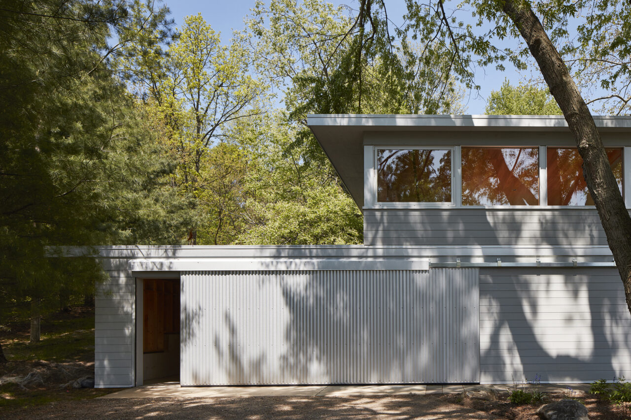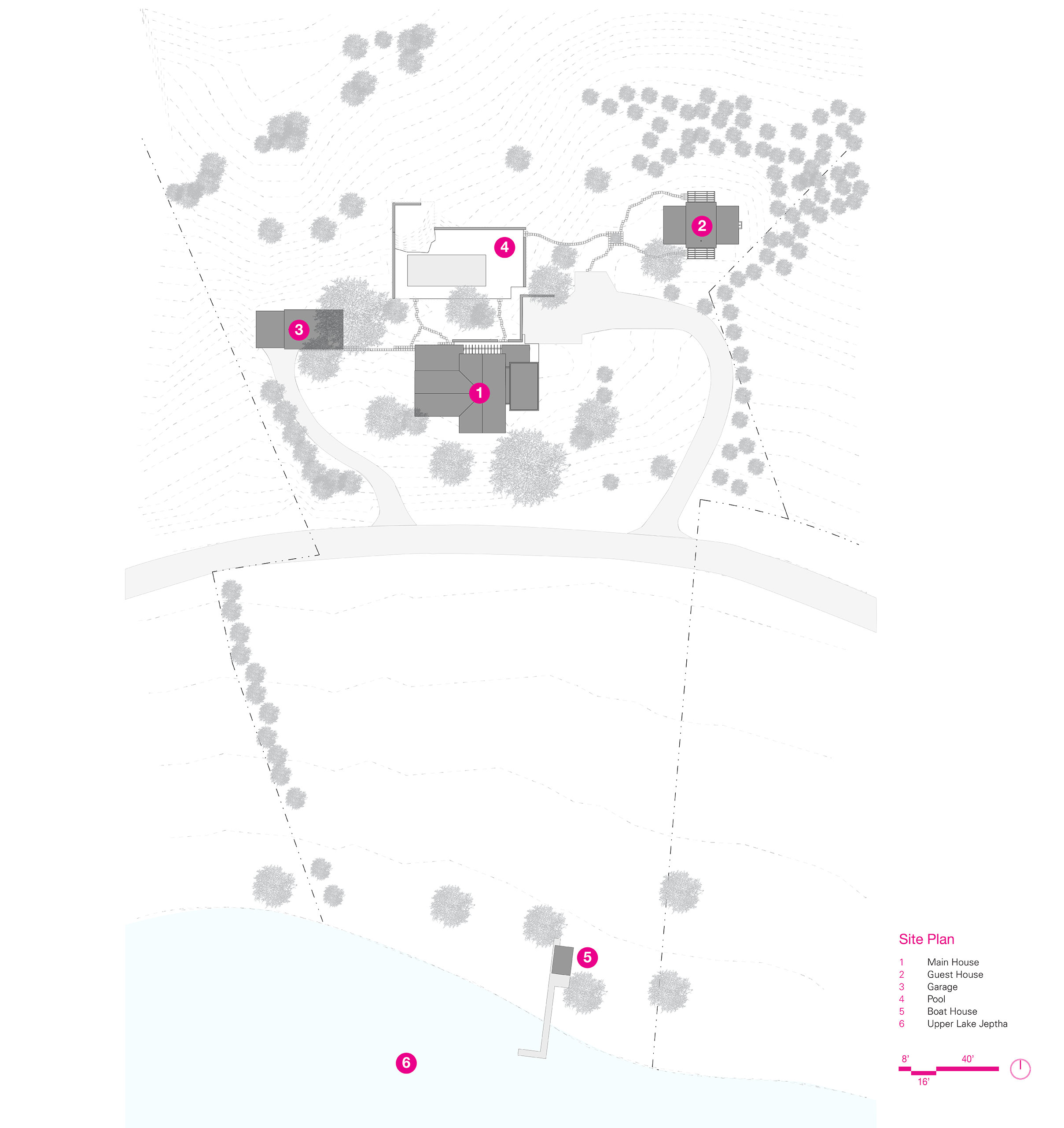 The “just far enough away” Guest House is positioned to contribute to and better frame the family’s exterior social spaces, simultaneously turning and fronting the lake beyond.