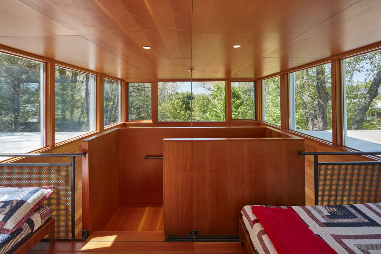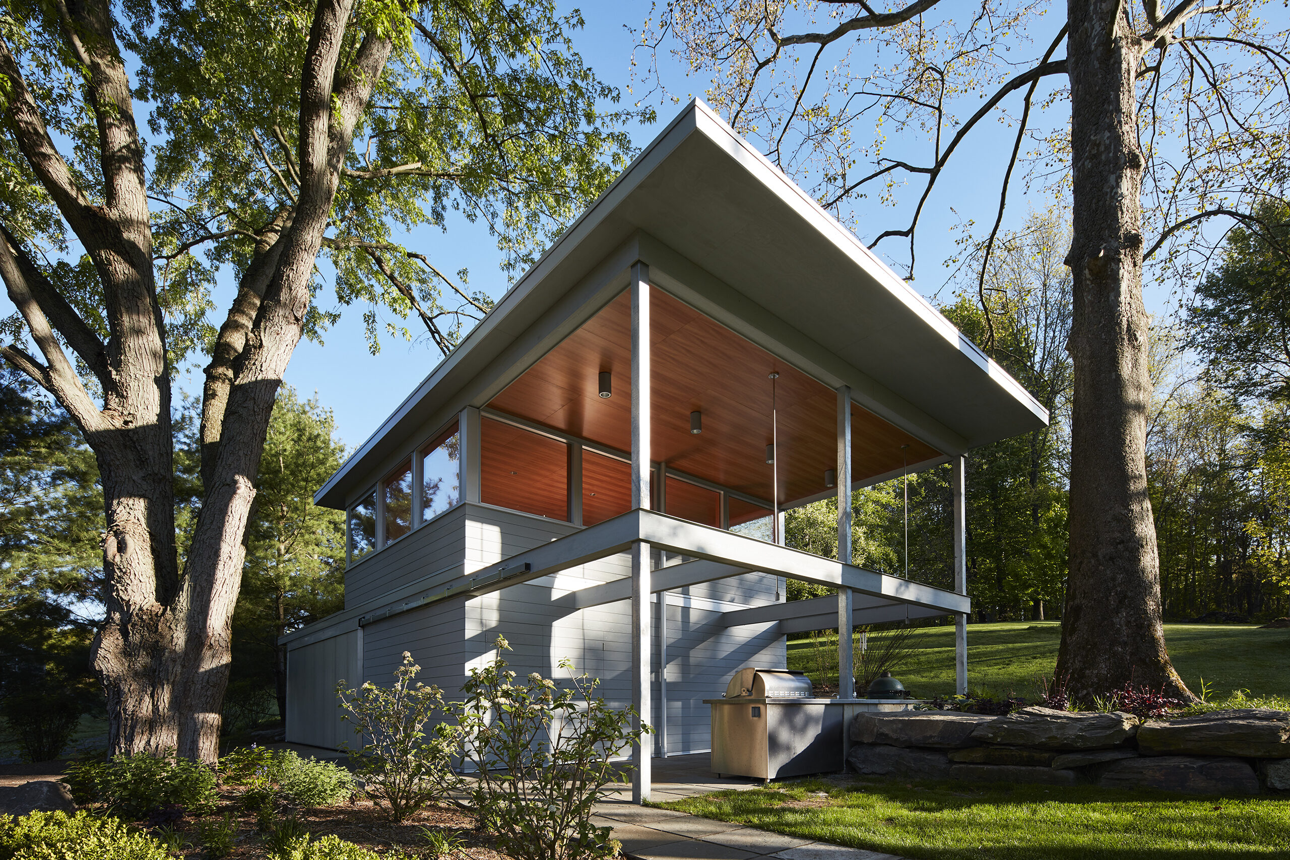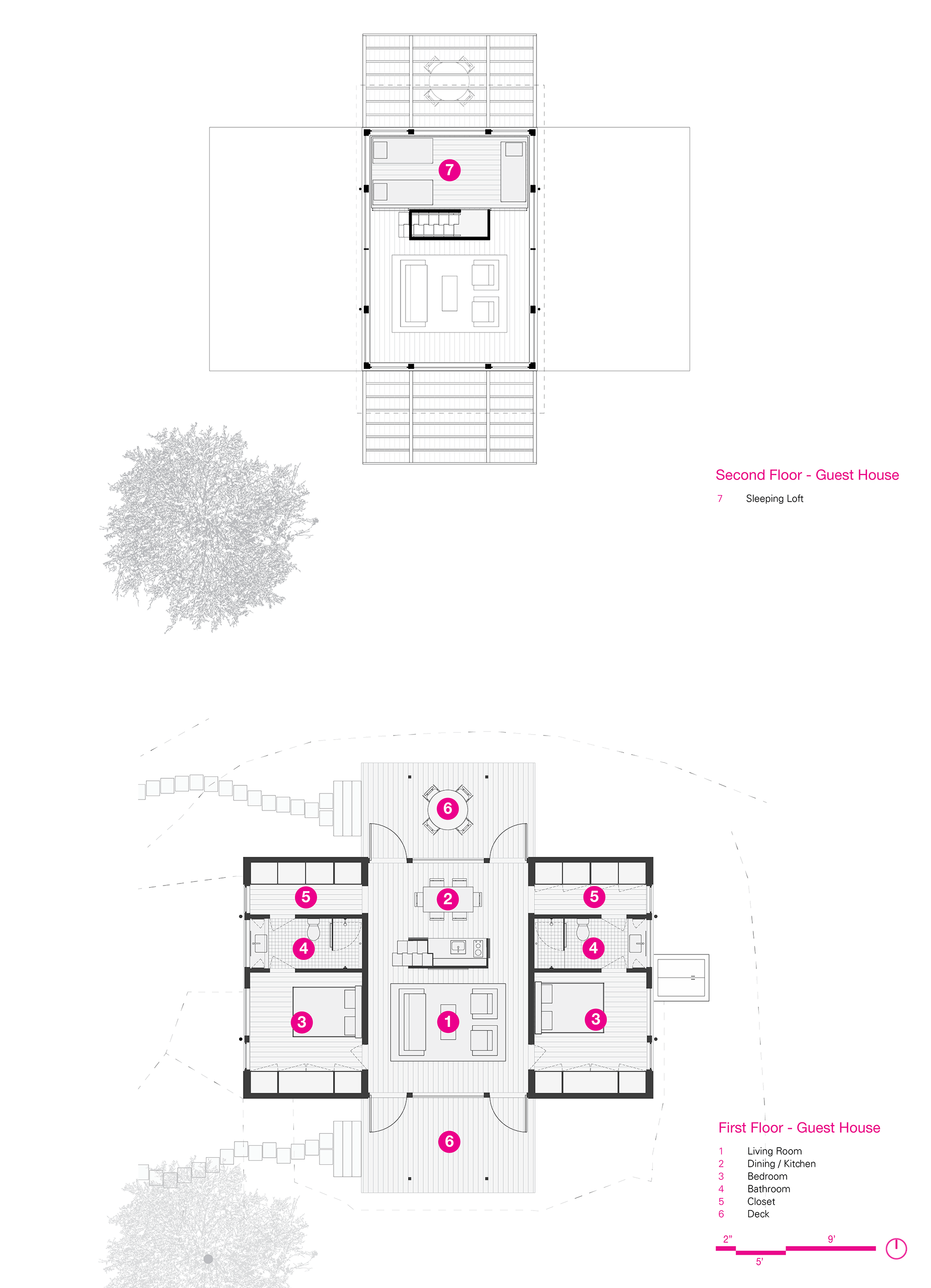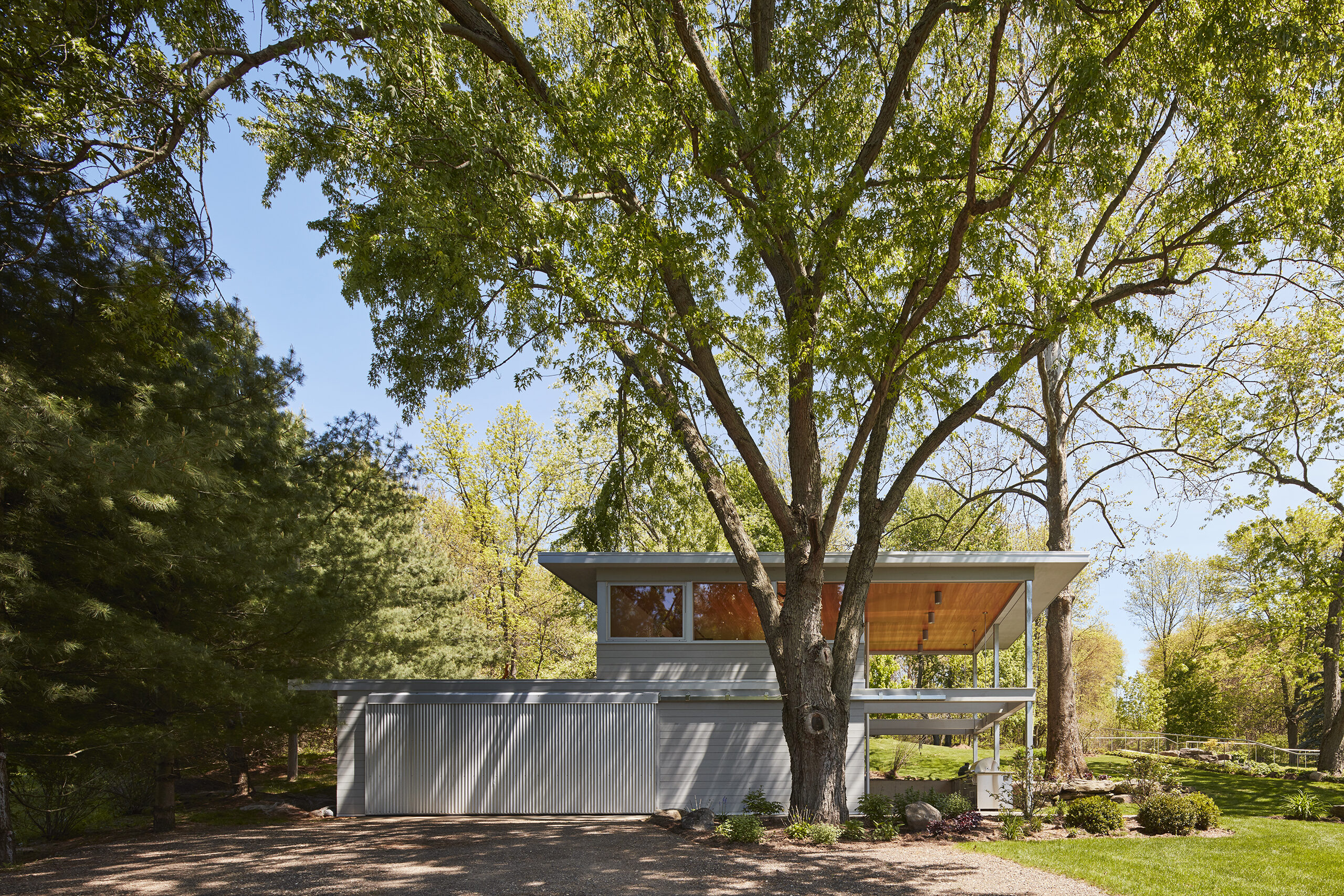 The “just far enough away” Guest House is positioned to contribute to and better frame the family’s exterior social spaces, simultaneously turning and fronting the lake beyond.