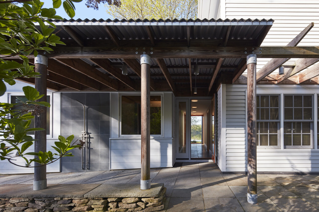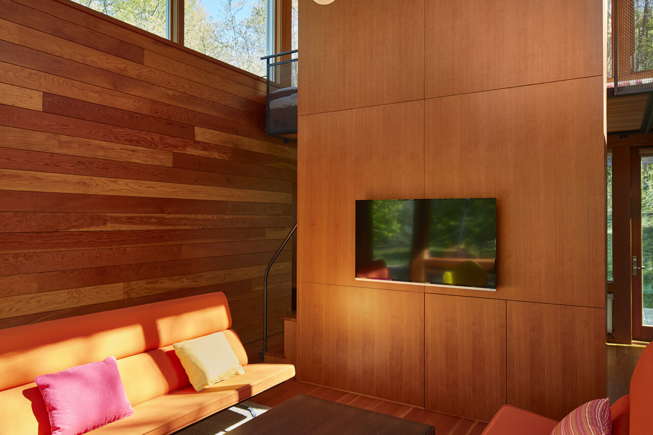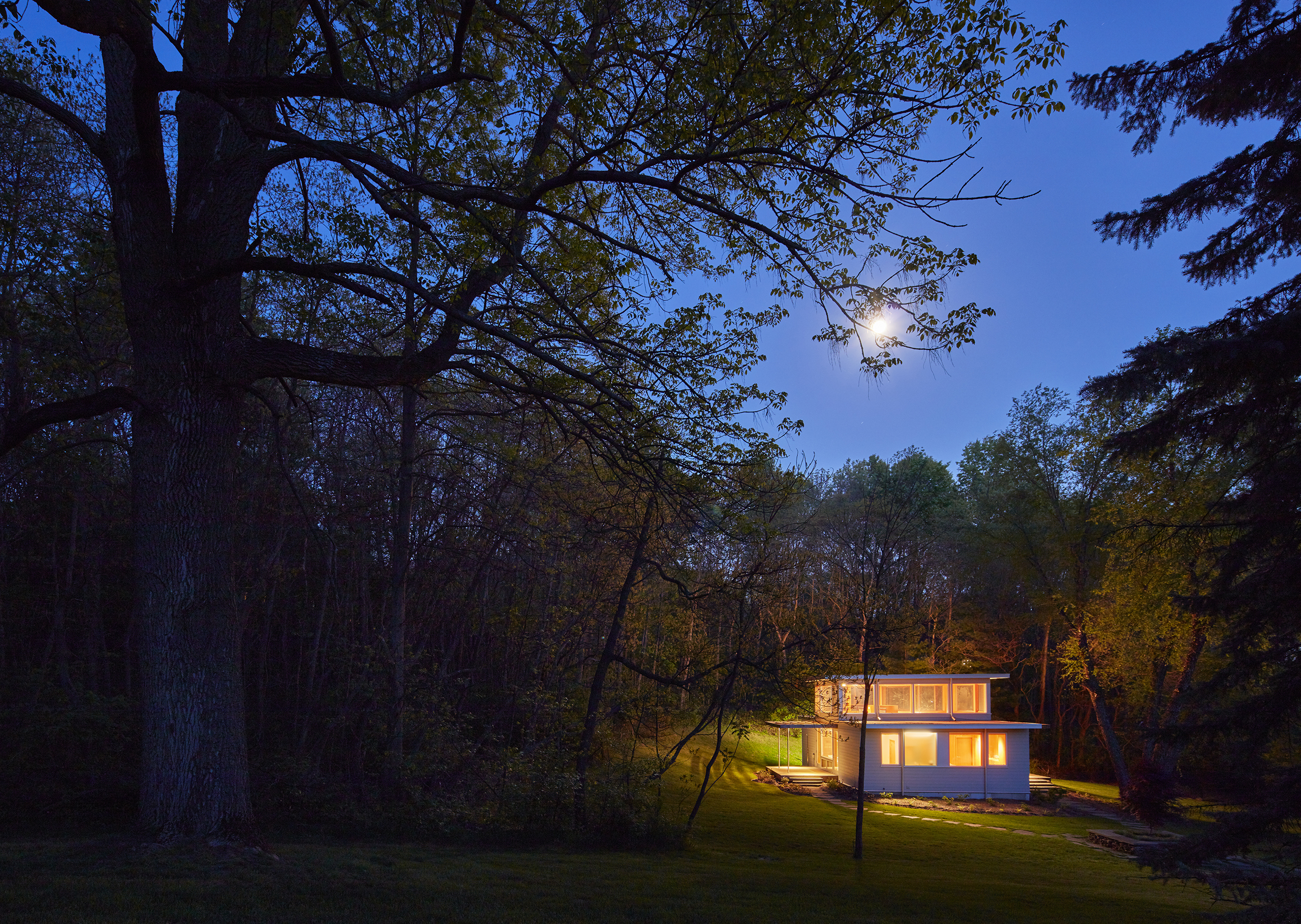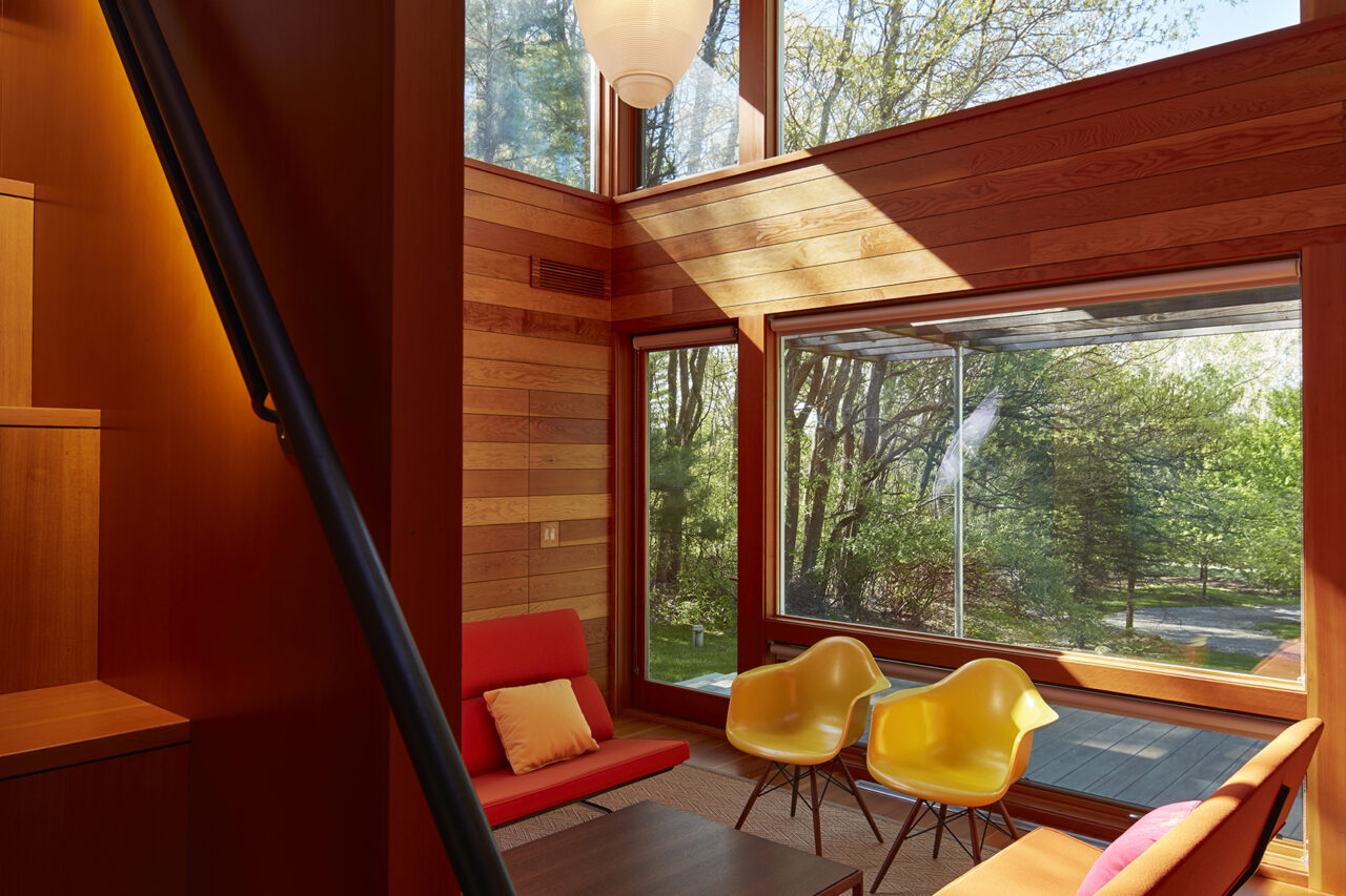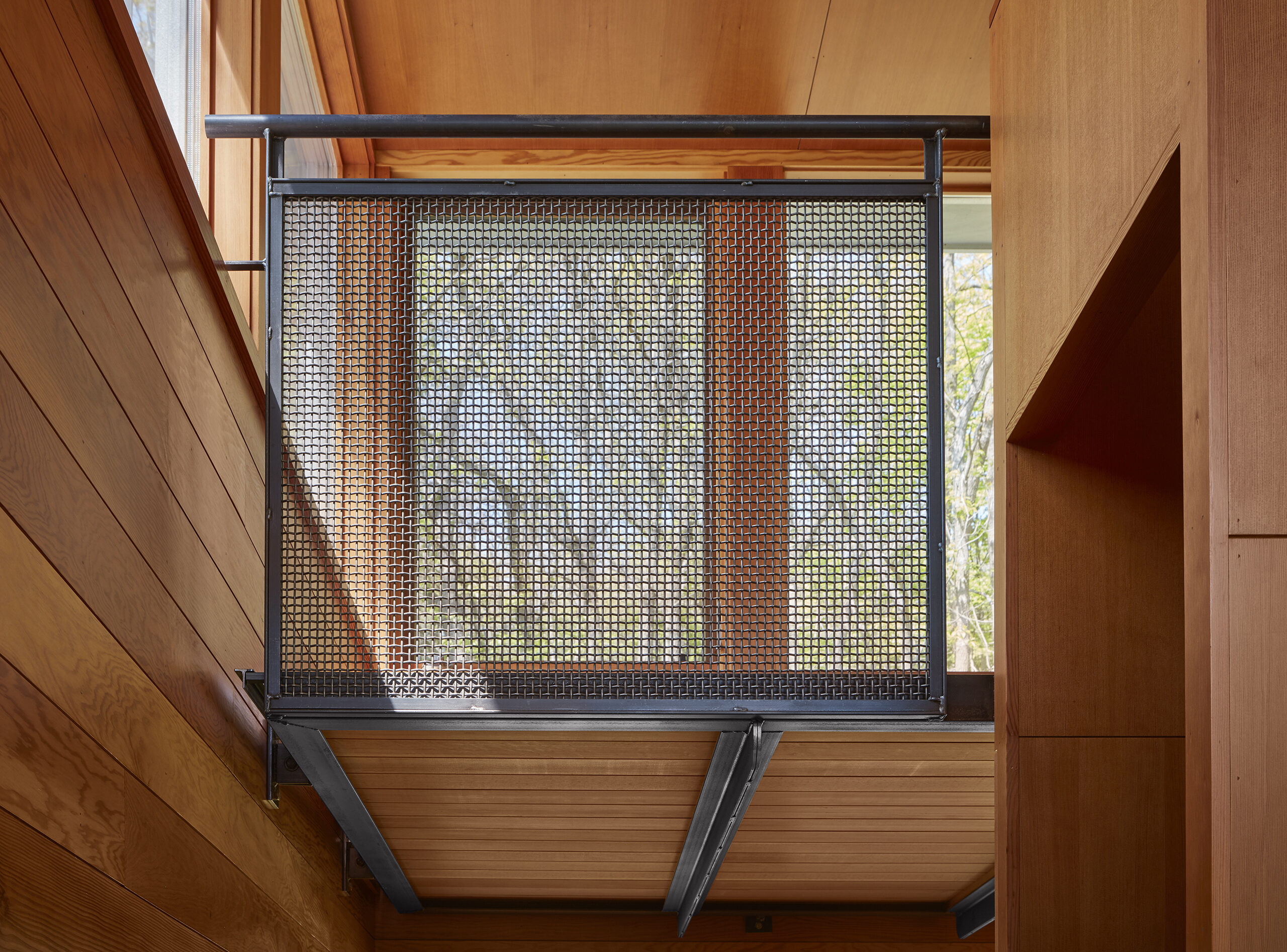The “just far enough away” Guest House is positioned to contribute to and better frame the family’s exterior social spaces, simultaneously turning and fronting the lake beyond.