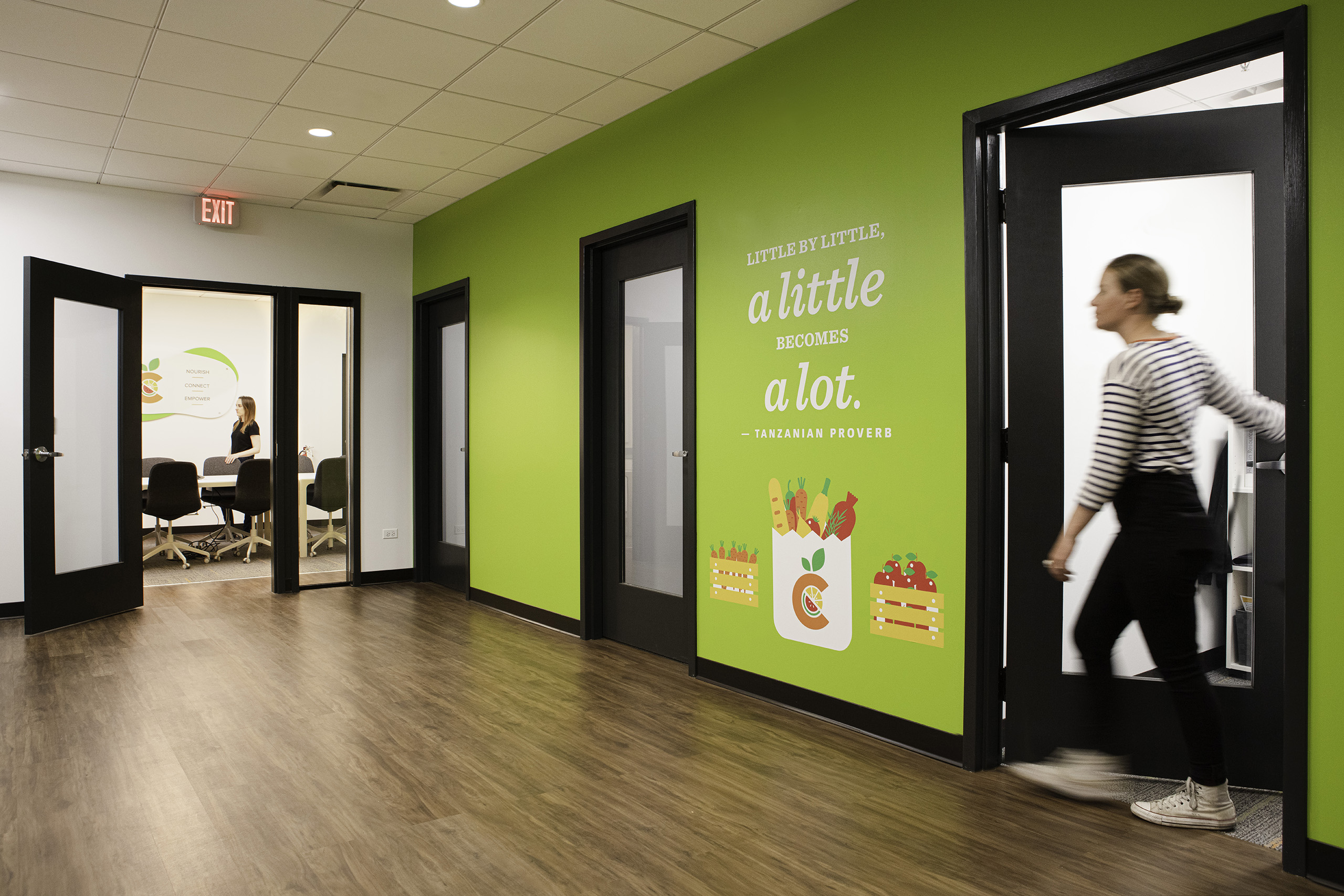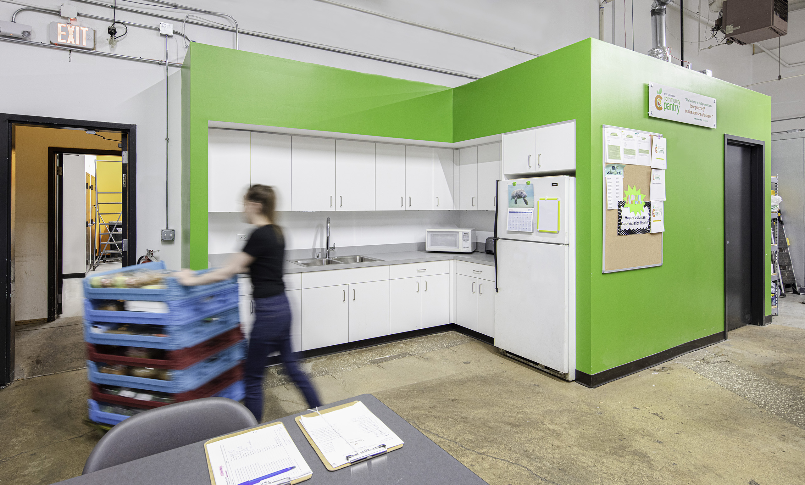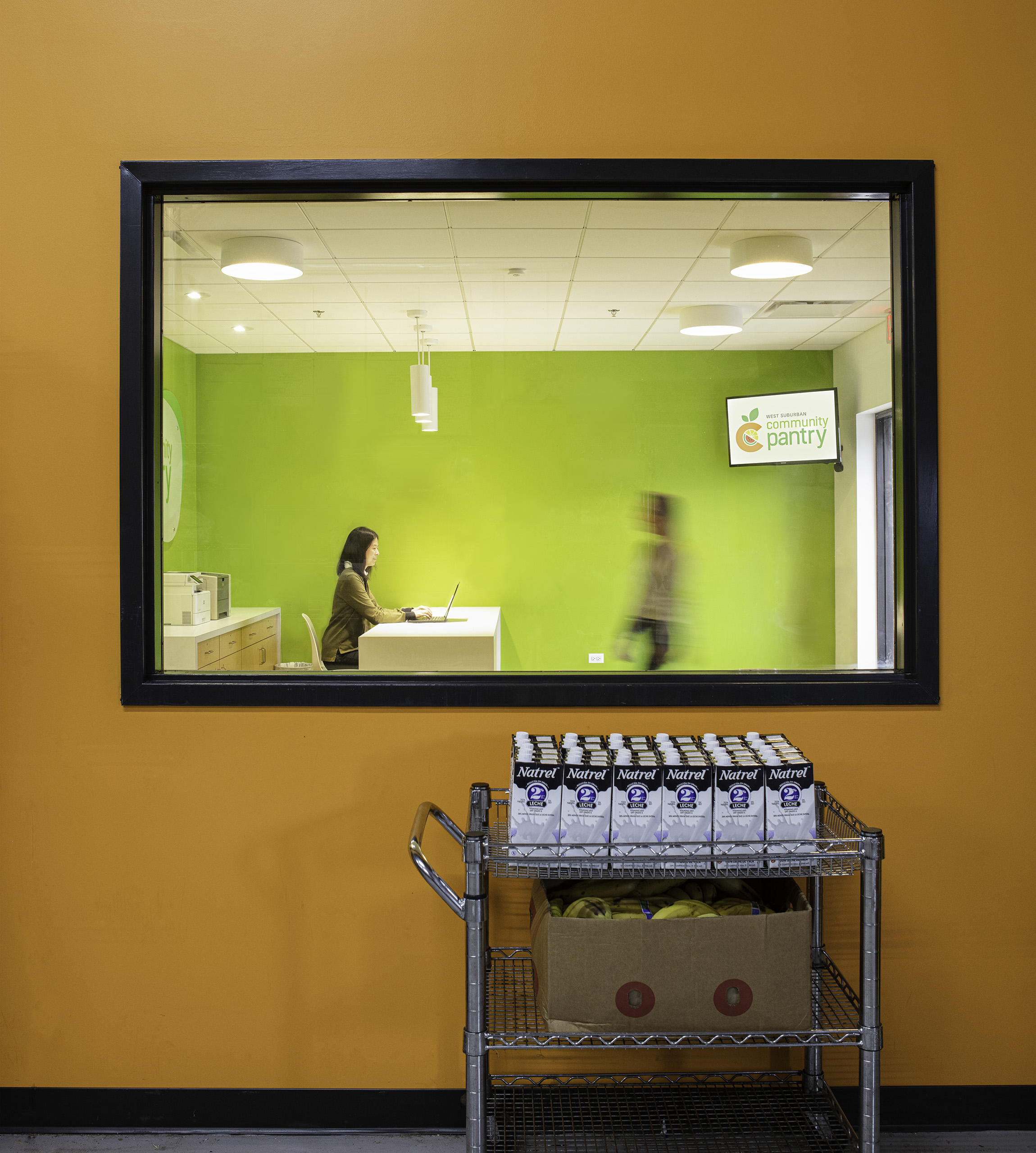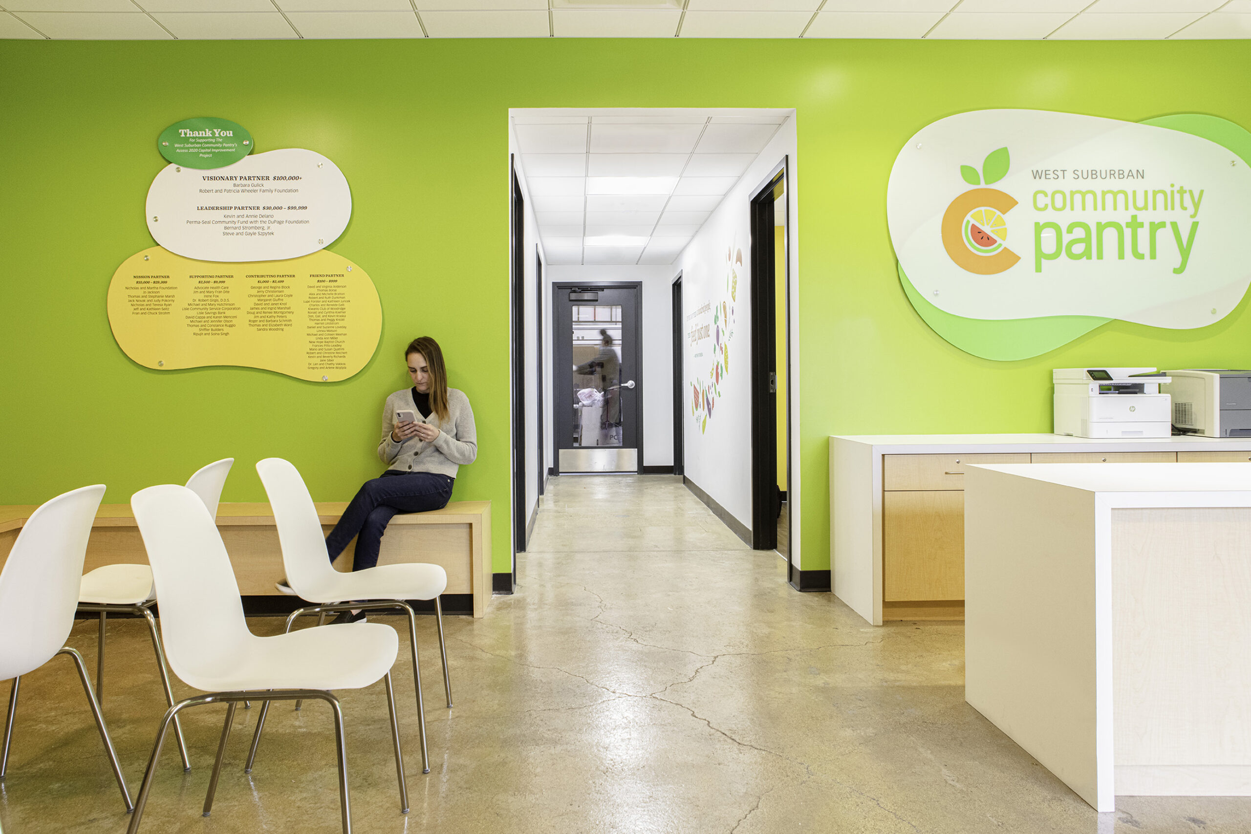 Located in Woodridge, IL, the West Suburban Community Pantry (WSCP) is a client-choice food pantry that replicates a grocery store experience for clients with both in-person shopping, and an online ordering/pick up option. With inefficient layouts, no private waiting areas, and insufficient staff space in their two storefront spaces, the organization had no room to grow, prompting the decision to renovate.