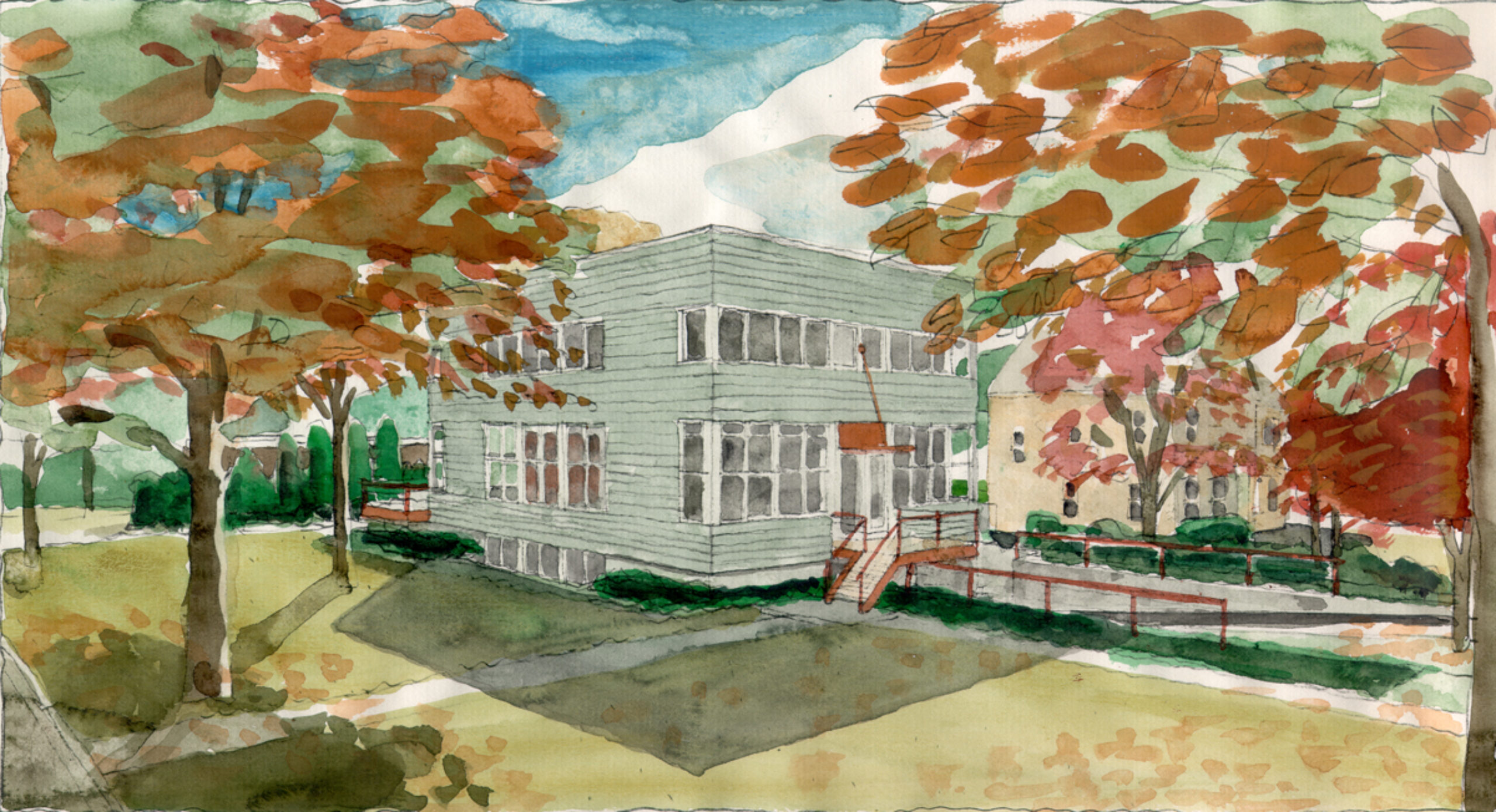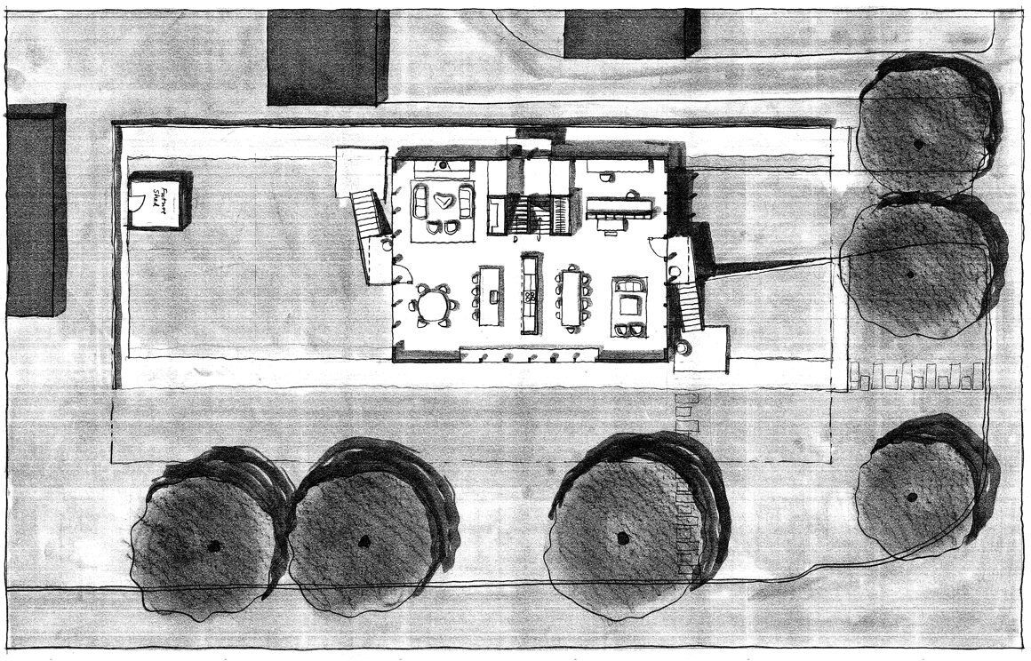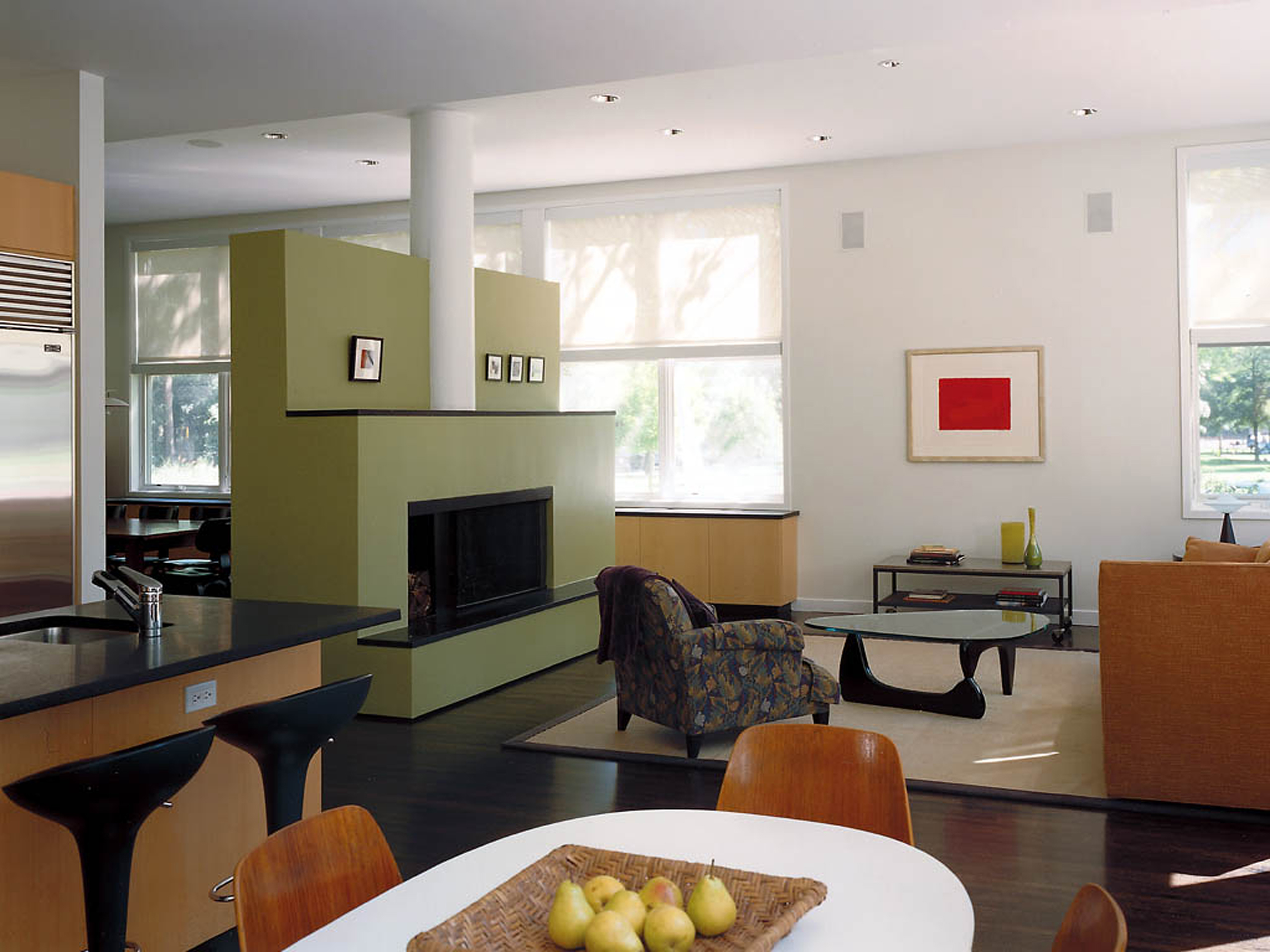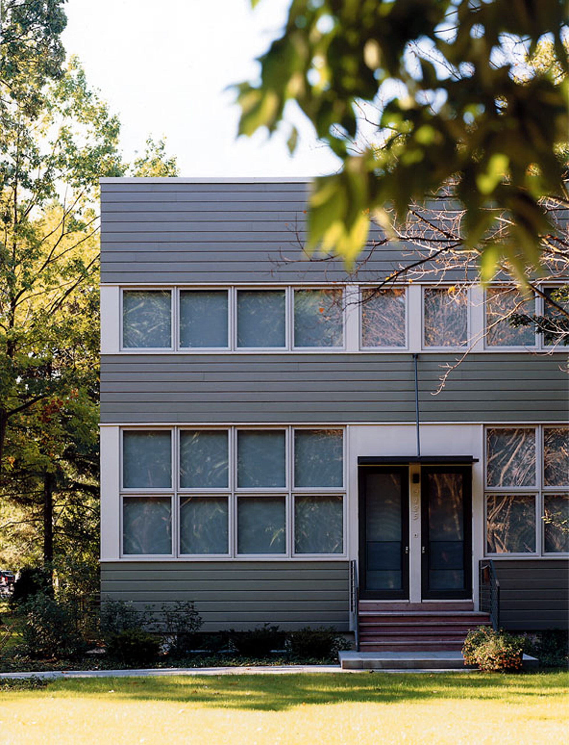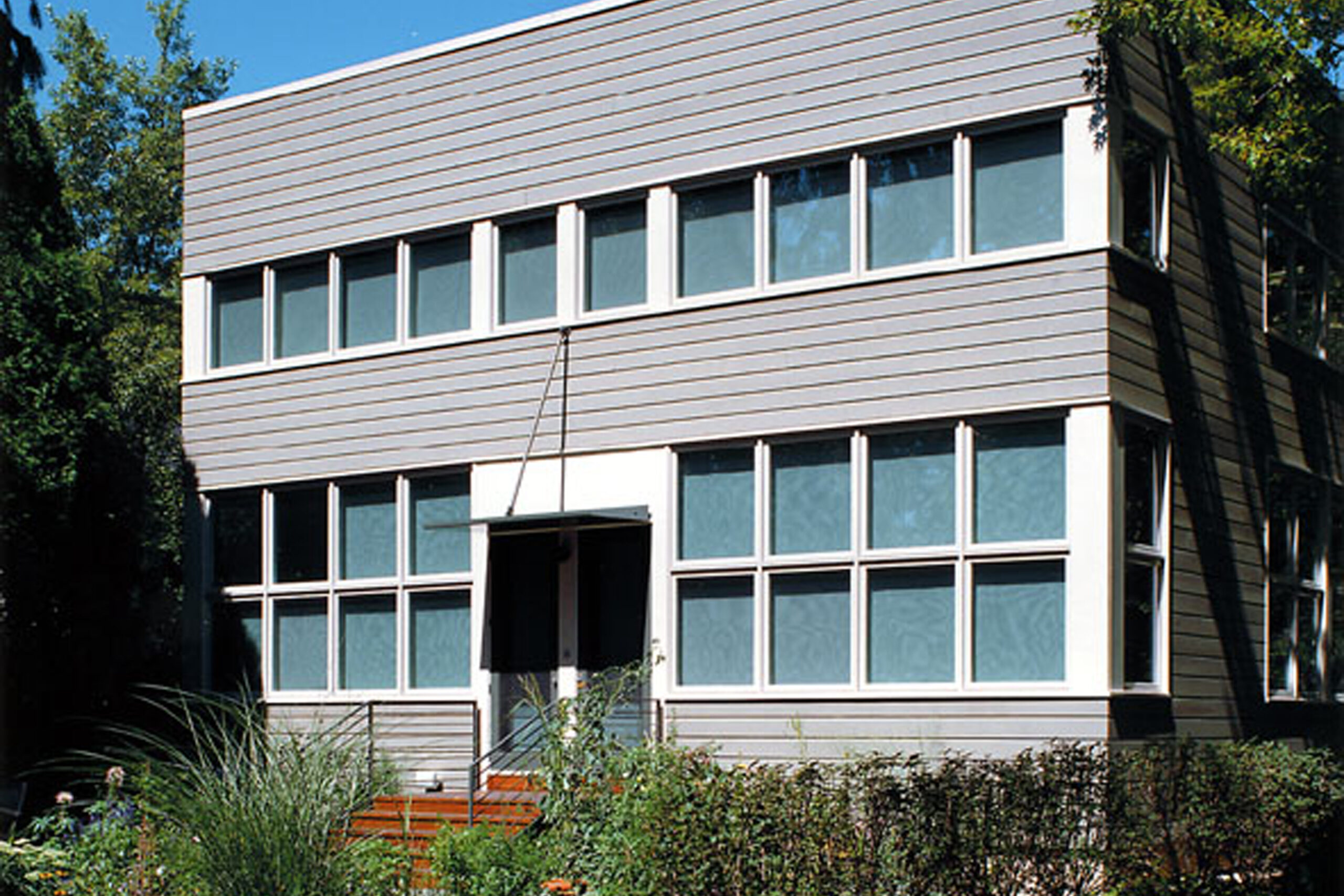 A new two story residence fronts onto a 10-acre park amongst mature oak trees. The taut, stained cedar facade is marked by ribbons of windows that have generous northern, eastern, and southern exposures.